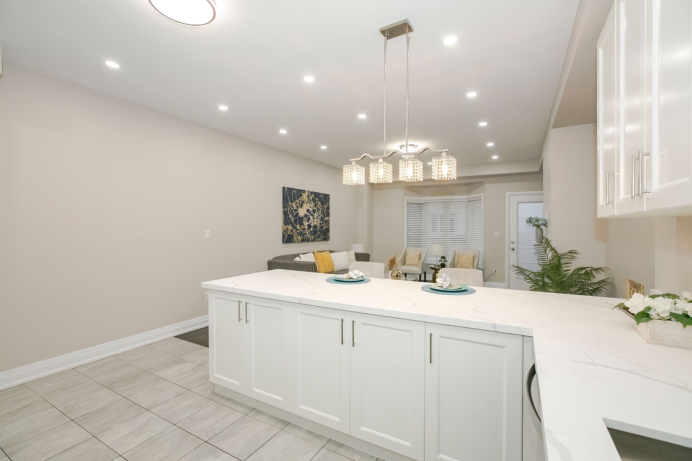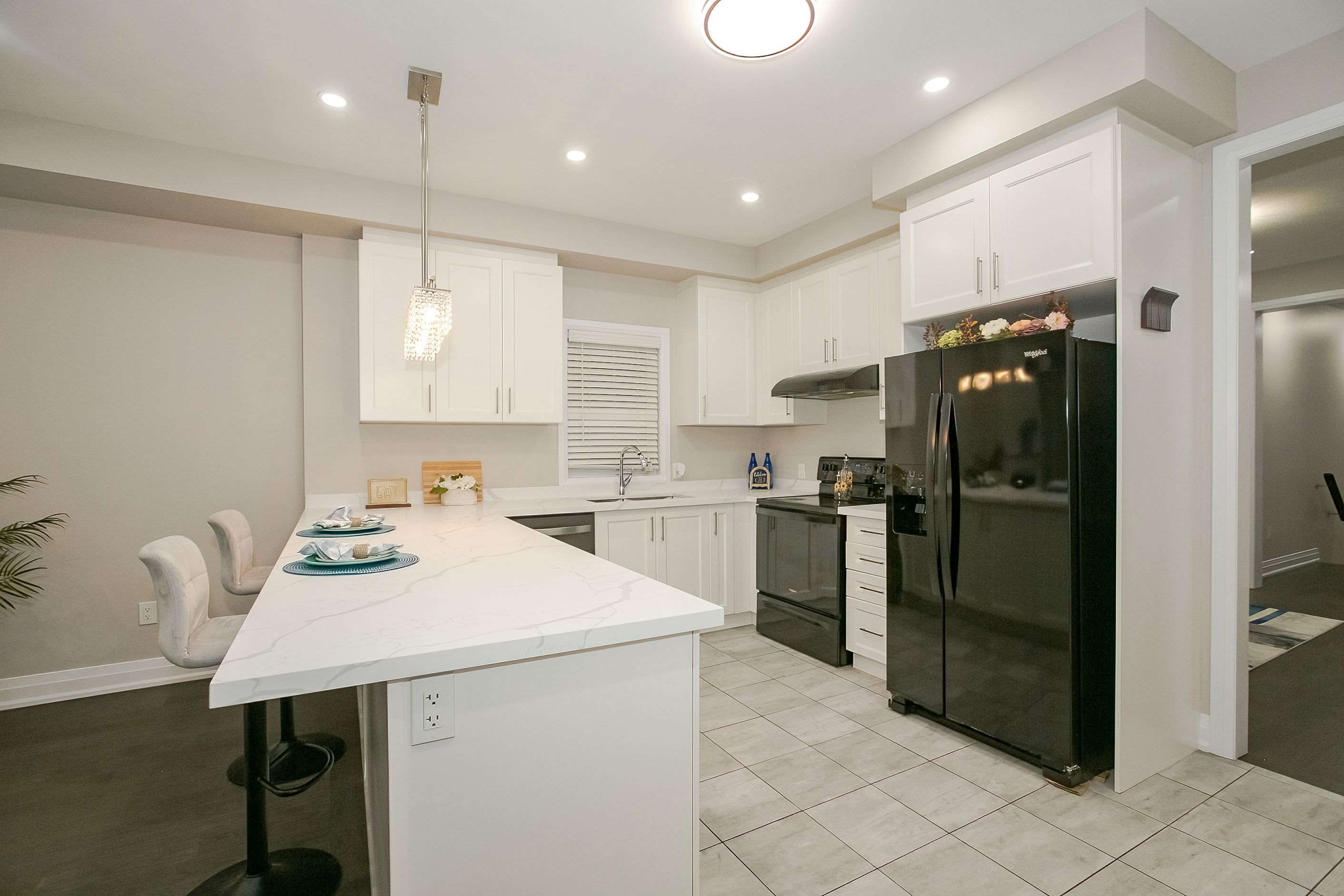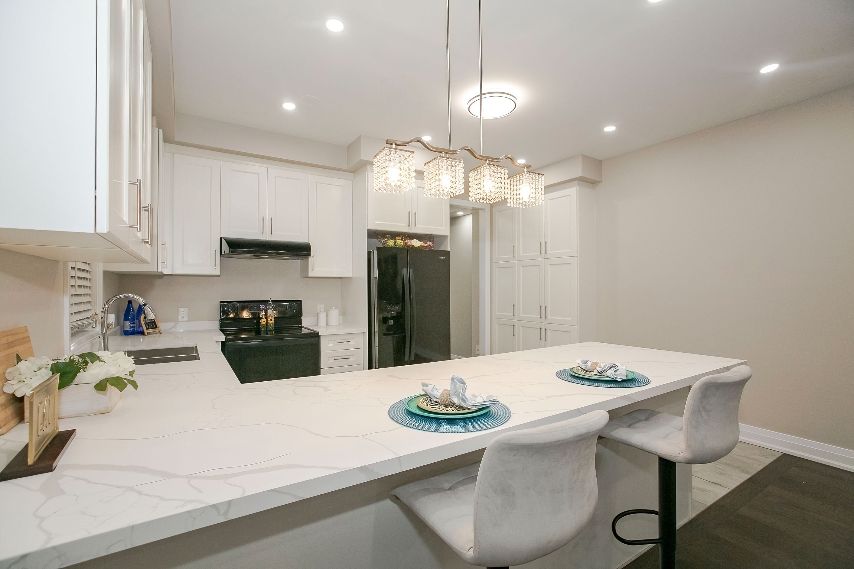 • Modern kitchen with quartz countertops and upgraded appliances for convenience.