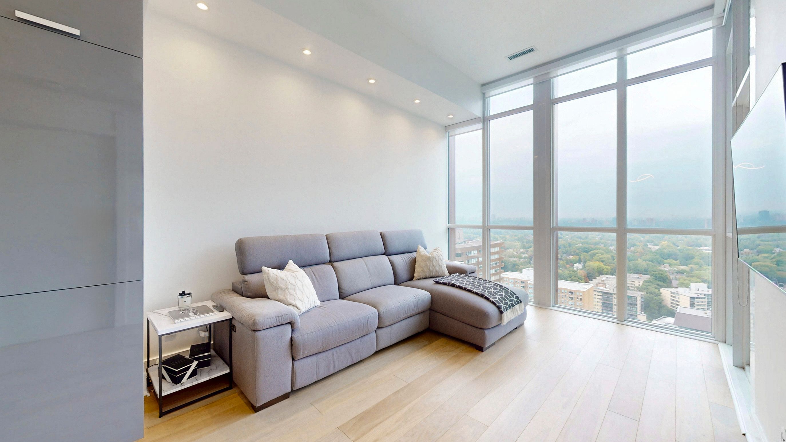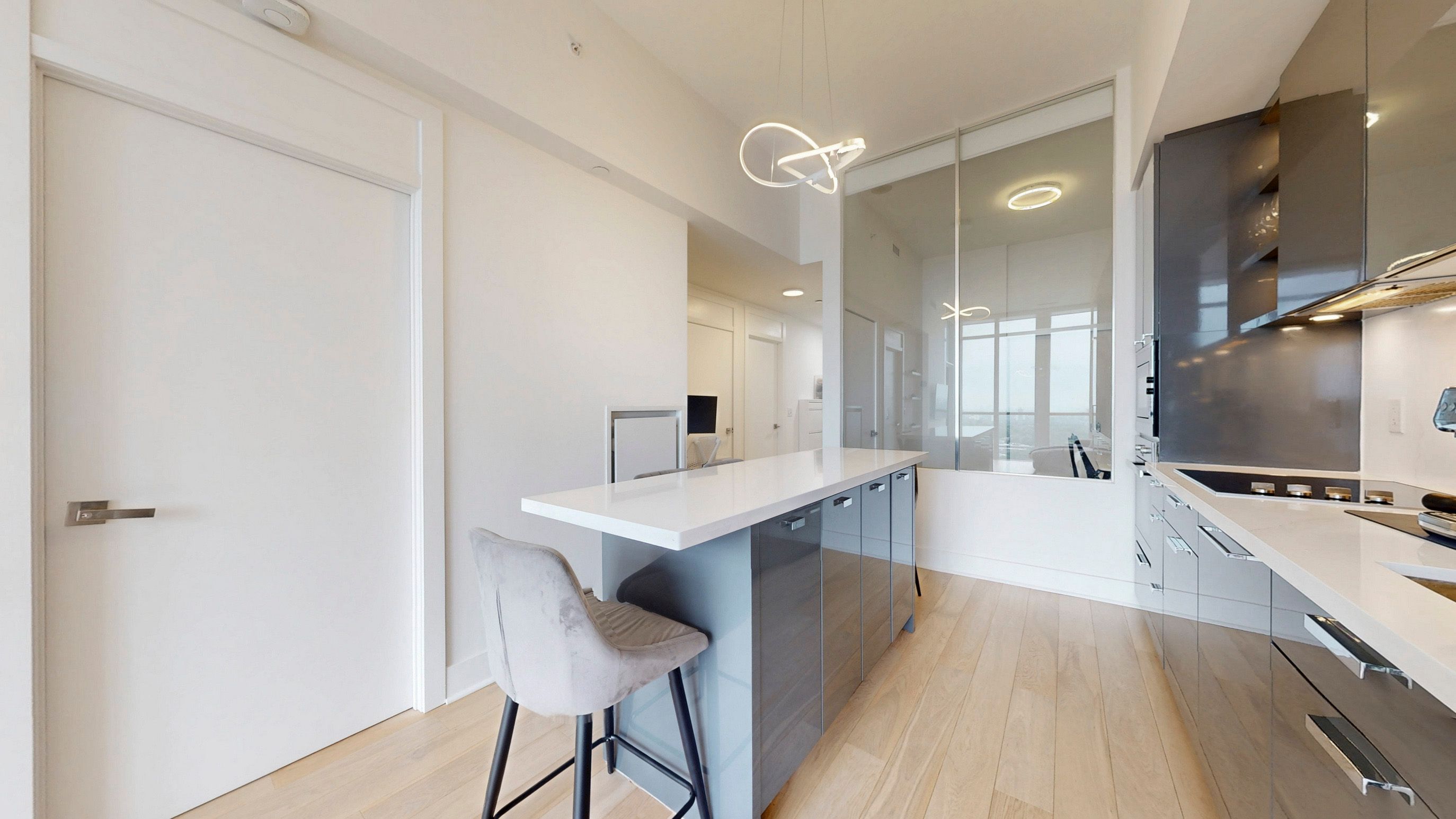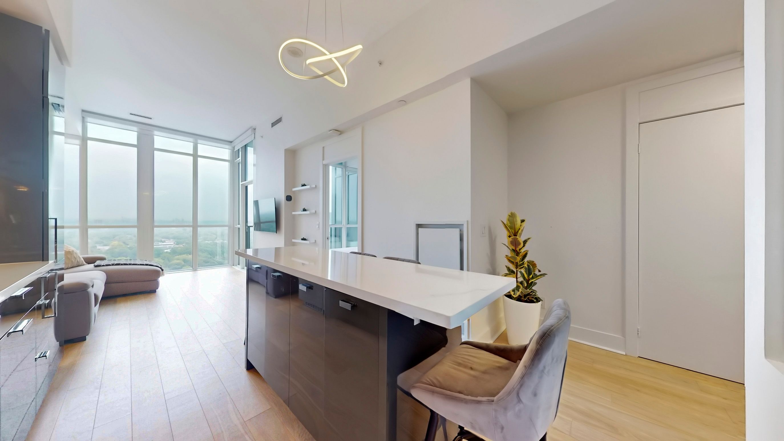 • Bright 2-bedroom suite with high ceilings and large windows for natural light.