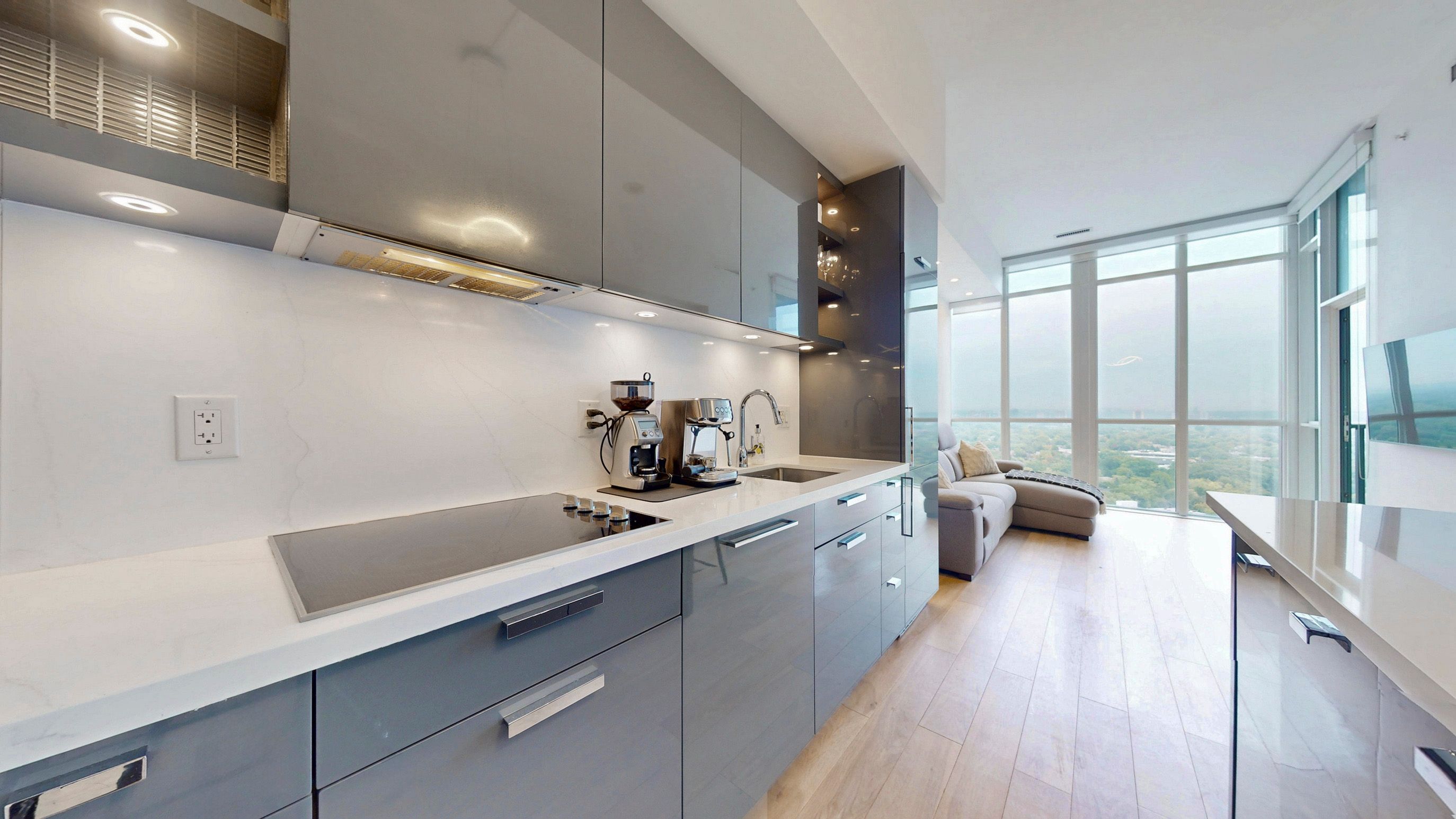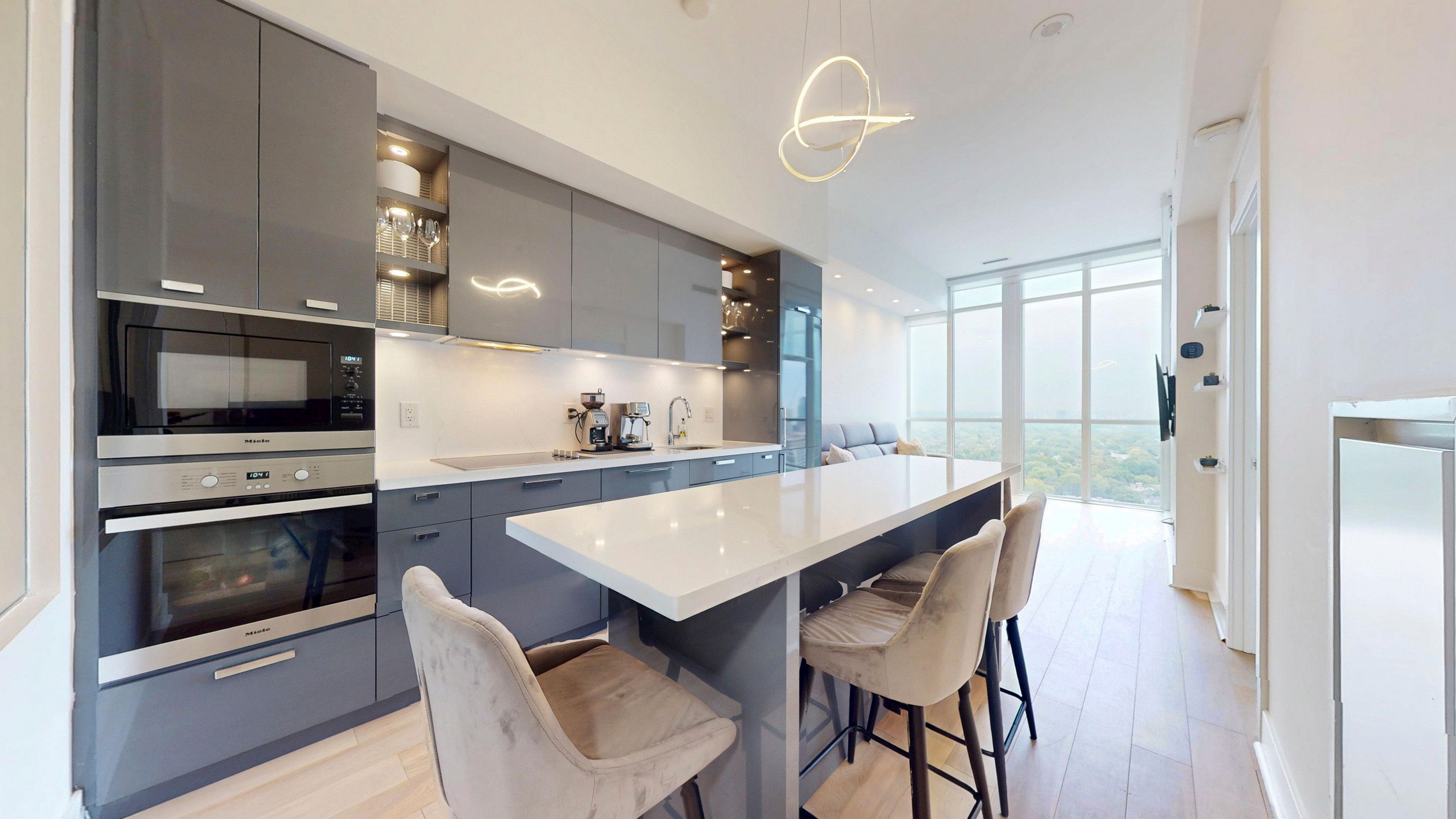• Designer kitchen with high-end appliances and quartz countertops.