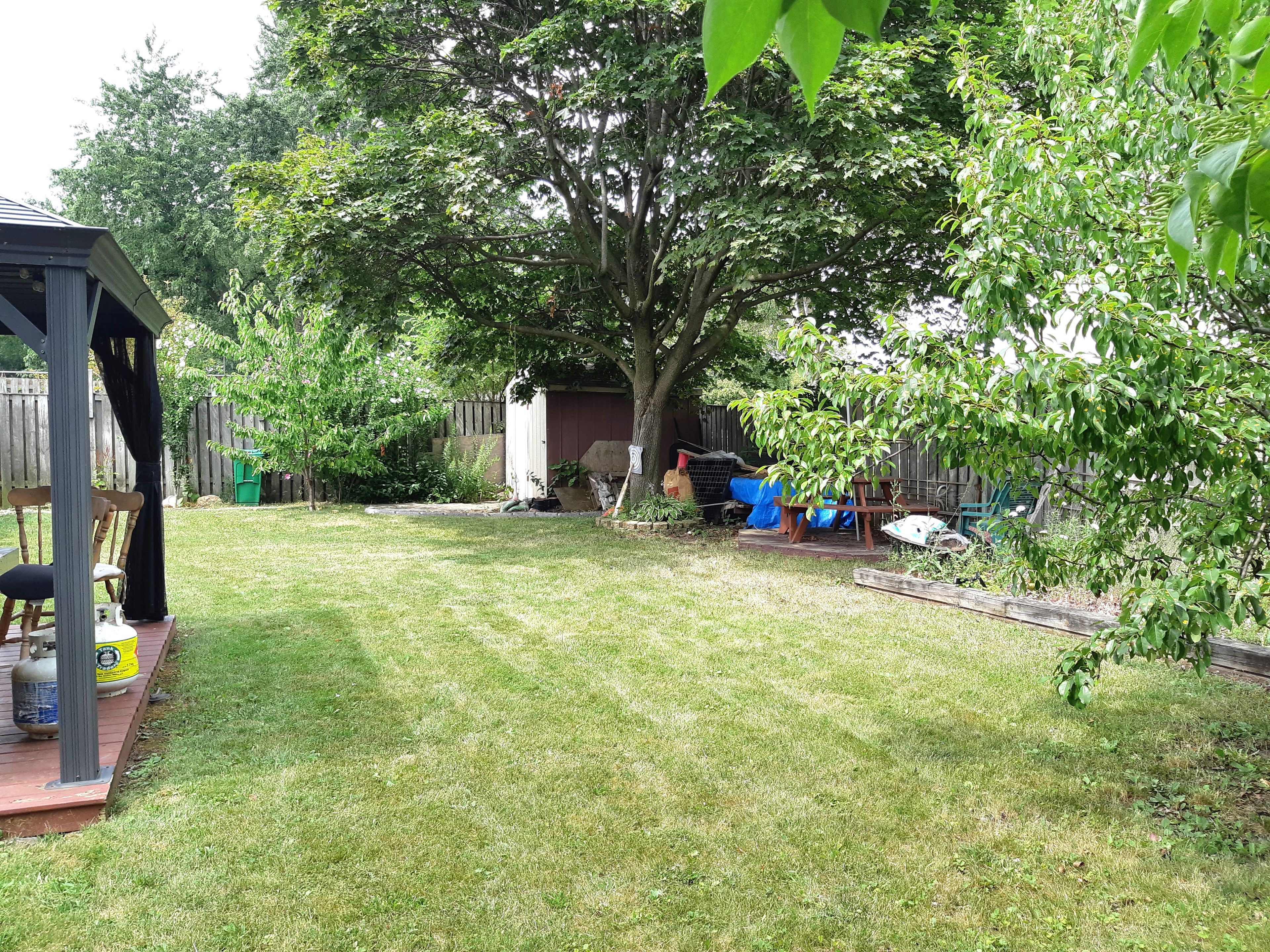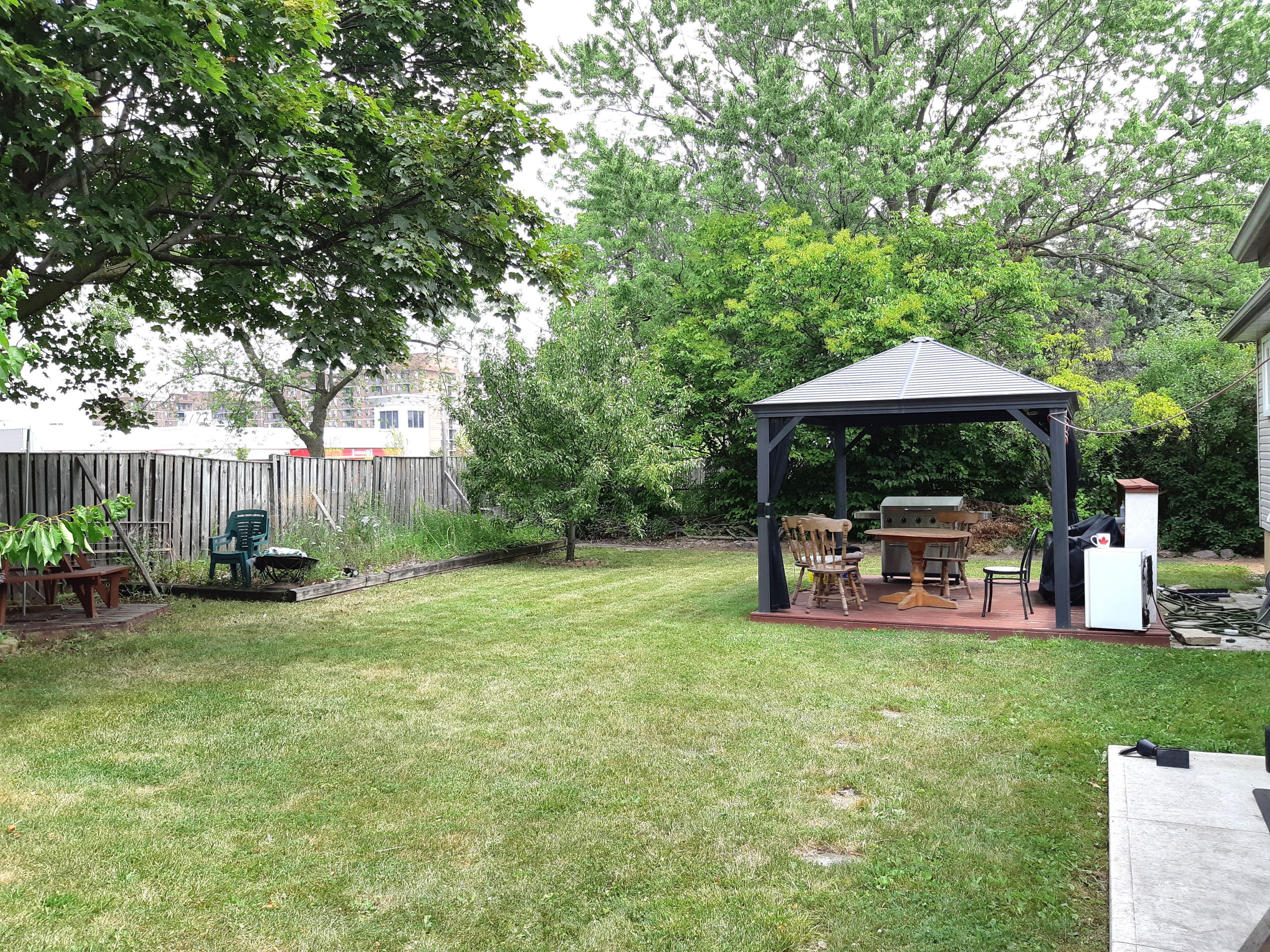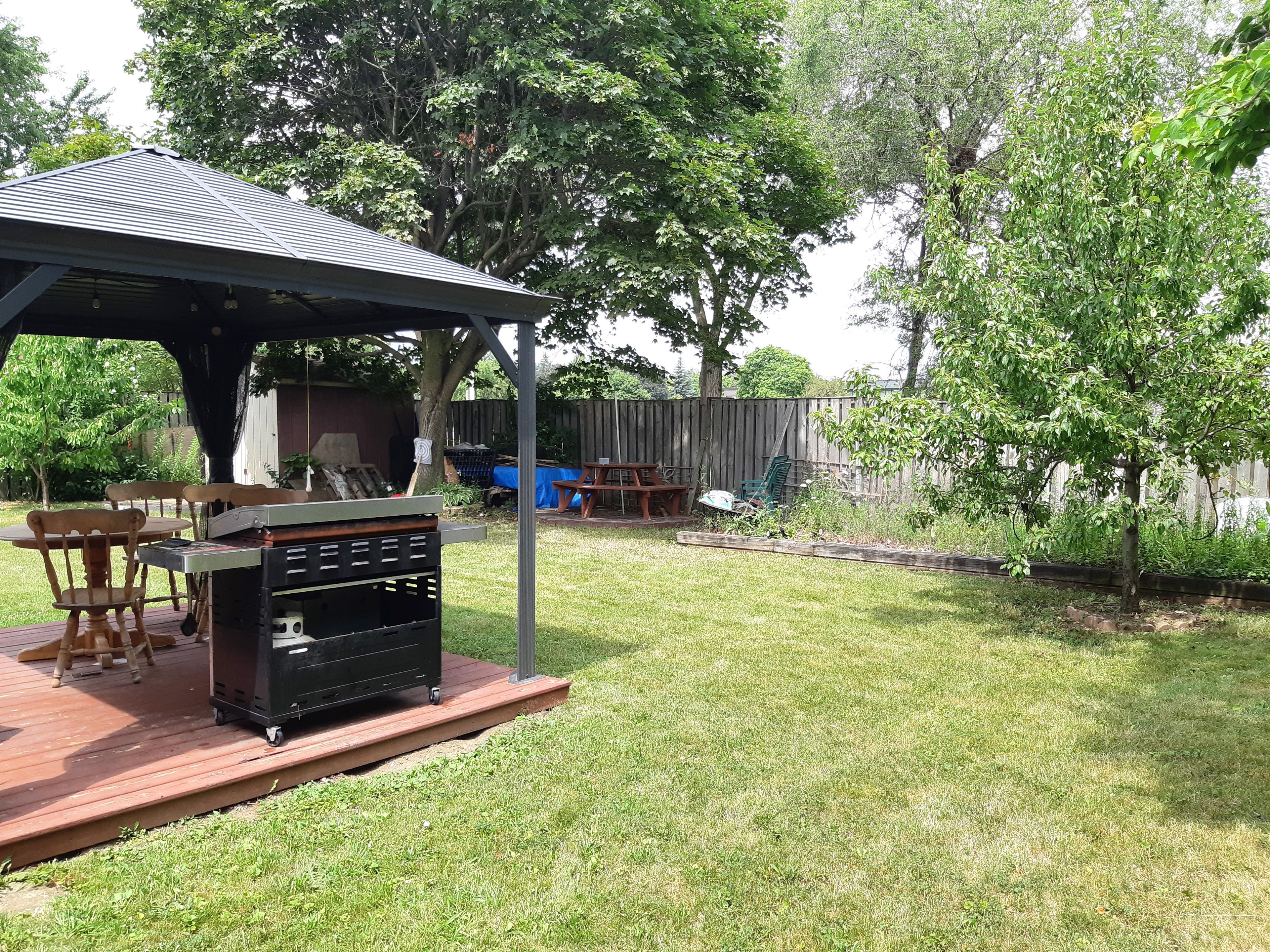 • Large fenced backyard with a vegetable garden and gazebo for outdoor meals.