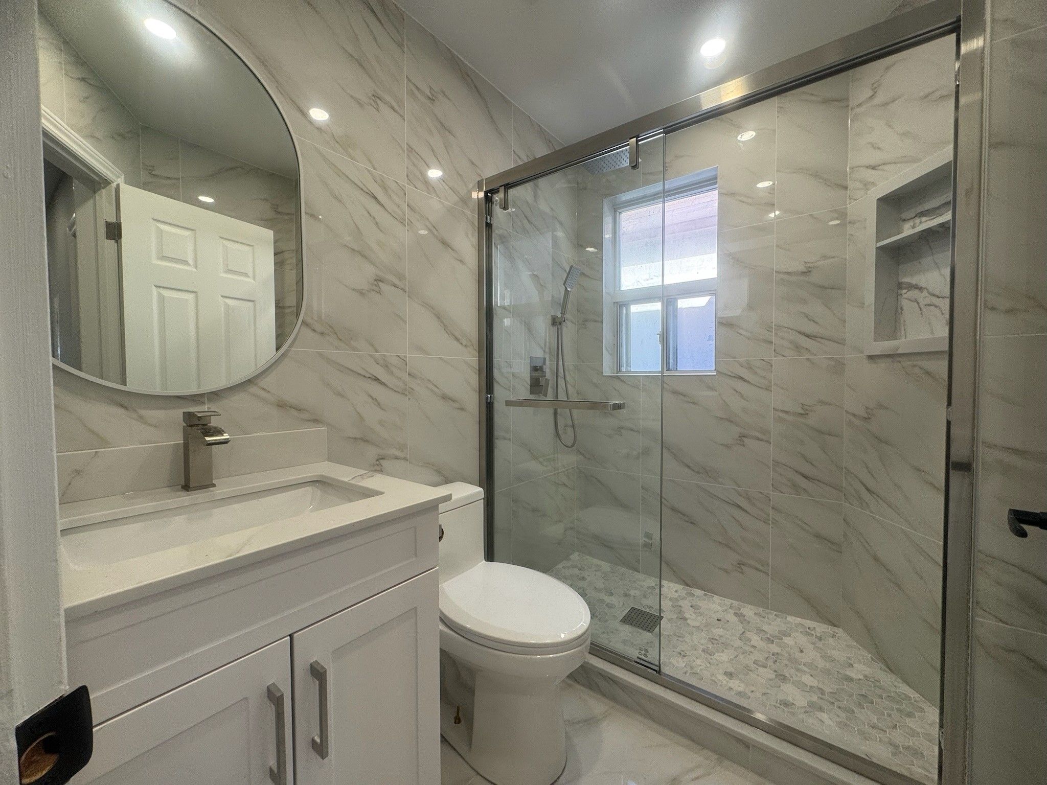 • Stunning bathroom features oversized glass shower and sleek new flooring.
