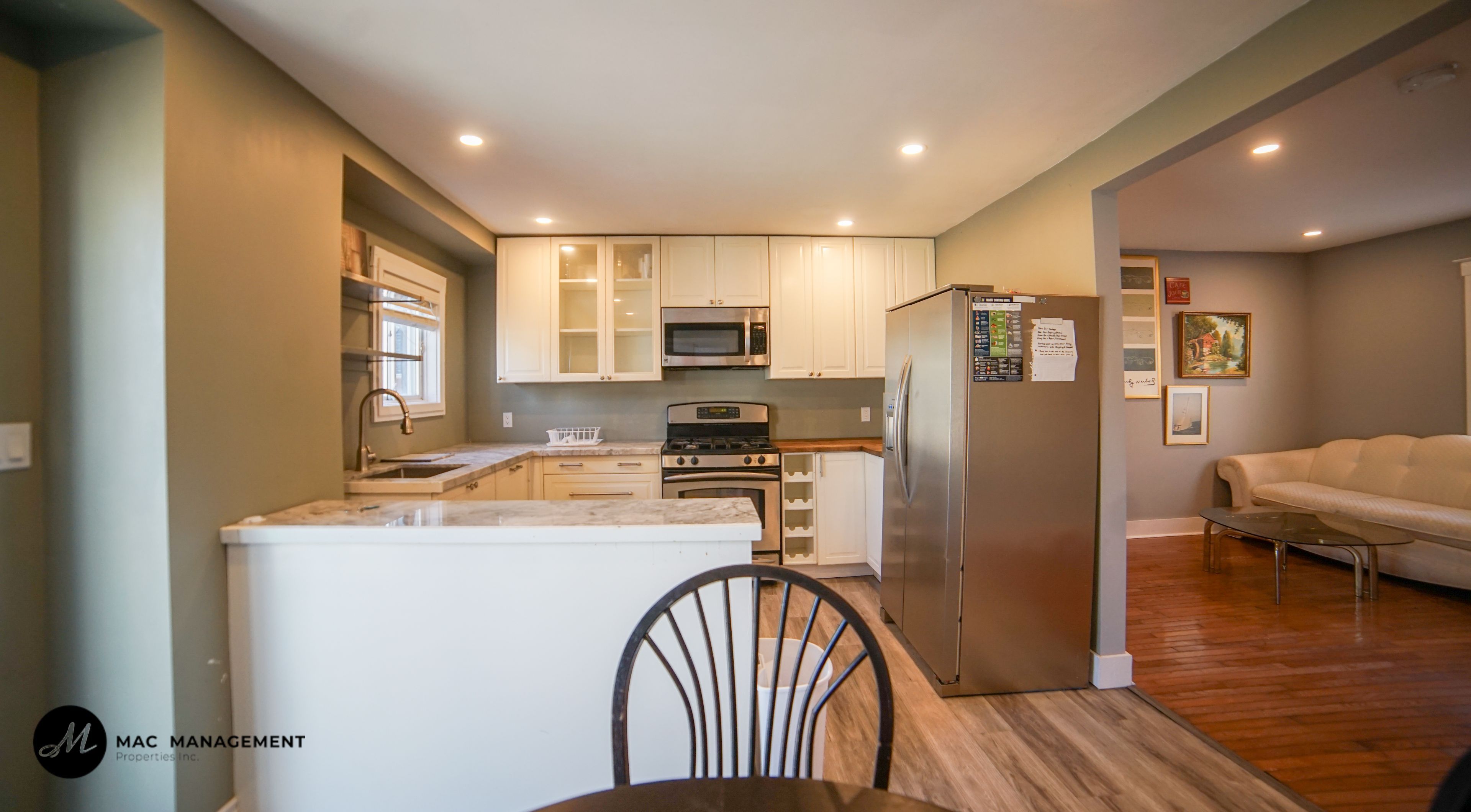 • Bright kitchen with stainless steel appliances for easy cooking.