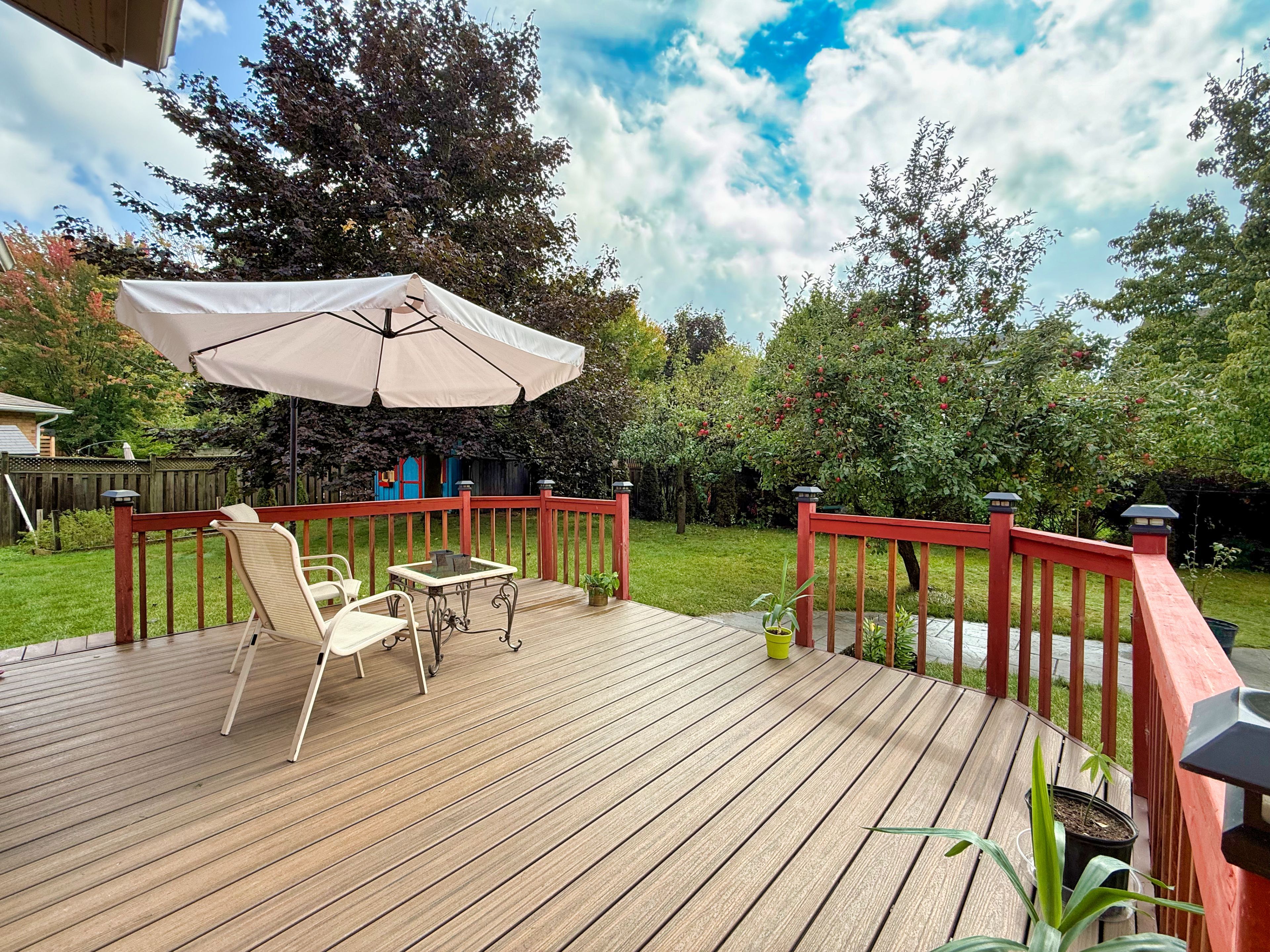 • Expansive backyard with a composite deck, shade trees, and future pool potential.
