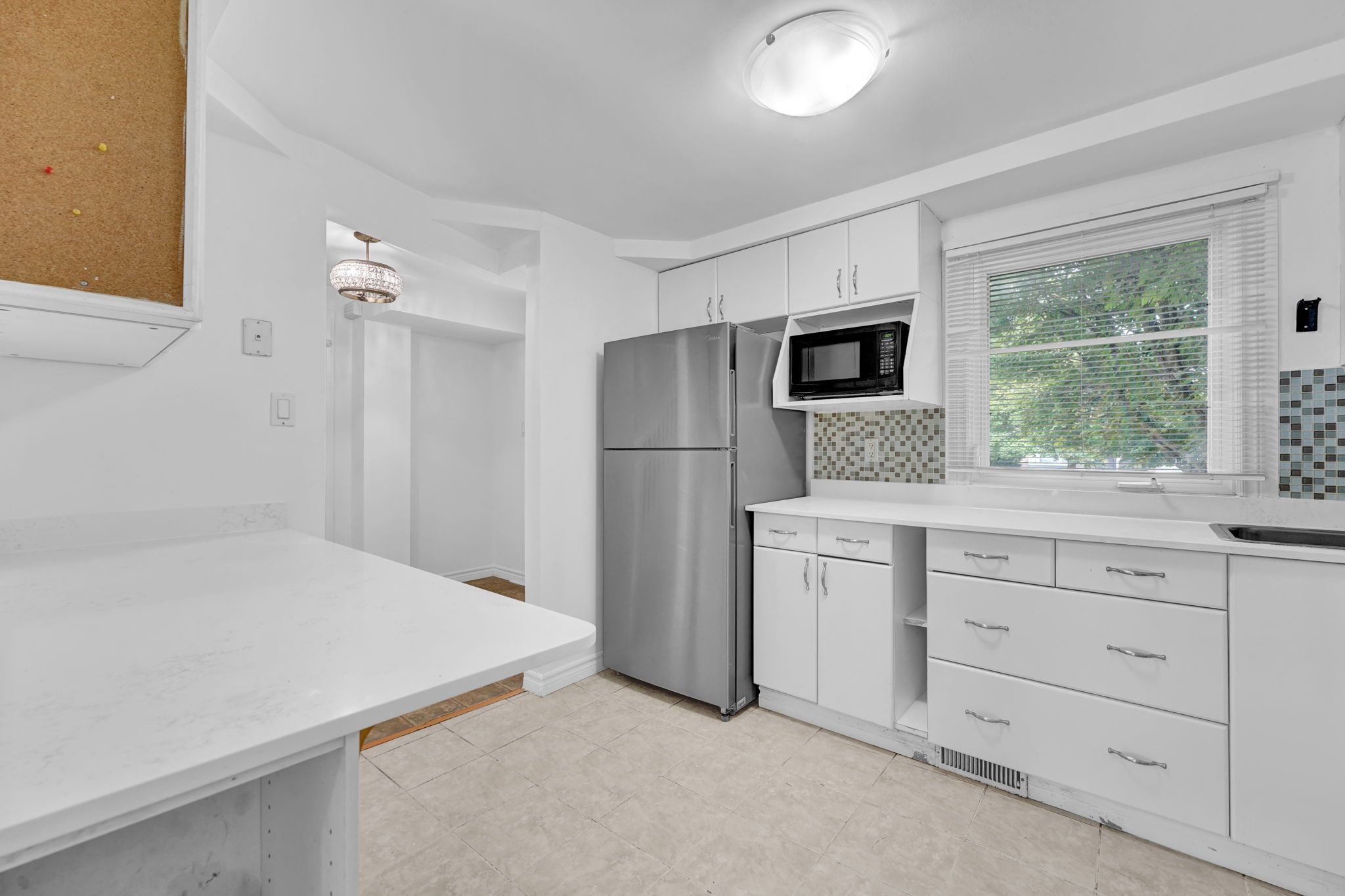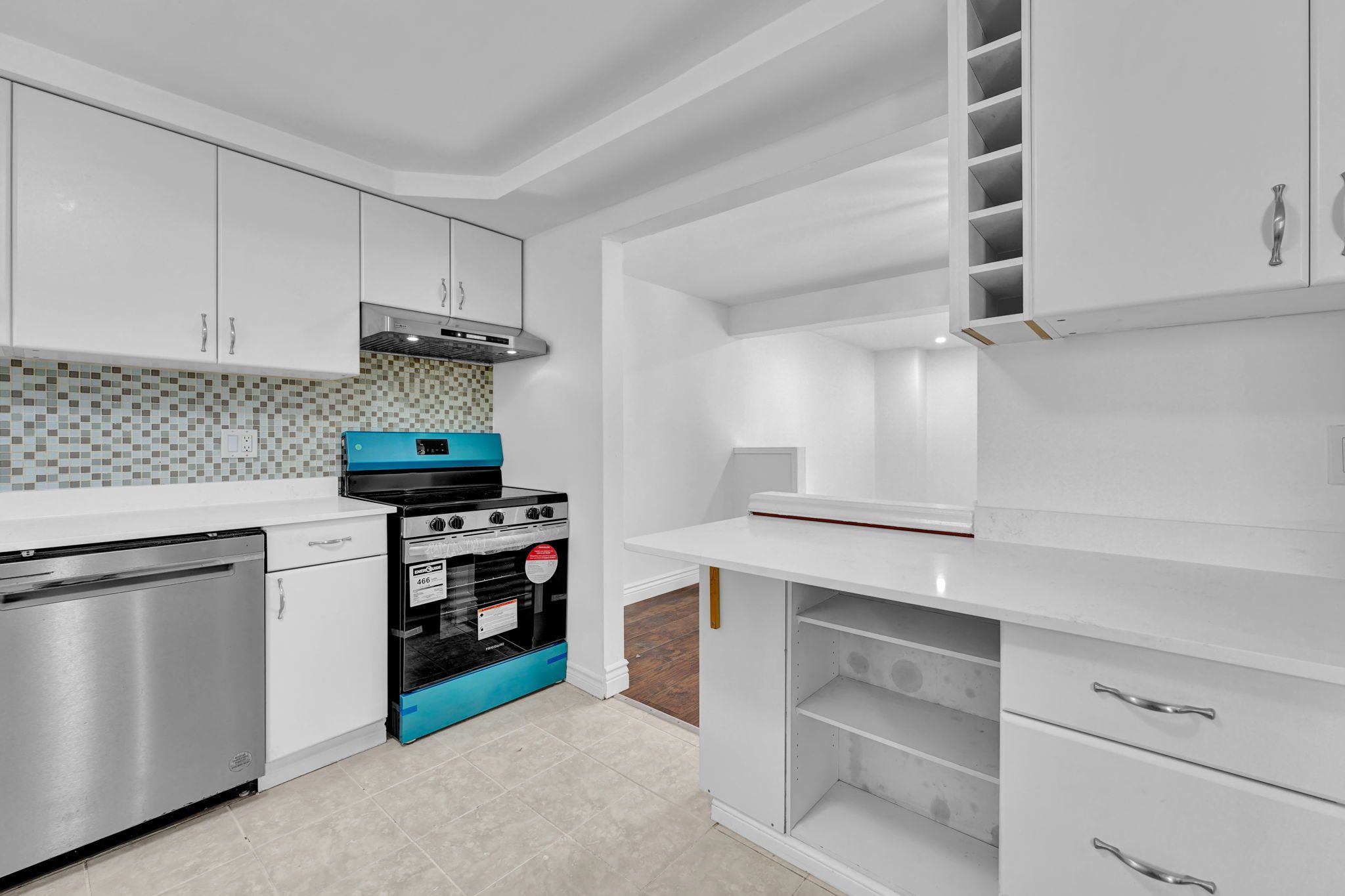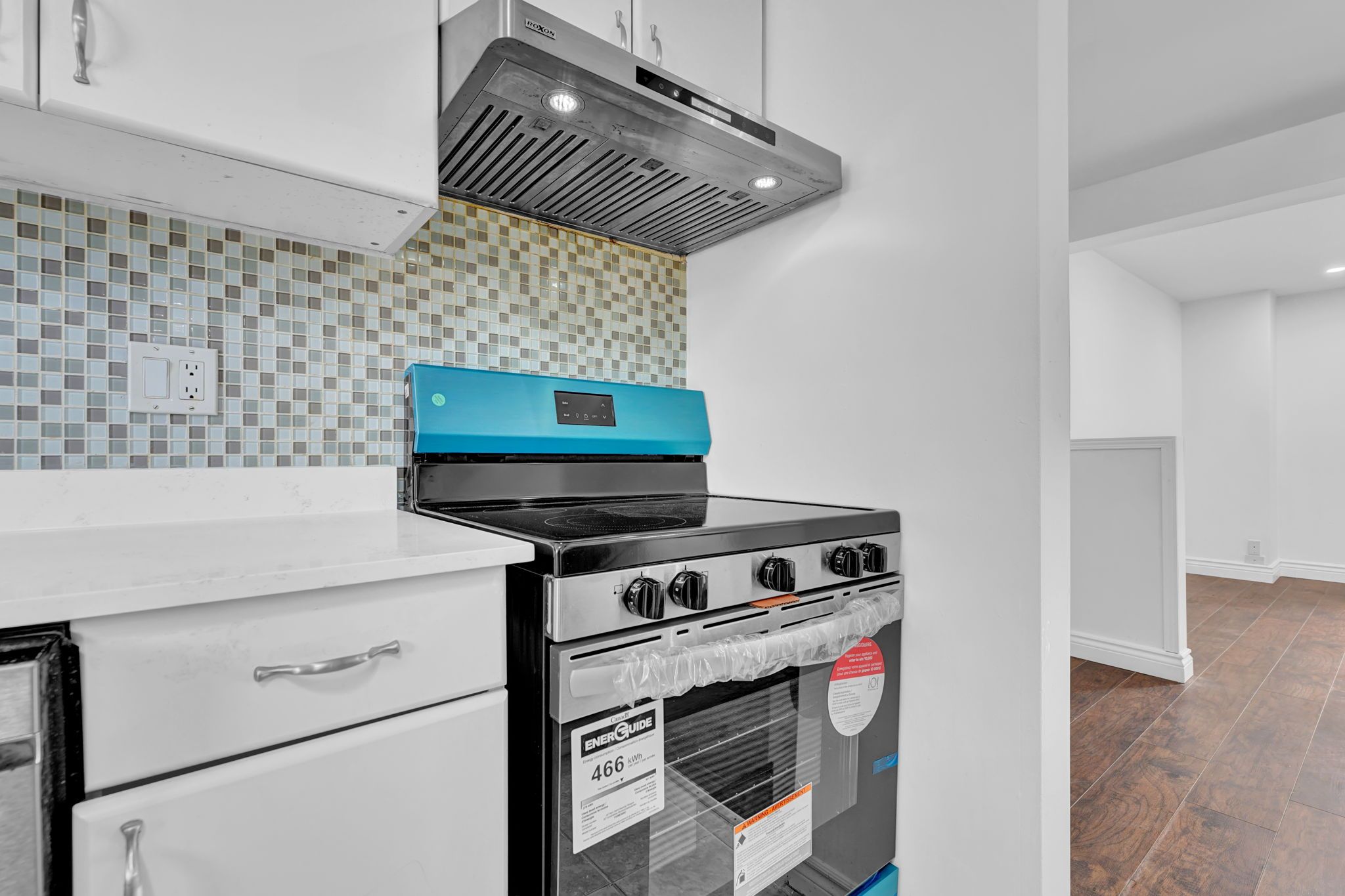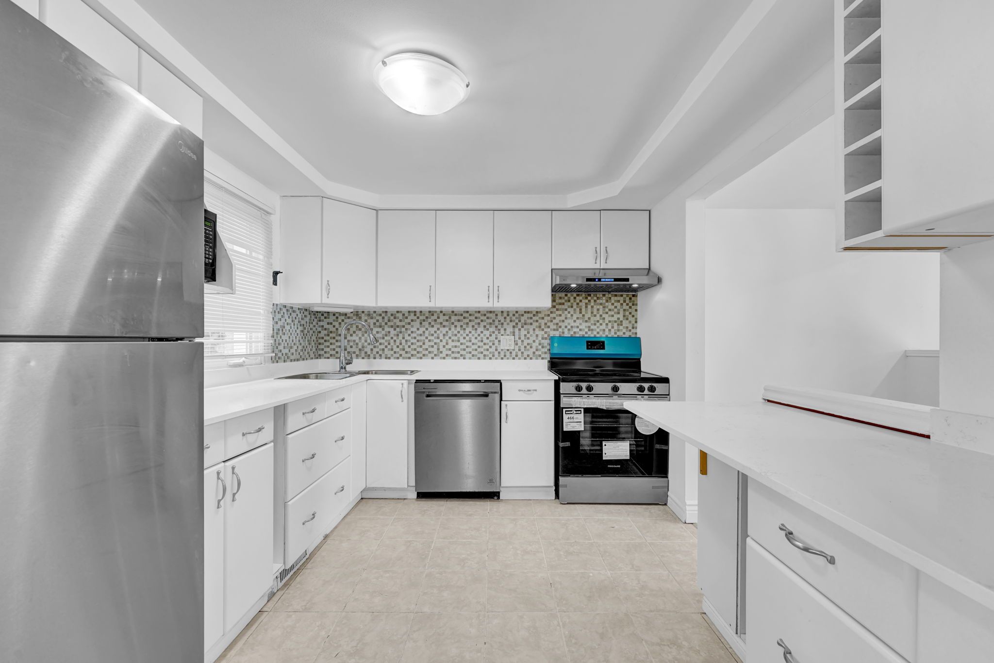 • Bright kitchen with new stove, stainless steel appliances, and ample counter space.