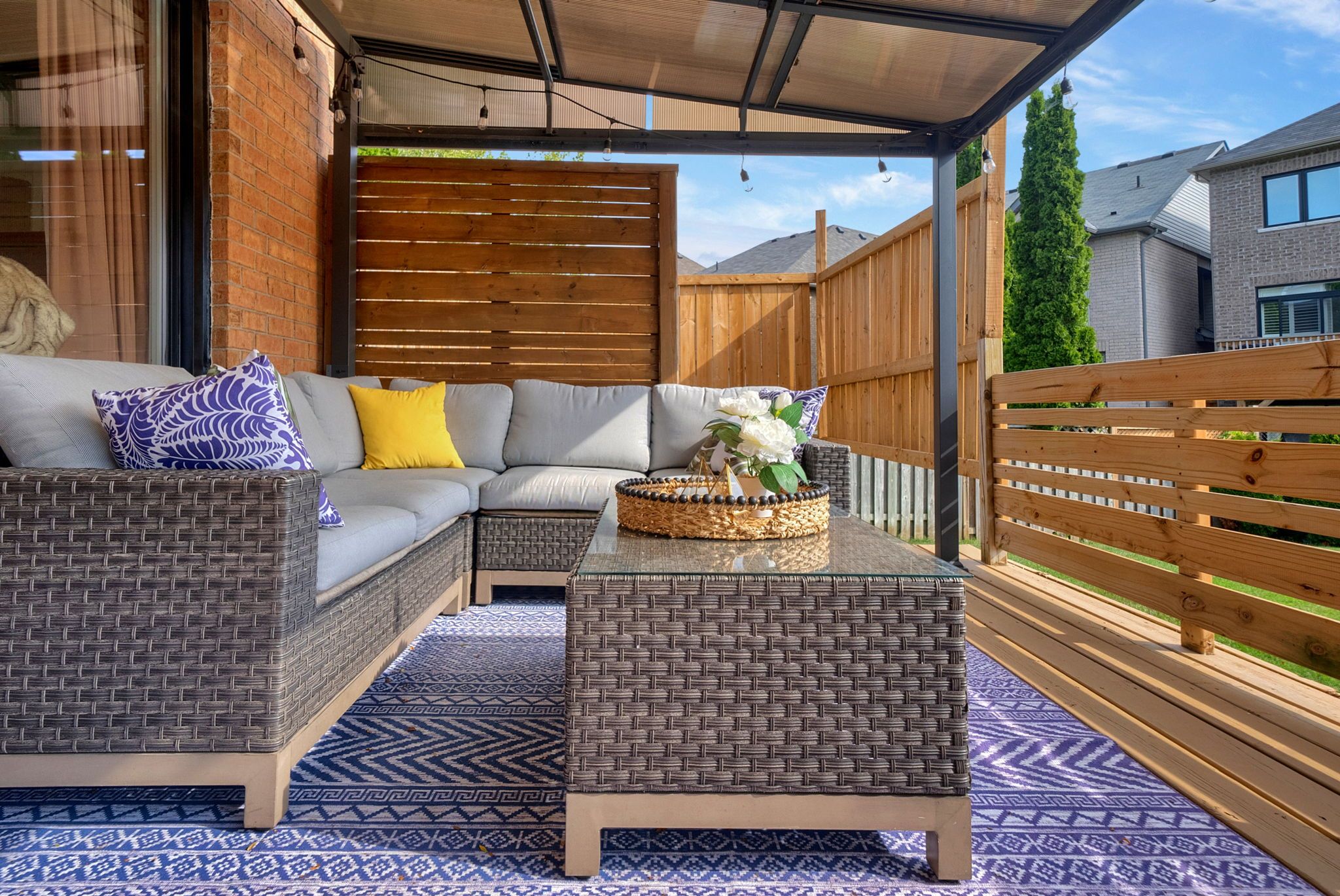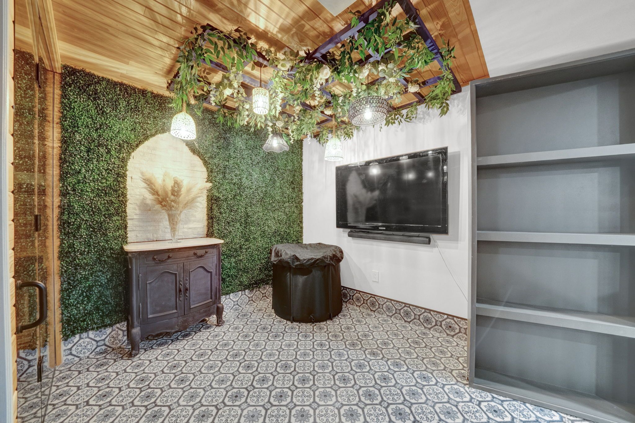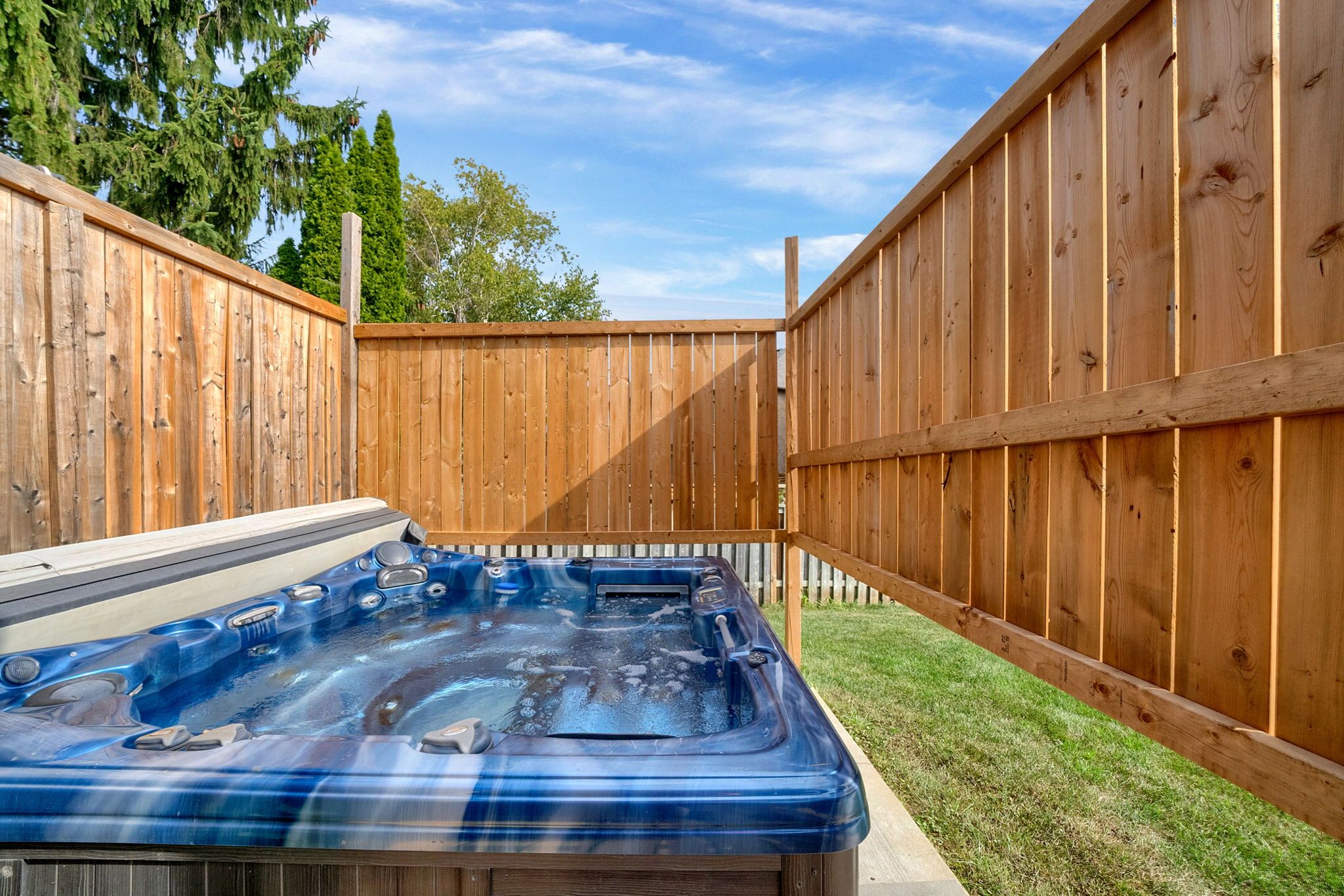 • Private backyard with an in-ground pool, hot tub, and outdoor kitchen.
