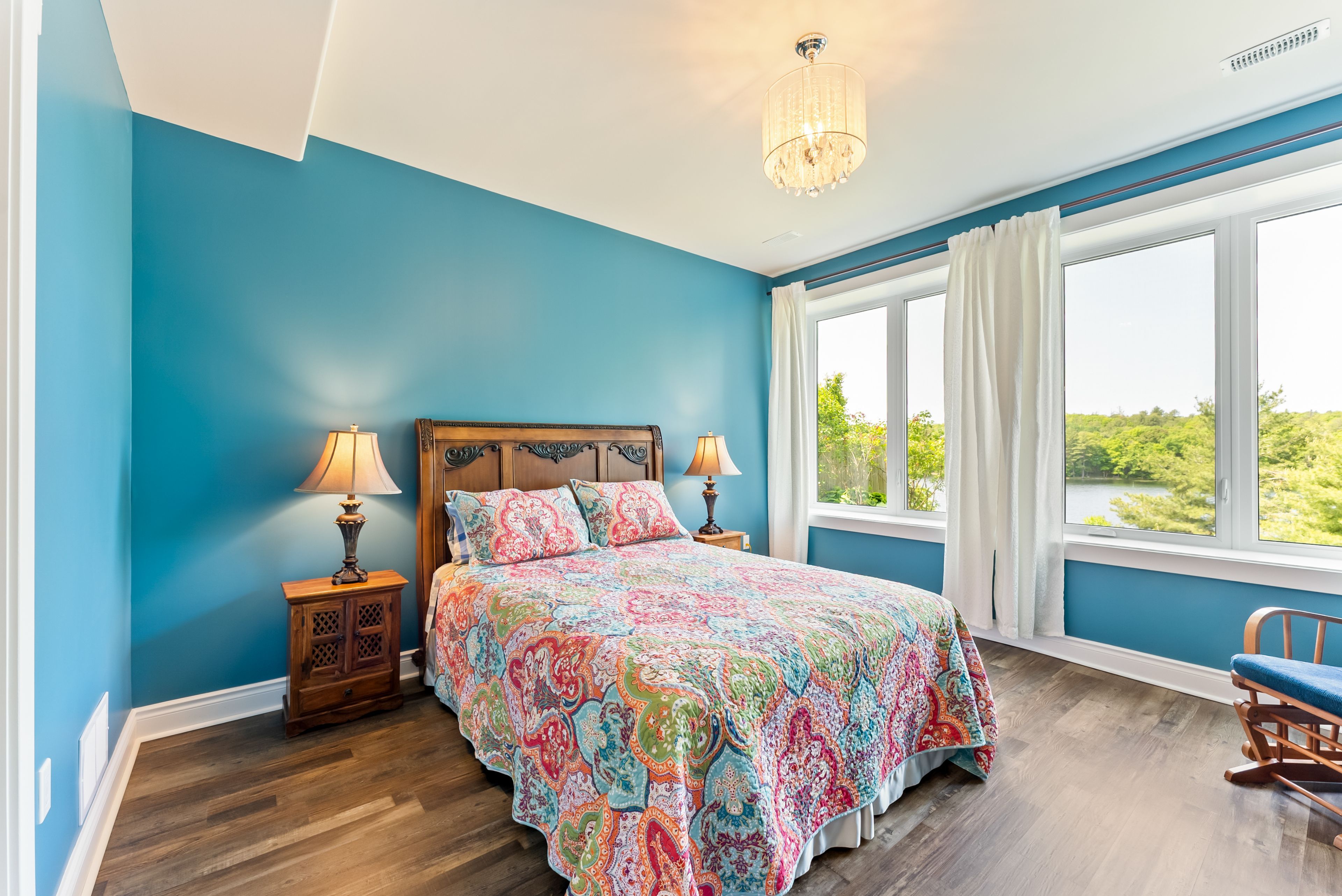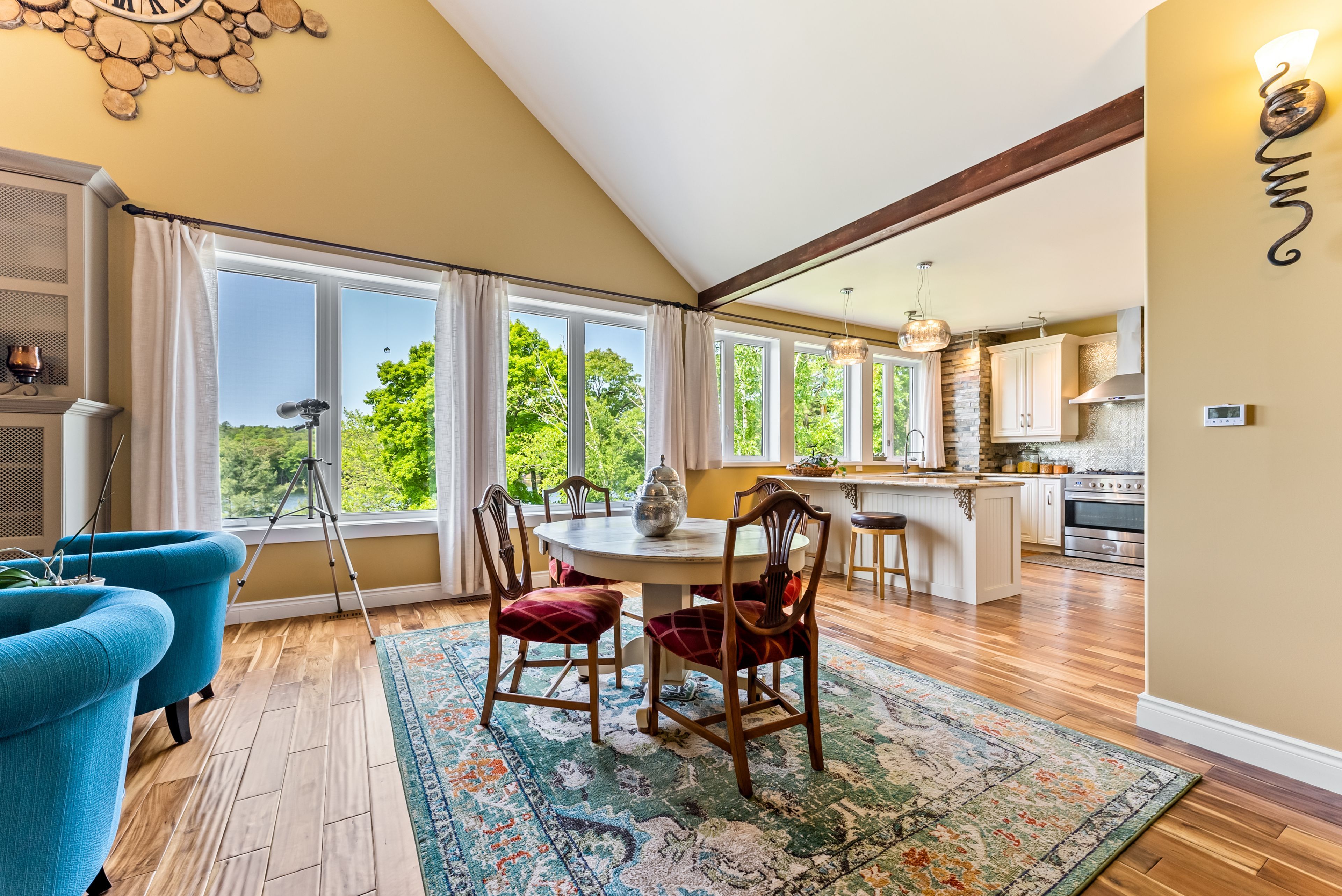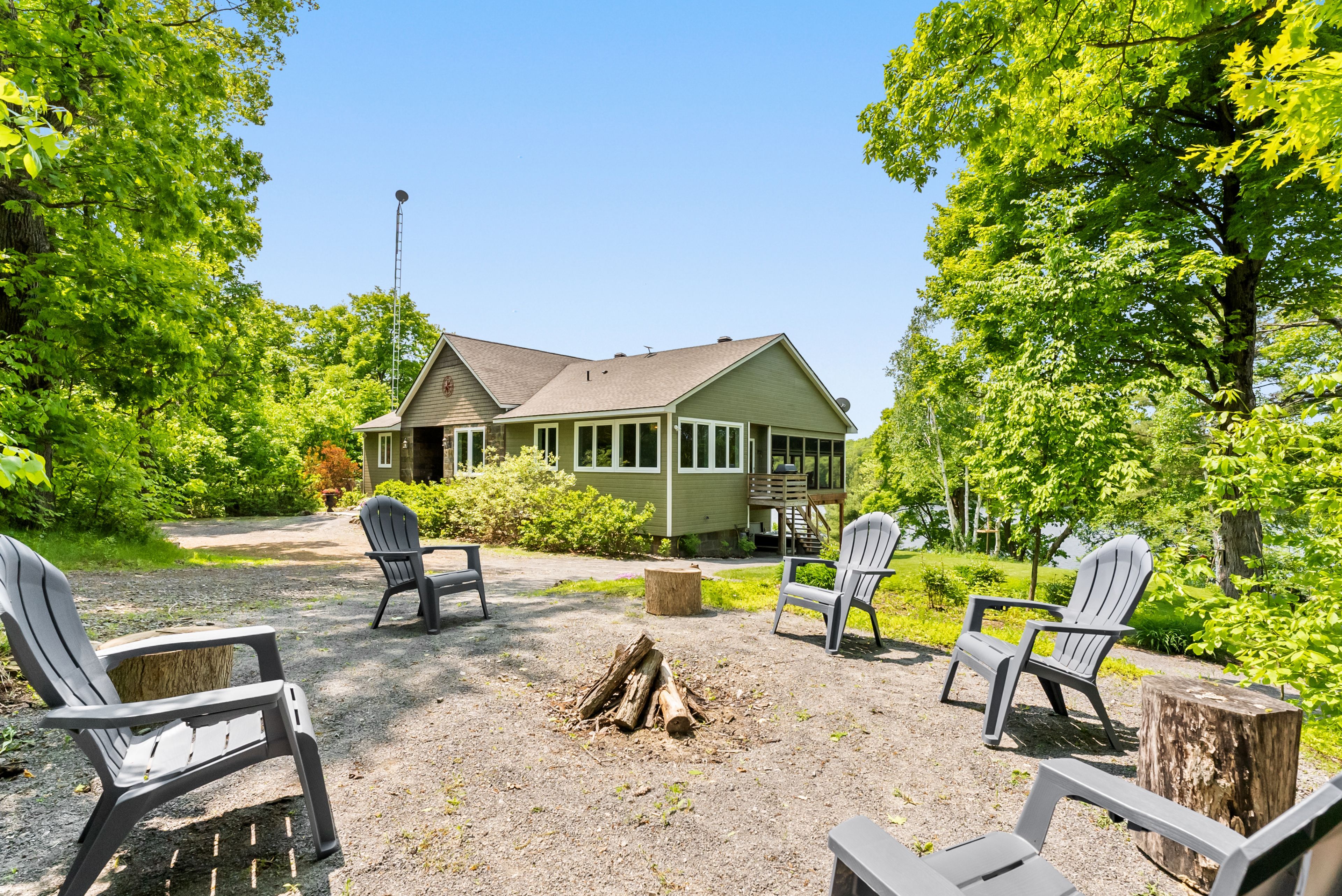 |multigenerational estate | with 7200 sq ft of indoor living and entertaining space there is enough room for all of your family and friends. Main house consists of 4800 sqft of living space, acacia hardwood, porcelain, and slate flooring, with granite countertops throughout. Custom kitchen with massive walk-in pantry with abundant storage. The living room is highlighted by a propane fireplace with custom cabinetry and vaulted ceilings. The large primary suite offers a private deck overlooking the water, a 5-piece ensuite with heated floors, double vanity, large soaker tub, and large walk-in closet with custom cabinetry with intricate details crafted from wood sourced on the property. Additional features include a main floor laundry with built-in cabinetry, a sunroom to view the spectacular sunsets, and an oversized office that can serve as a second bedroom. Massive windows throughout frame breathtaking lake views. The walkout basement features an in-law suite with over 9-foot ceilings, three bedrooms two with walk-in closets, 4-piece bathroom, and in-floor heating sourced from the efficient boiler system. Ask for the economical utility costs. Detached and insulated 2400 sq ft garage with wood stove is perfect for hobby's or a home-based business. An additional fully insulated and finished 2,400 sq ft entertainment space above garage is complete with included furnishings, heat pump systems and large deck. Outdoor spaces include hot tub, saltwater pool, lake toys (canoe, kayak, paddle board, lily pad, swim platform) and a 100-ft dock on over 270 feet of pristine waterfront. This sprawling private 14-acre sanctuary is situated in a mature hardwood forest and includes large fenced in garden with fruit trees, berry bushes and pond. Westerly facing to the lake, spectacular sunsets can be experienced all year long. This estate is the perfect family compound and multigenerational retreat that has everything you need to move right in and enjoy waterfront living!