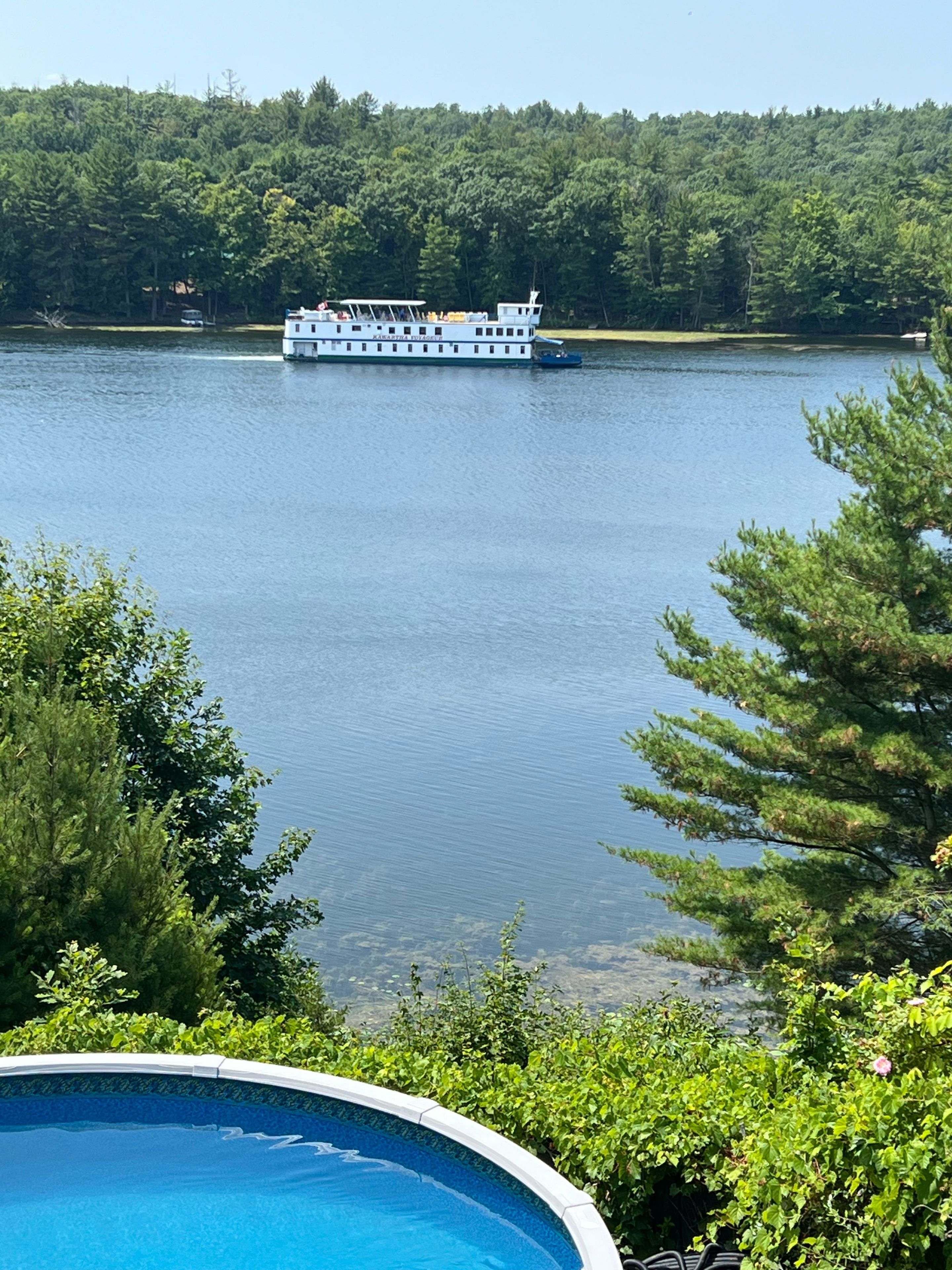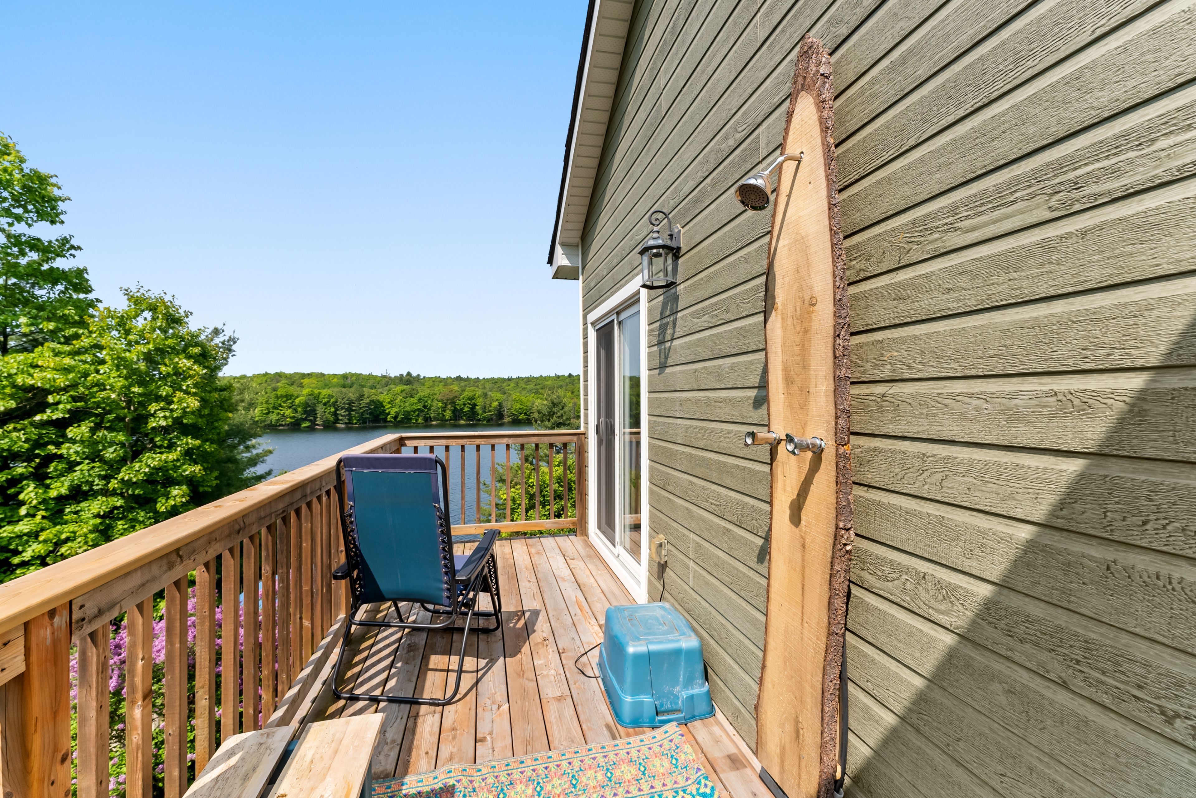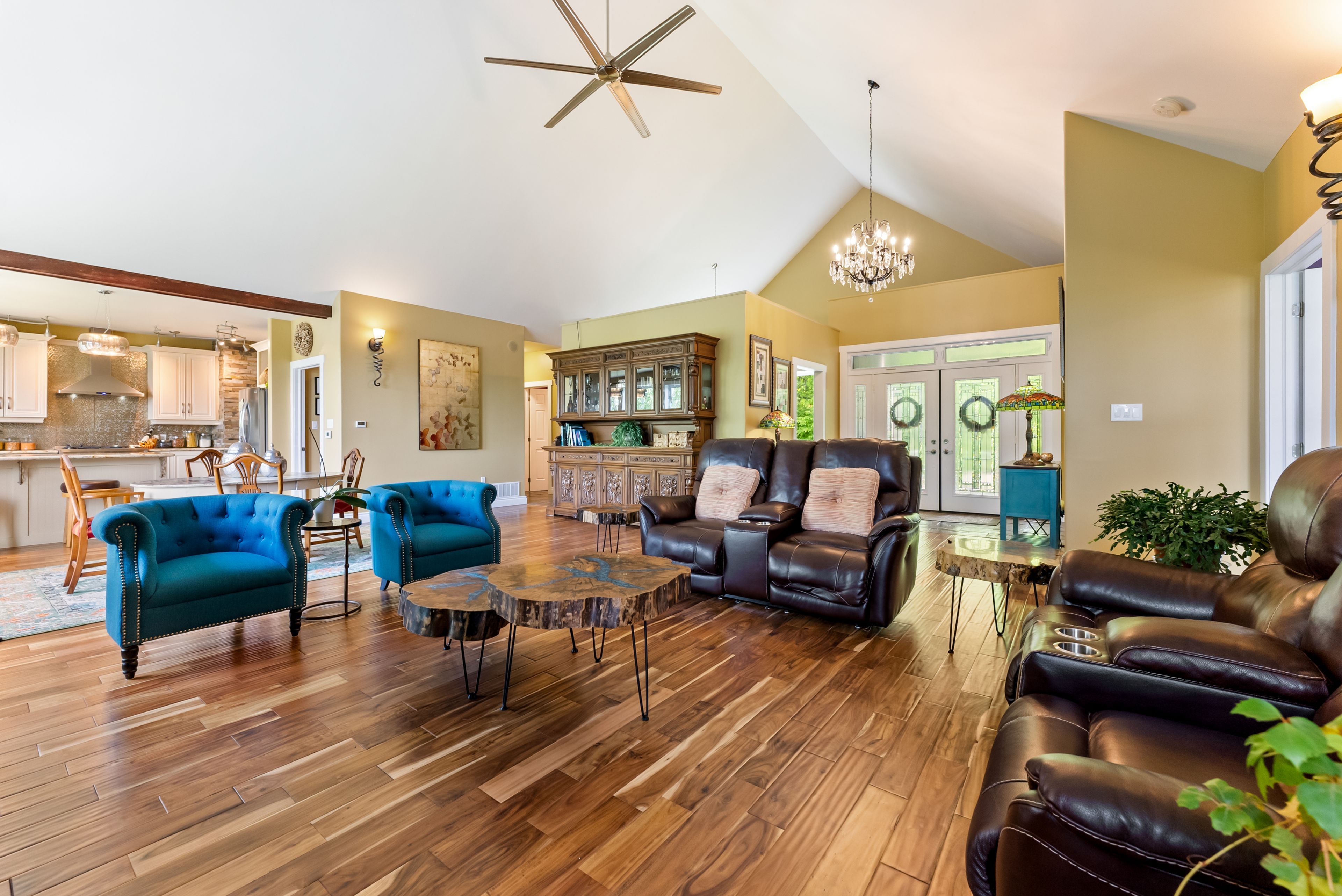 |multigenerational estate | with 7200 sq ft of indoor living and entertaining space there is enough room for all of your family and friends. Main house consists of 4800 sqft of living space, acacia hardwood, porcelain, and slate flooring, with granite countertops throughout. Custom kitchen with massive walk-in pantry with abundant storage. The living room is highlighted by a propane fireplace with custom cabinetry and vaulted ceilings. The large primary suite offers a private deck overlooking the water, a 5-piece ensuite with heated floors, double vanity, large soaker tub, and large walk-in closet with custom cabinetry with intricate details crafted from wood sourced on the property. Additional features include a main floor laundry with built-in cabinetry, a sunroom to view the spectacular sunsets, and an oversized office that can serve as a second bedroom. Massive windows throughout frame breathtaking lake views. The walkout basement features an in-law suite with over 9-foot ceilings, three bedrooms two with walk-in closets, 4-piece bathroom, and in-floor heating sourced from the efficient boiler system. Ask for the economical utility costs. Detached and insulated 2400 sq ft garage with wood stove is perfect for hobby's or a home-based business. An additional fully insulated and finished 2,400 sq ft entertainment space above garage is complete with included furnishings, heat pump systems and large deck. Outdoor spaces include hot tub, saltwater pool, lake toys (canoe, kayak, paddle board, lily pad, swim platform) and a 100-ft dock on over 270 feet of pristine waterfront. This sprawling private 14-acre sanctuary is situated in a mature hardwood forest and includes large fenced in garden with fruit trees, berry bushes and pond. Westerly facing to the lake, spectacular sunsets can be experienced all year long. This estate is the perfect family compound and multigenerational retreat that has everything you need to move right in and enjoy waterfront living!