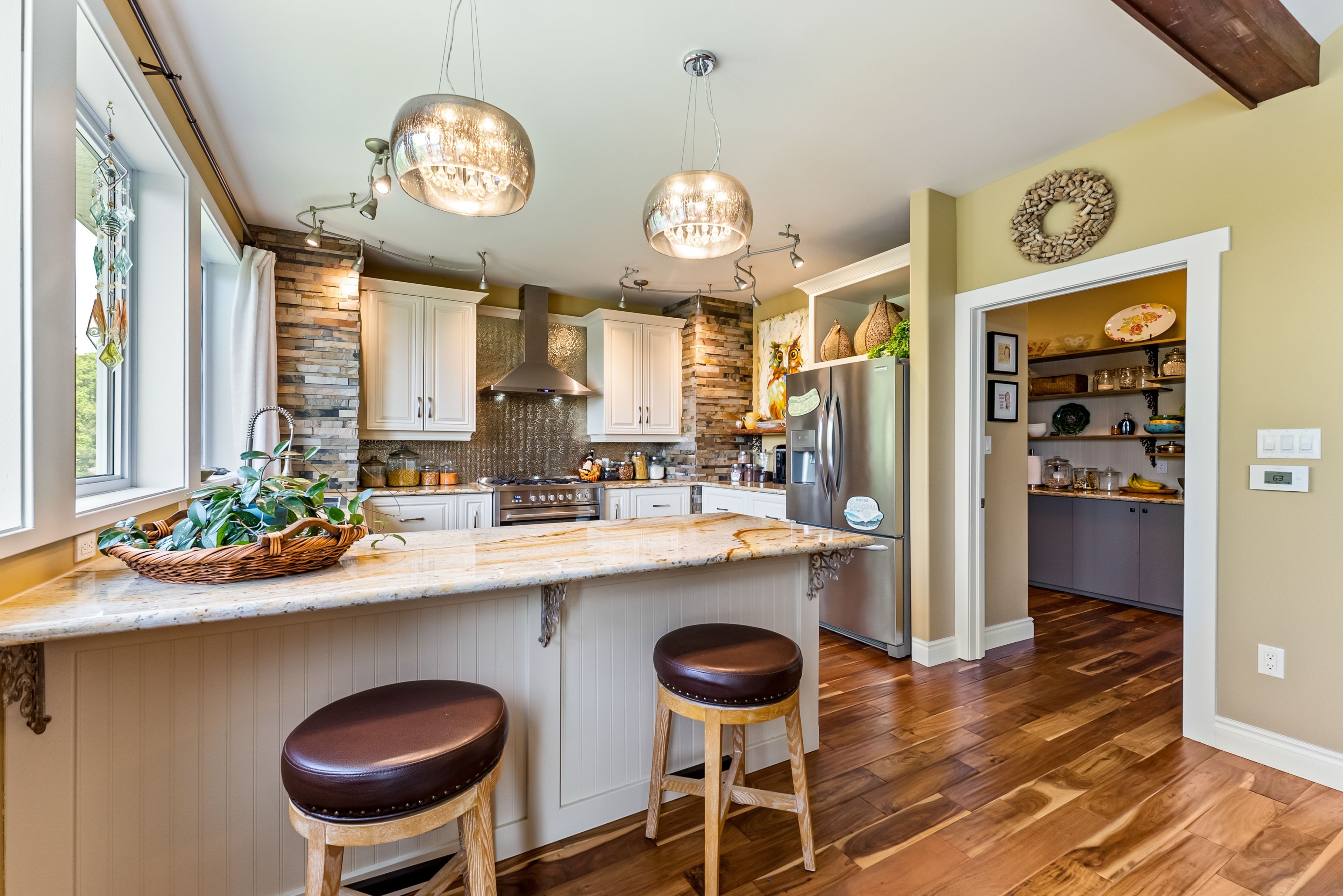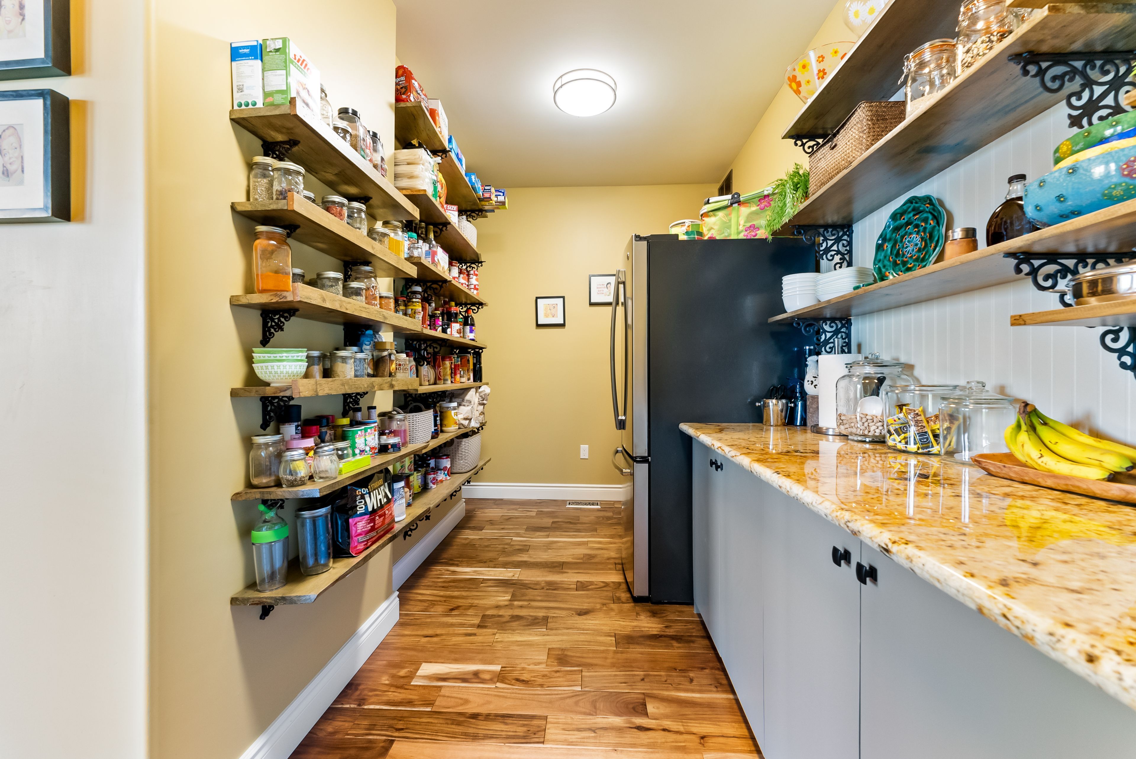 • Custom kitchen featuring a massive walk-in pantry and granite countertops.