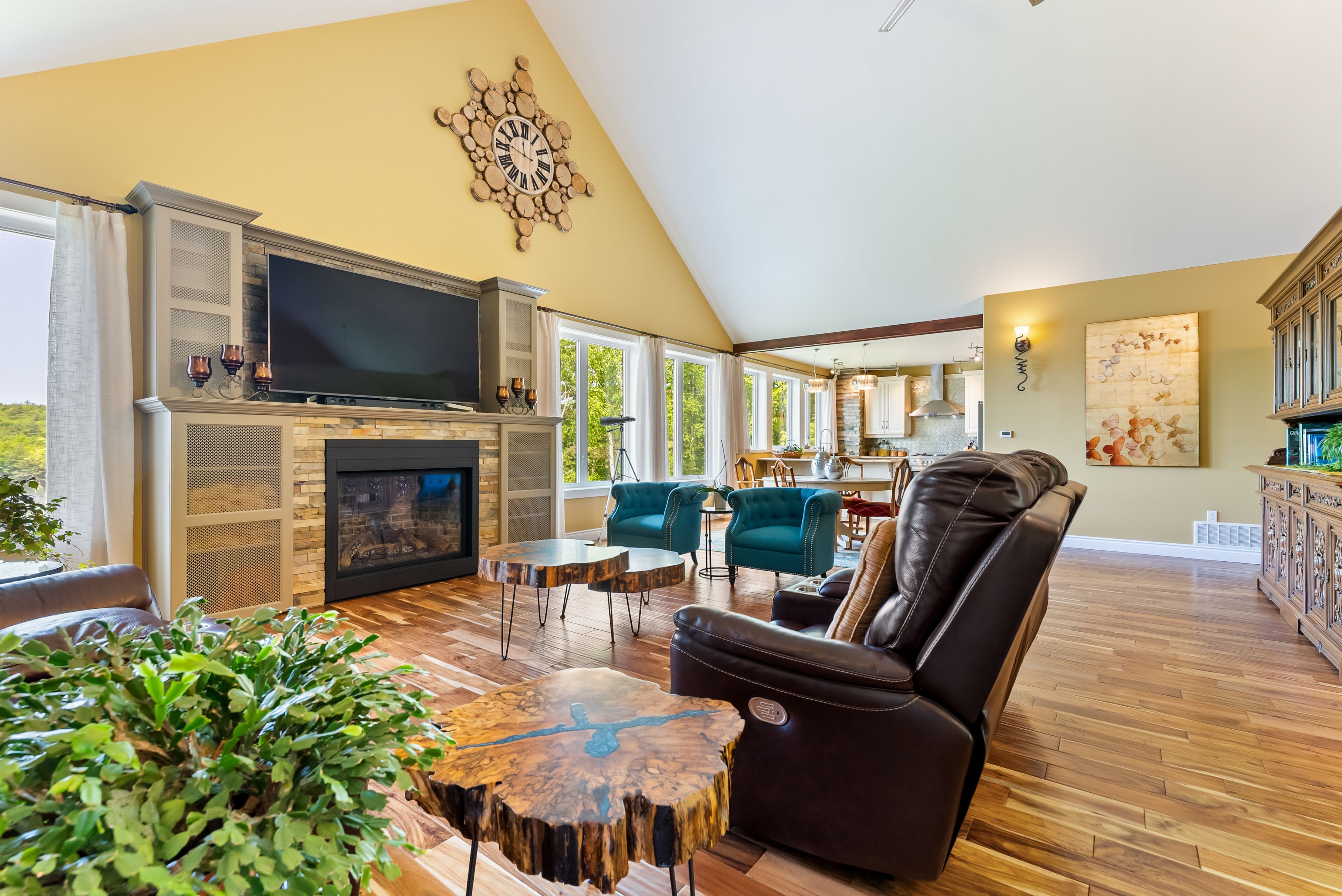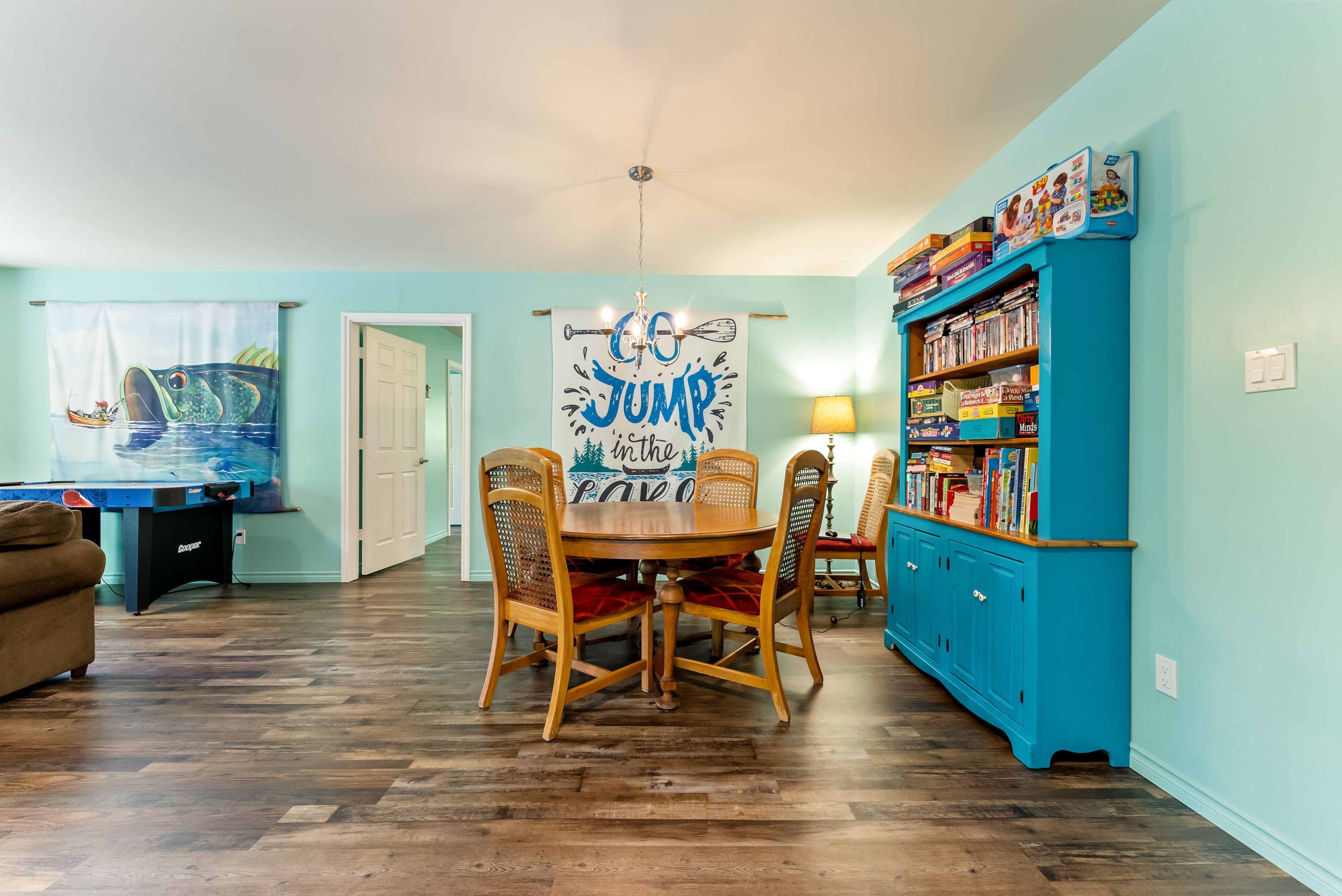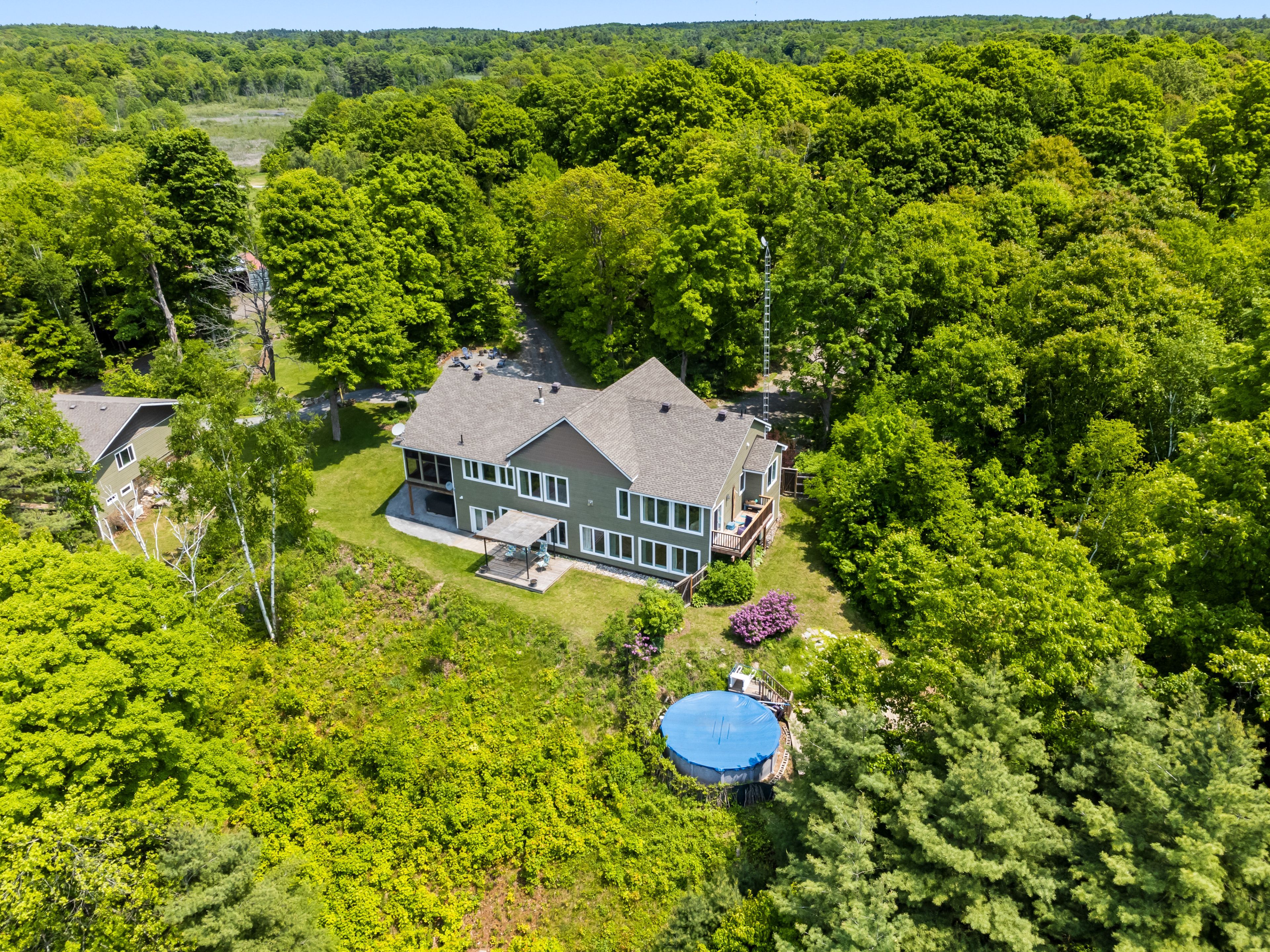 Multigenerational estate {14 acres } with 7200 sqft of indoor living and entertaining space there is enough room for all of your family and friends. The main house comes fully furnished and consists of 4800 sqft of living space, acacia hardwood, porcelain, and slate flooring, with granite countertops throughout. Custom kitchen with massive walk-in pantry with abundant storage. The living room is highlighted by a propane fireplace with custom cabinetry and vaulted ceilings. The large primary suite offers a private deck overlooking the water, a 5-piece ensuite with heated floors, double vanity, large soaker tub, and large walk-in closet with custom cabinetry with intricate details crafted from wood sourced on the property. Additional features include a main floor laundry with built-in cabinetry, a sunroom to view the spectacular sunsets, and an oversized office that can serve as a second bedroom. Massive windows throughout frame breathtaking lake views. The walkout basement features an in-law suite with over 9-foot ceilings, three bedrooms two with walk-in closets, 4-piece bathroom, and in-floor heating sourced from the efficient boiler system. Ask for the economical utility costs. Detached and insulated 2400 sq ft garage with wood stove is perfect for hobby's or a home-based business. An additional fully insulated and finished 2,400 sq ft entertainment space above garage is complete with included furnishings, heat pump systems and large deck. Outdoor spaces include hot tub, saltwater pool, lake toys, and a 100-ft dock on over 270 feet of pristine waterfront. This sprawling private 14-acre sanctuary is situated in a mature hardwood forest and includes large fenced in garden with fruit trees, berry bushes and pond. Westerly facing to the lake, spectacular sunsets can be experienced all year long. This estate is the perfect family compound and multigenerational retreat that has everything you need to move right in and enjoy waterfront living!