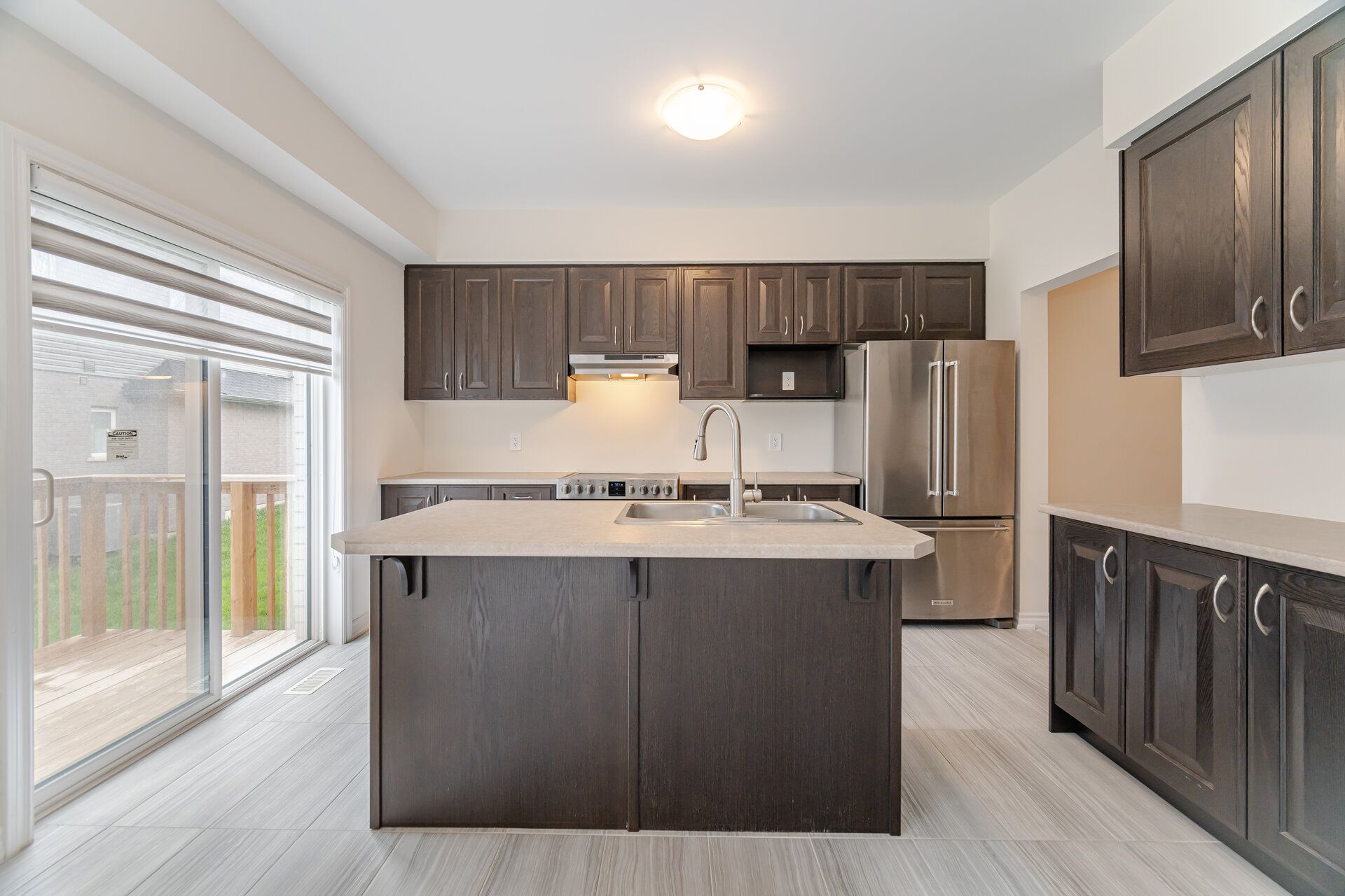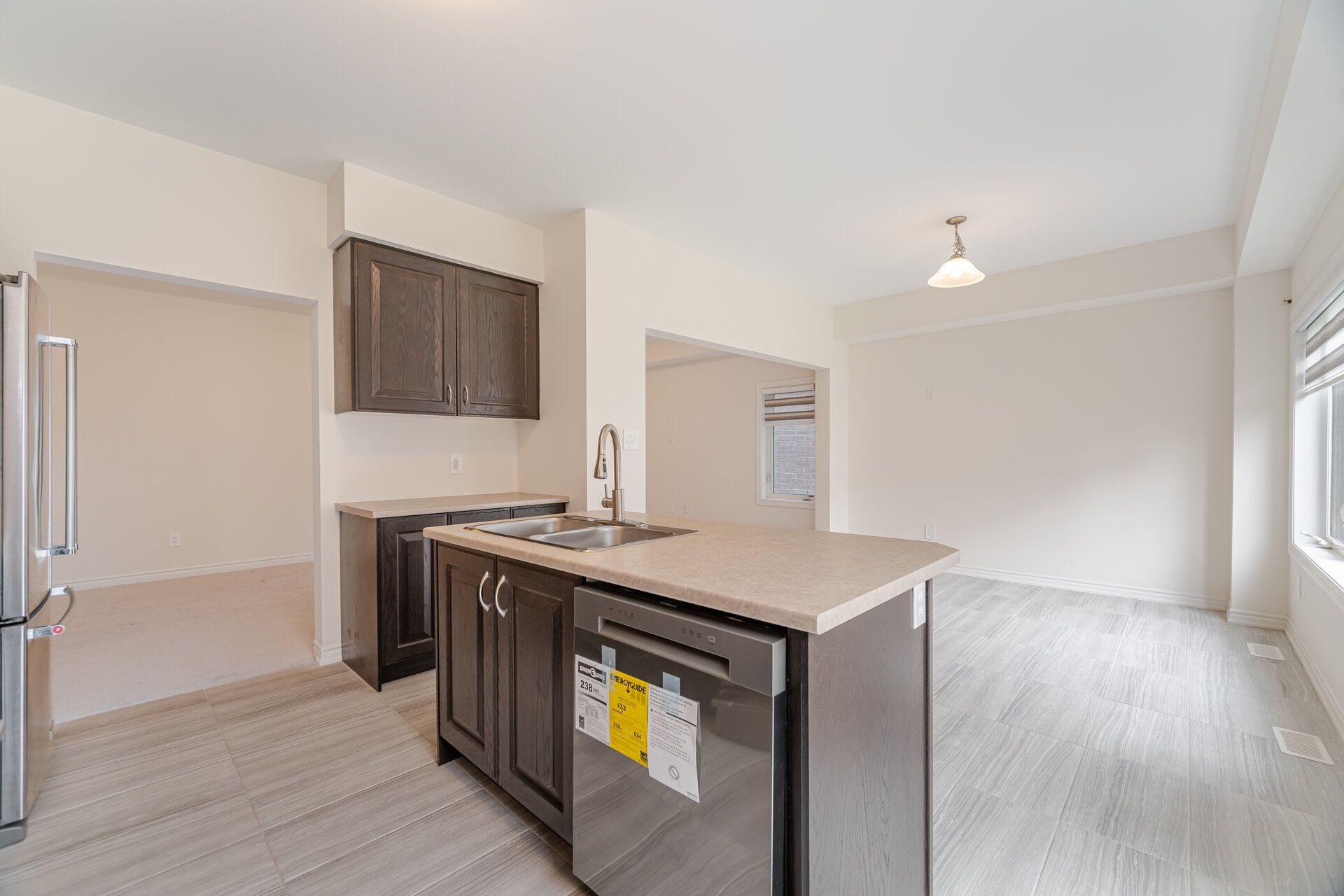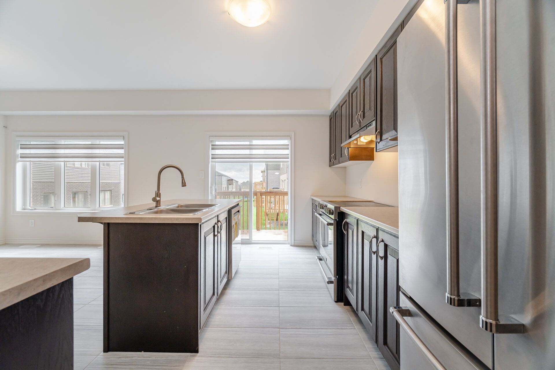 • Spacious kitchen with large island and stainless steel appliances.