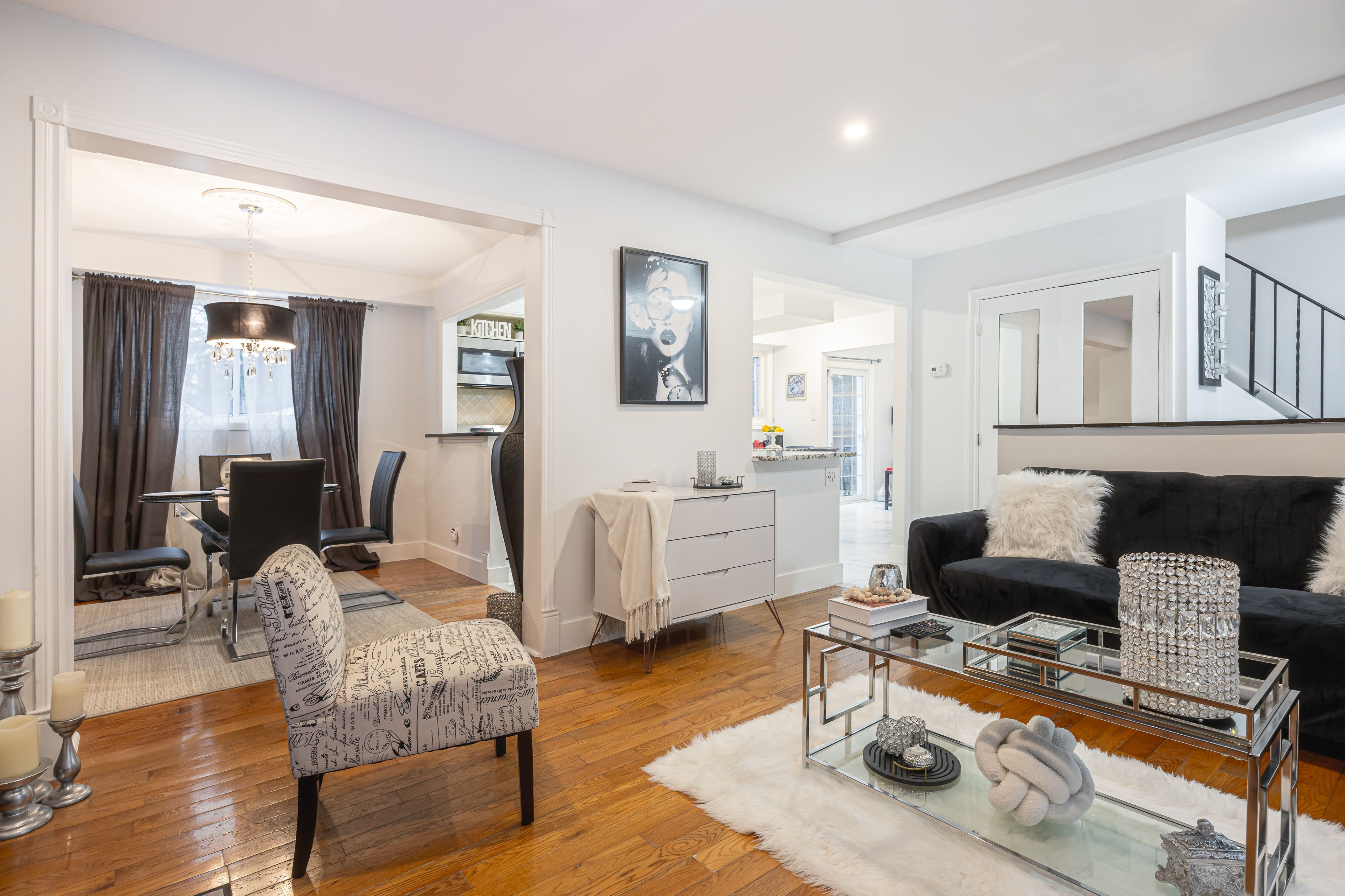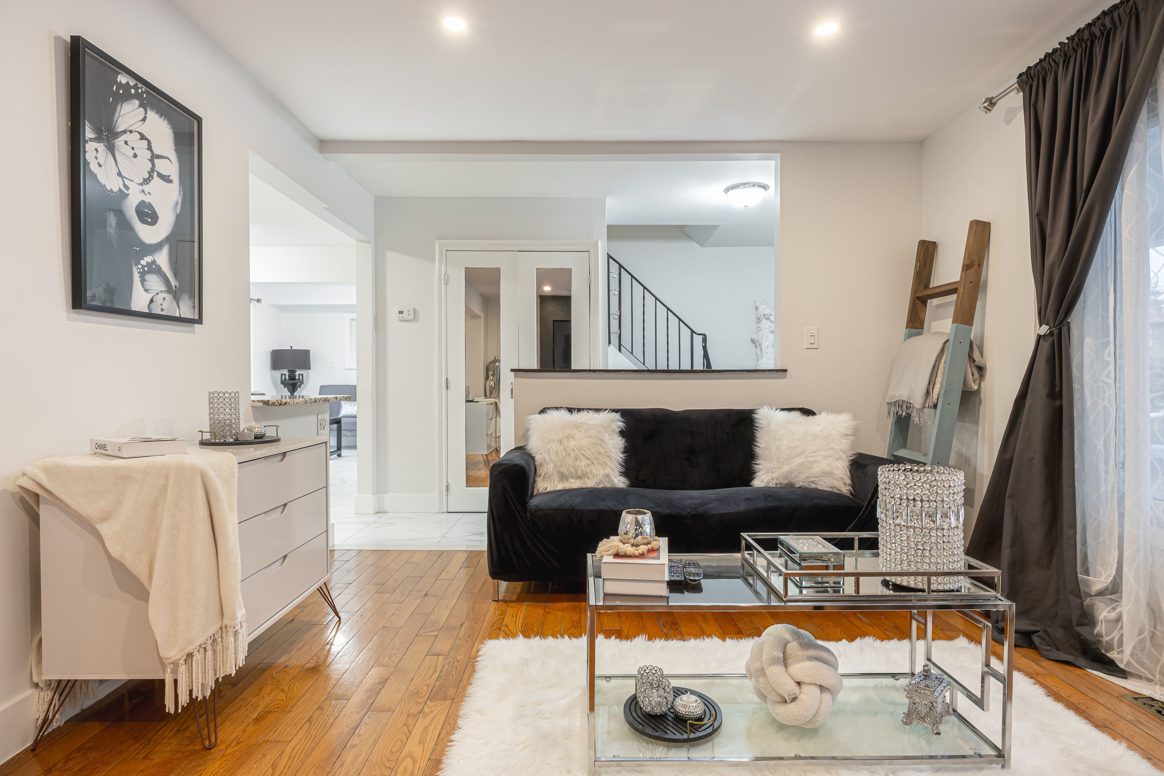 • Bright living room features hardwood floors and a built-in electric fireplace.