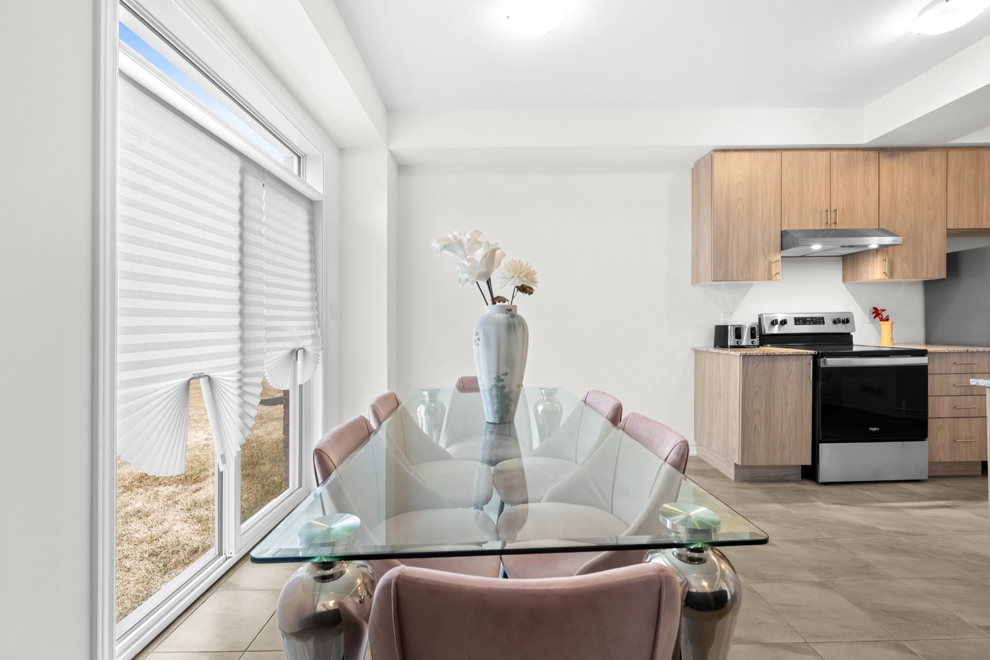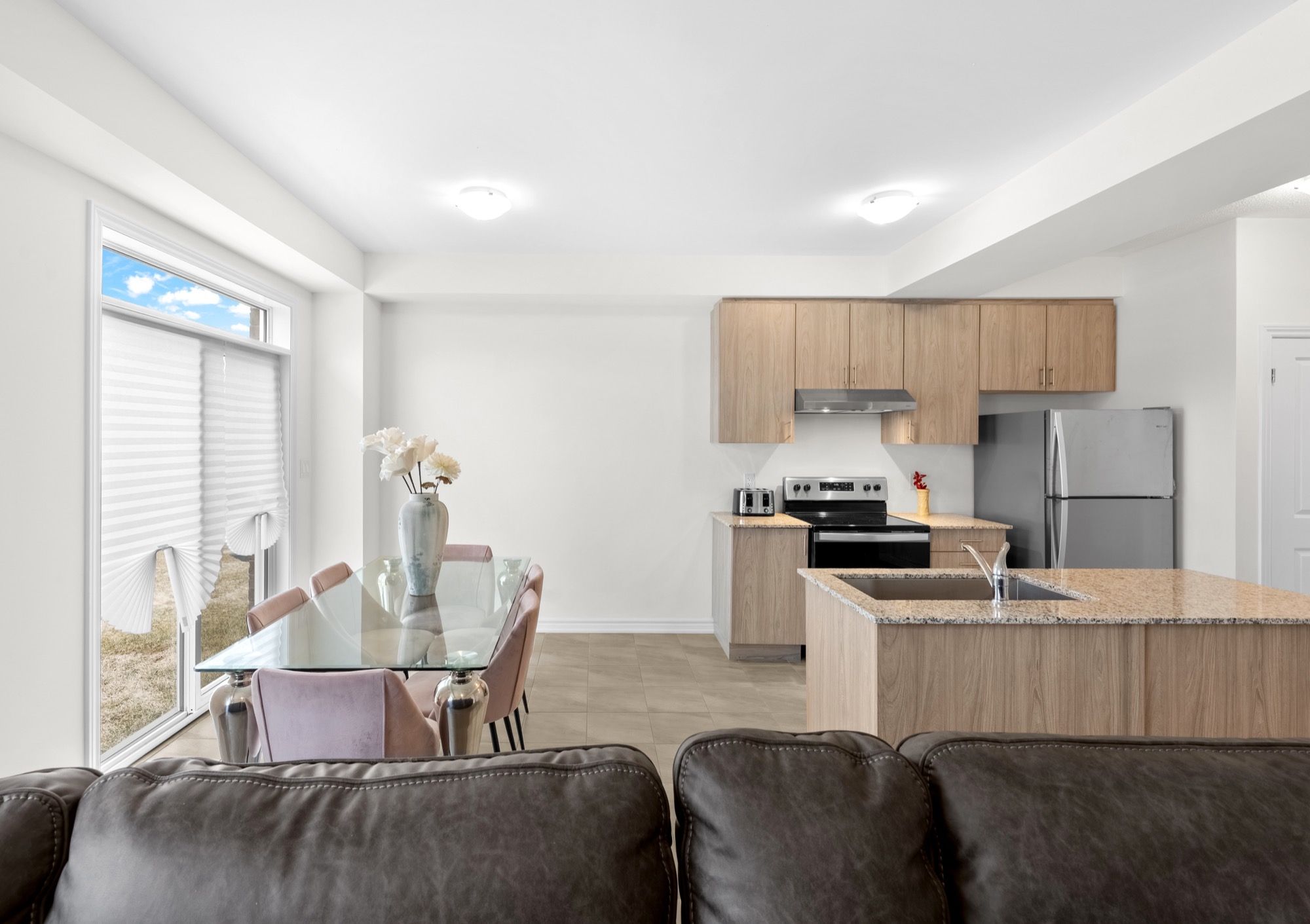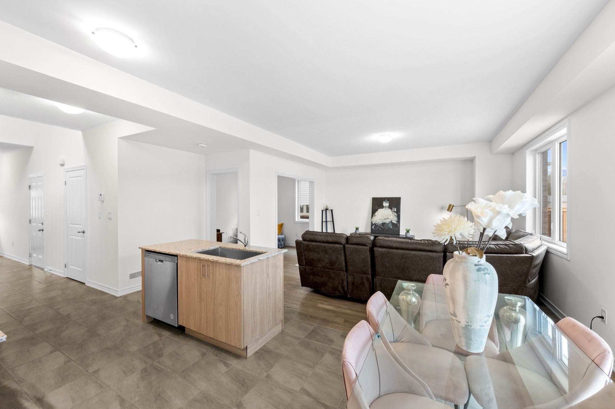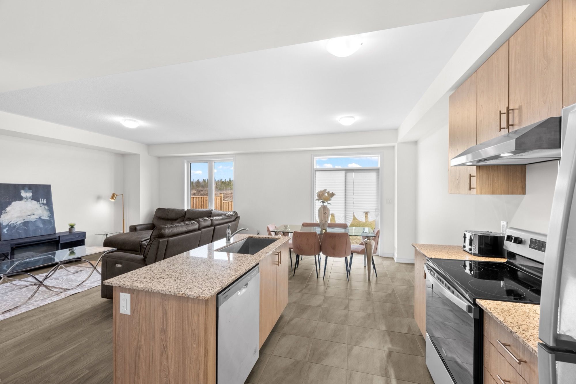 • Bright open-concept main floor with large windows and modern kitchen.