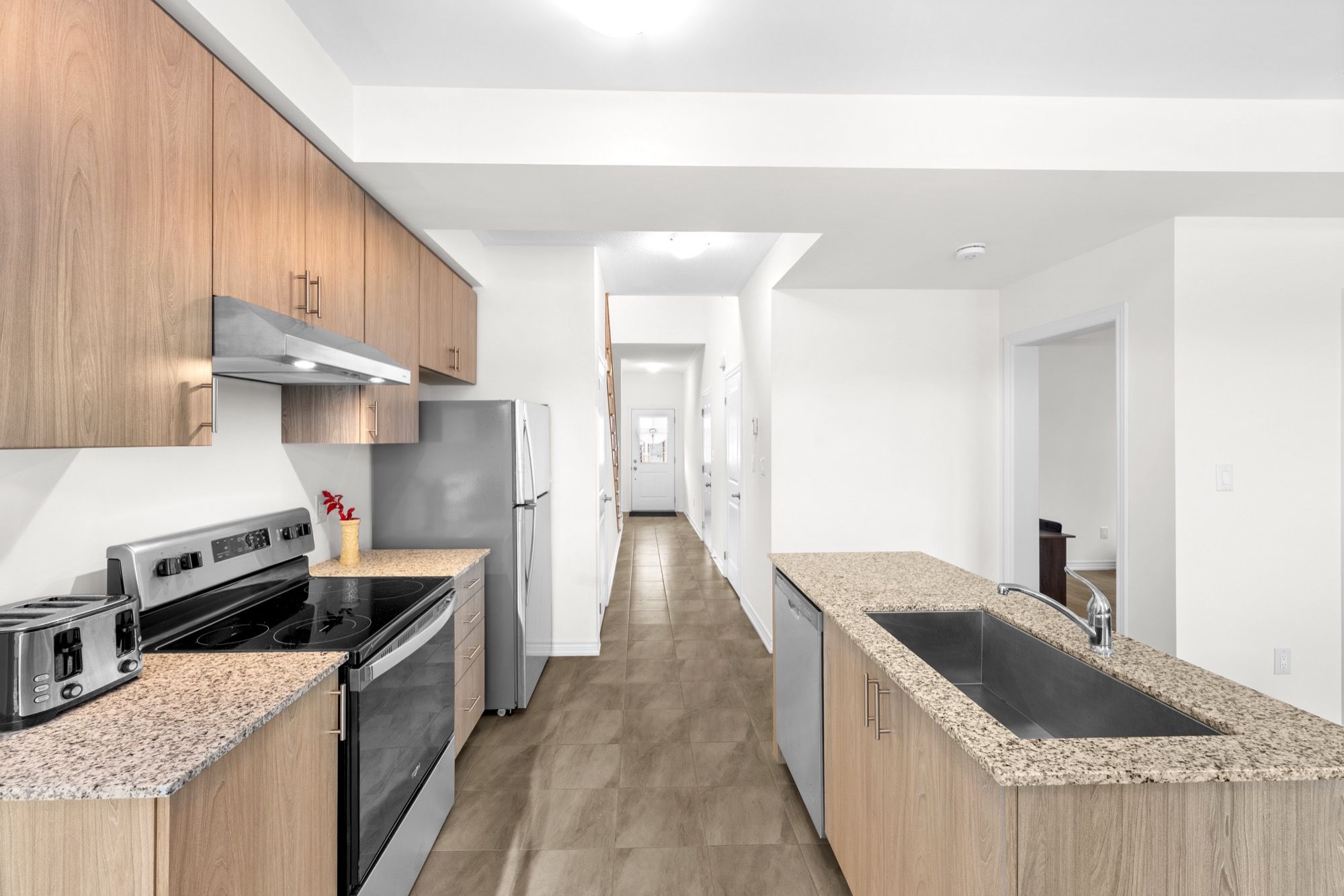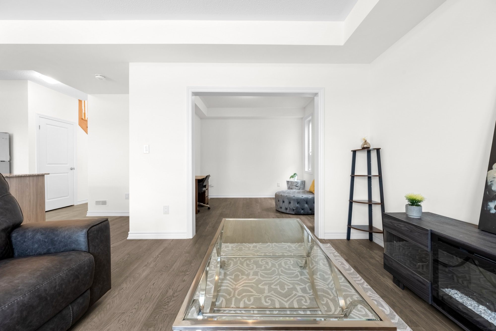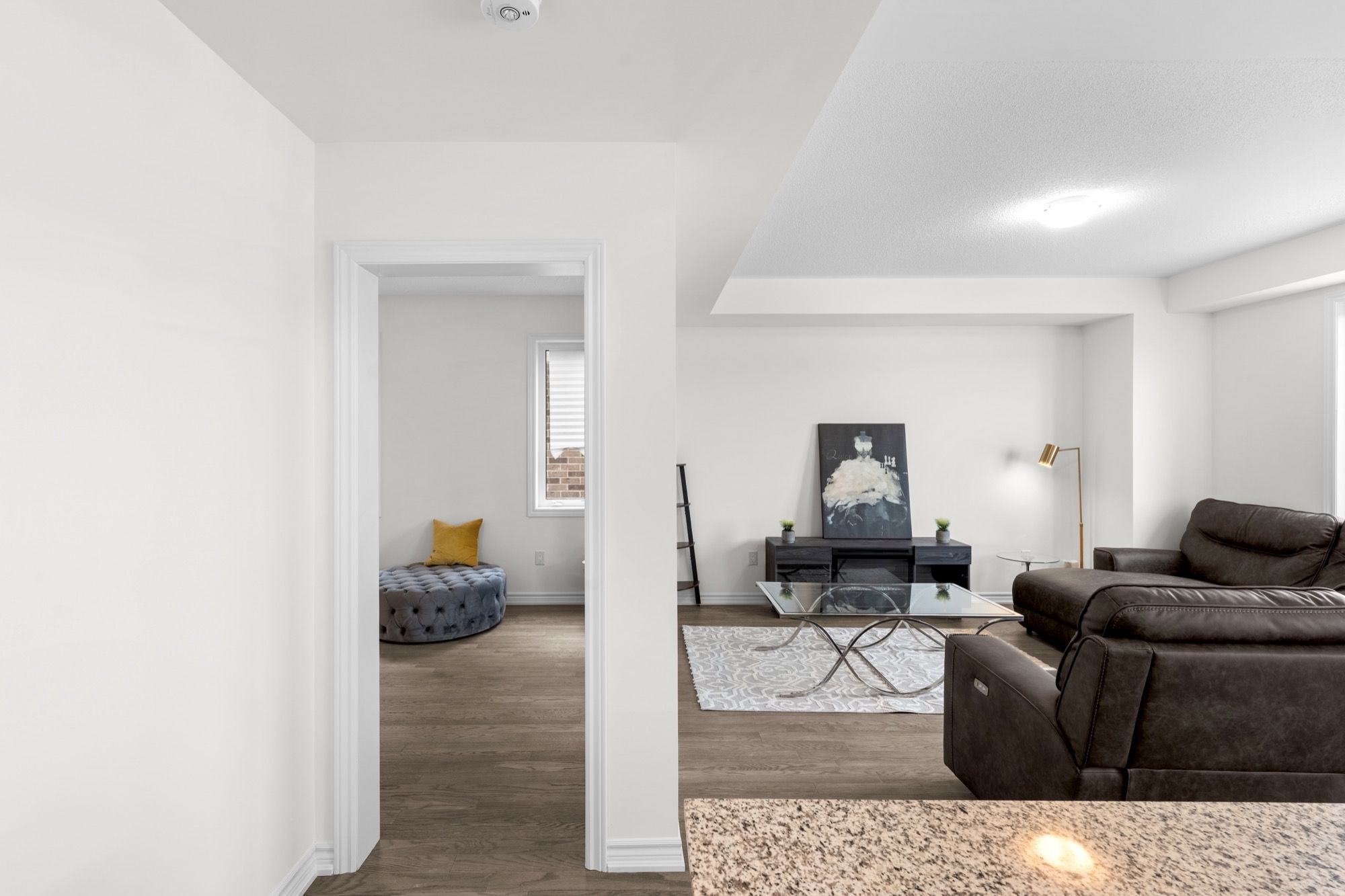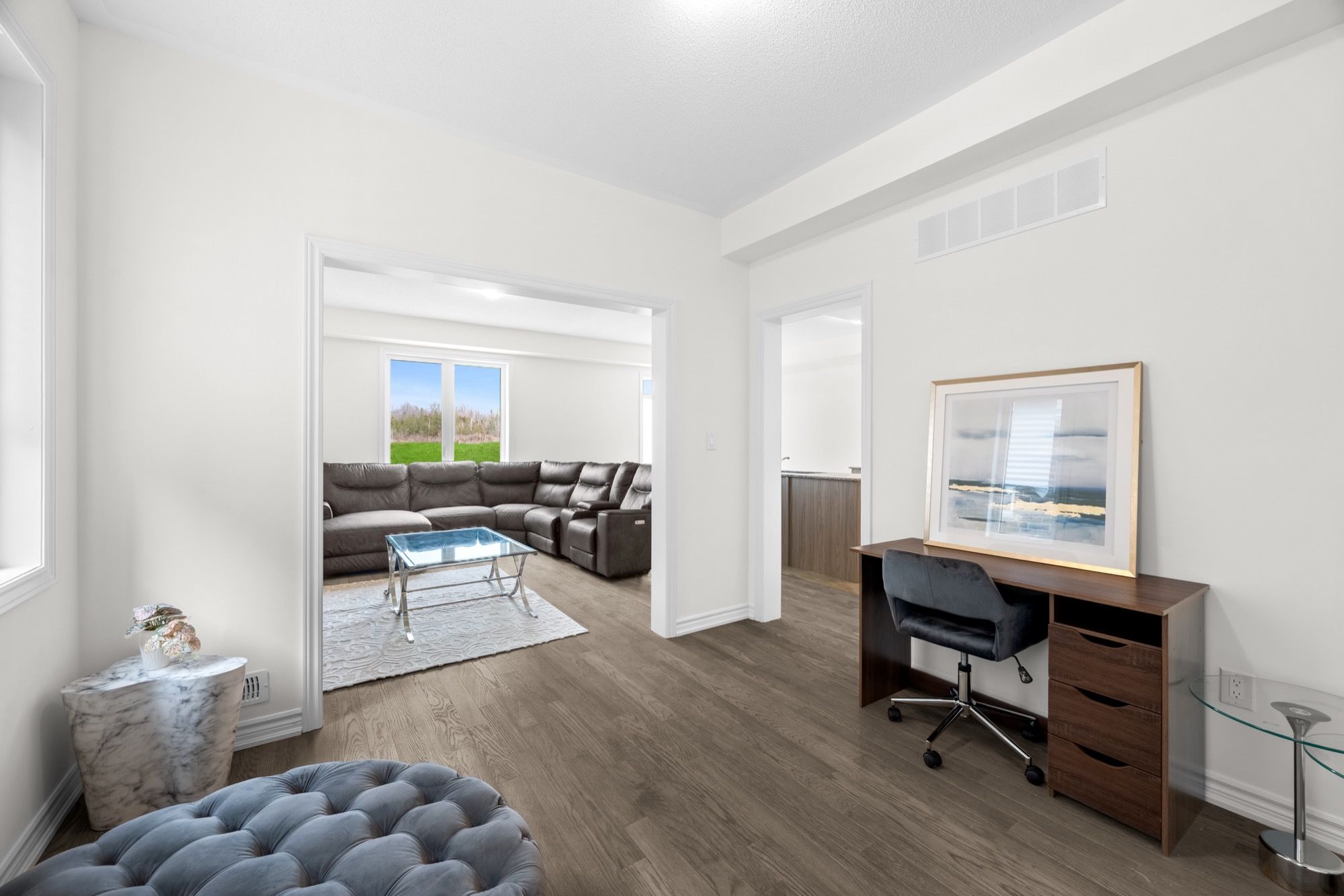 • Bright open-concept main floor with large windows and modern kitchen.