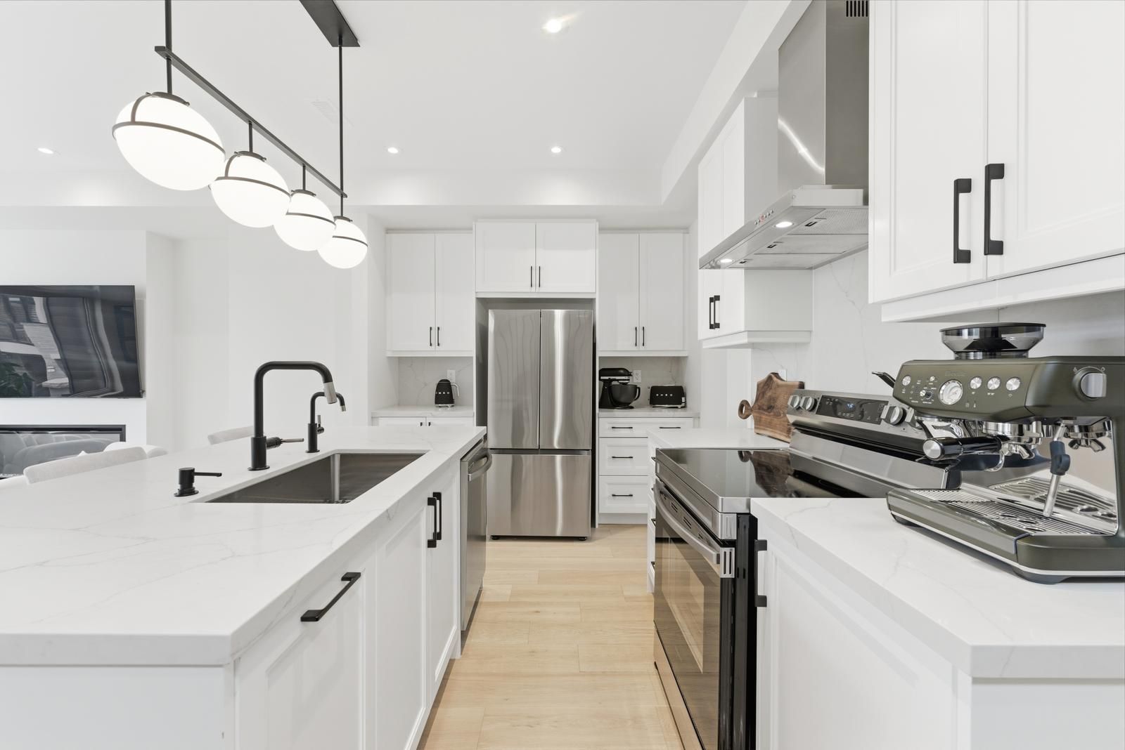 Welcome to 32 holyrood crescent in kleinburg! This beautifully upgraded end-unit 3-storey townhome offers over 2,200 sqft of above-grade living space, featuring 3 bedrooms and 3 bathrooms, and showcases quality finishes and thoughtful upgrades throughout, blending modern design with everyday functionality. The main level features dual frontage, enhancing both curb appeal and accessibility, along with direct access to the garage, a convenient laundry area, and a bright, versatile space ideal for a home office, additional living area, or children's playroom. The second level is designed for both everyday living and entertaining, featuring an open-concept layout that seamlessly connects the living room, dining area, and kitchen. The upgraded kitchen is complete with quartz countertops and a stunning book-matched backsplash that serves as a sophisticated focal point, while the dining is enhanced by a custom dry bar with a built-in wine fridge and offers a walkout to a private balcony for seamless indoor-outdoor living. A conveniently located powder room completes this level. The third level offers three generously sized bedrooms, including a primary retreat with a walk-in closet and a 3-piece ensuite, while both upgraded bathrooms on this level feature quartz vanities, adding a cohesive and elevated finish throughout. Located in the prestigious kleinburg community, this home is just minutes from highway 427, top-rated schools, parks, scenic trails, and the charming kleinburg village, offering easy access to boutique shops, cafes, restaurants, and everyday essentials within a quiet, family-friendly neighbourhood.