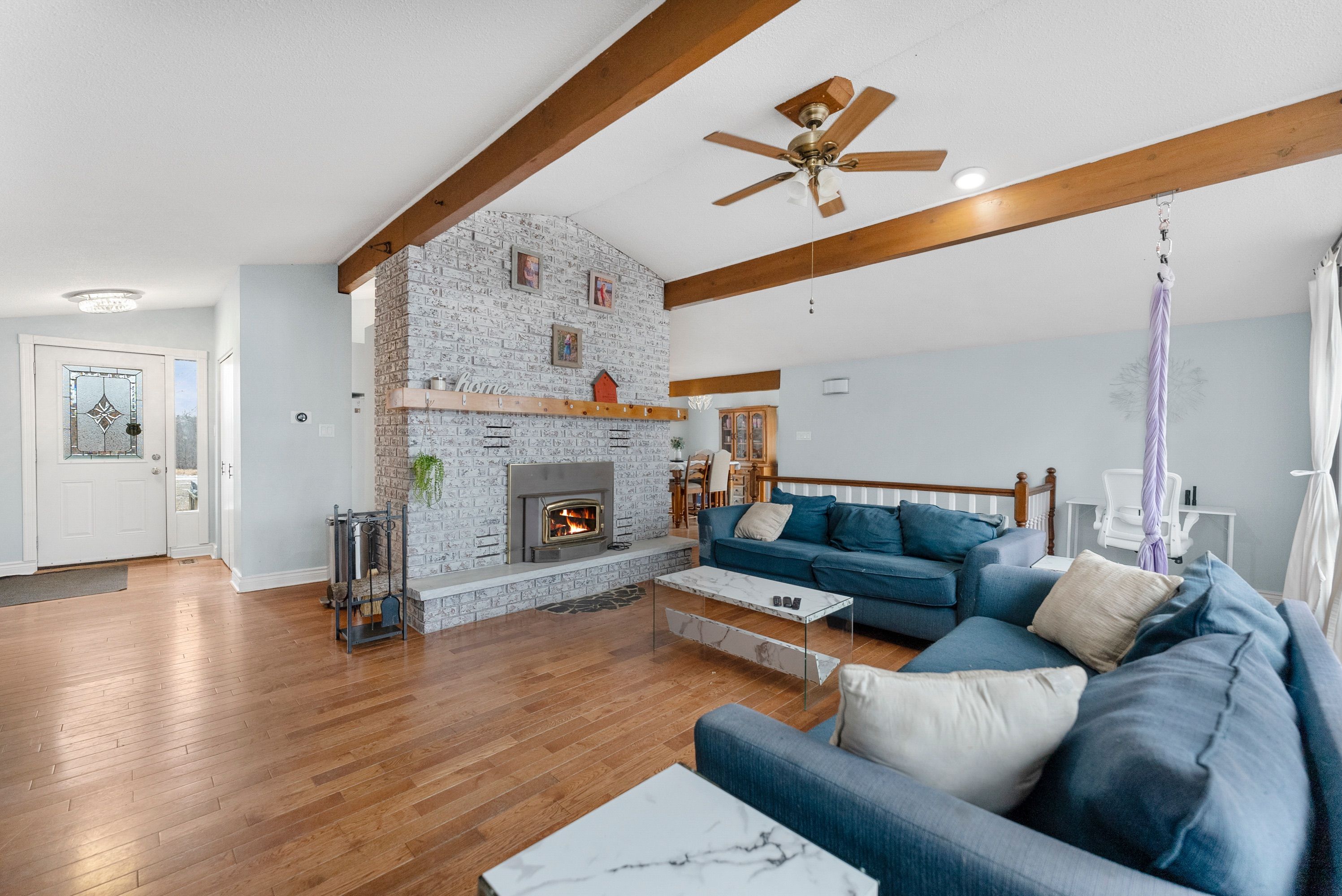 This home is perfectly situated with just over an acre lot surrounded by country views of fields, mature trees and cobden lake in the distance. With the convenience of being 8 minutes from the town of cobden which includes a public school, community rink, busy main street core, public boat launch and beach. Cozy fireplaces with huge stone mantels on both levels of the home with two spacious living room areas. Large windows letting light in that keeps the home inviting and bright year round with accents of wood in the cathedral ceiling. Featuring 4 bedrooms, 2 bathrooms, a garage with entry to the home, and an above ground pool and hot tub. Either your enjoying a bbq over looking the lake watching the sun set or watching nature stroll by while you soak in the hot tub enjoying your country property.