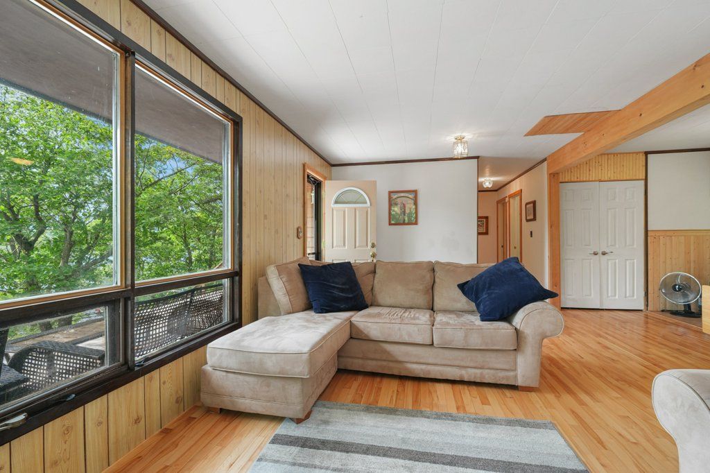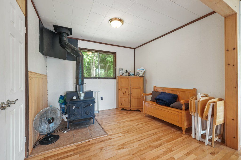 • Comfortable interior with hardwood floors and a cozy wood stove.