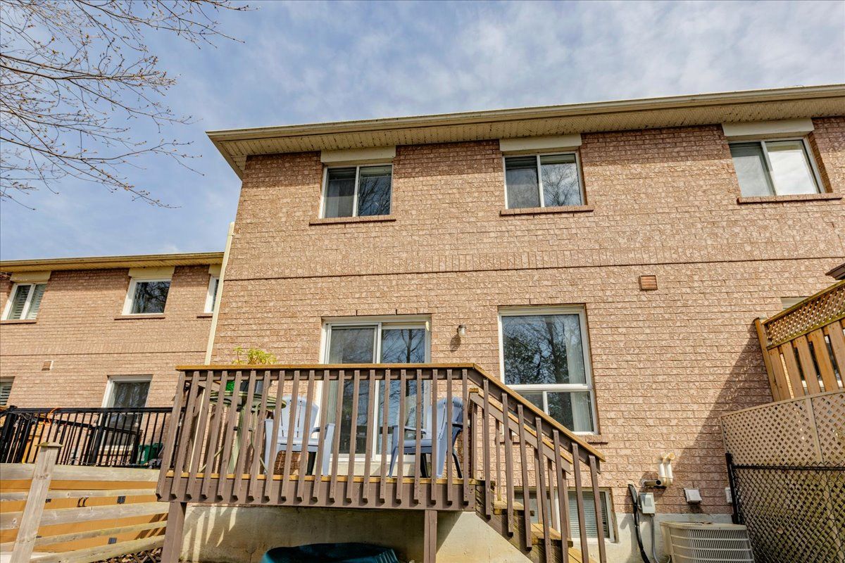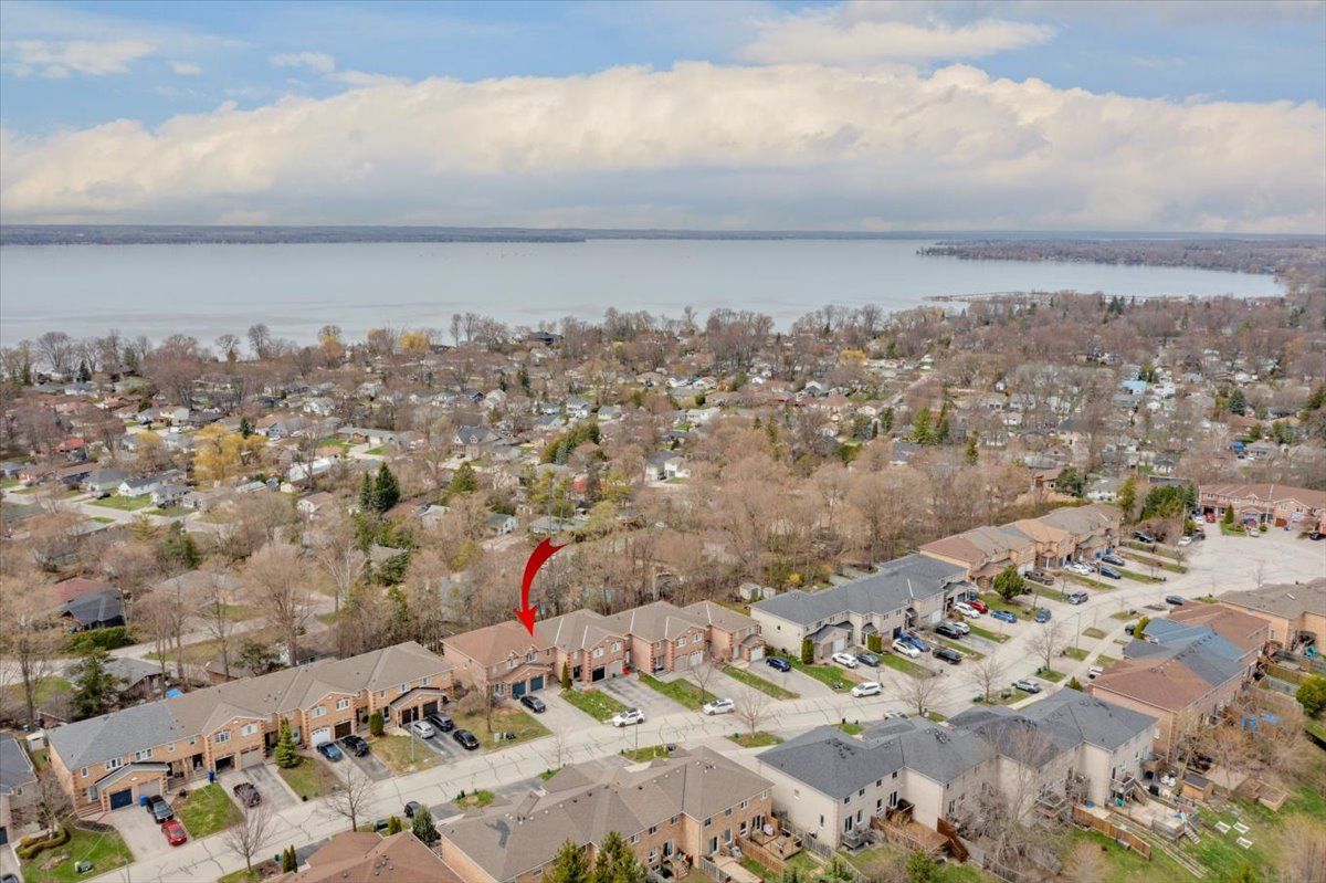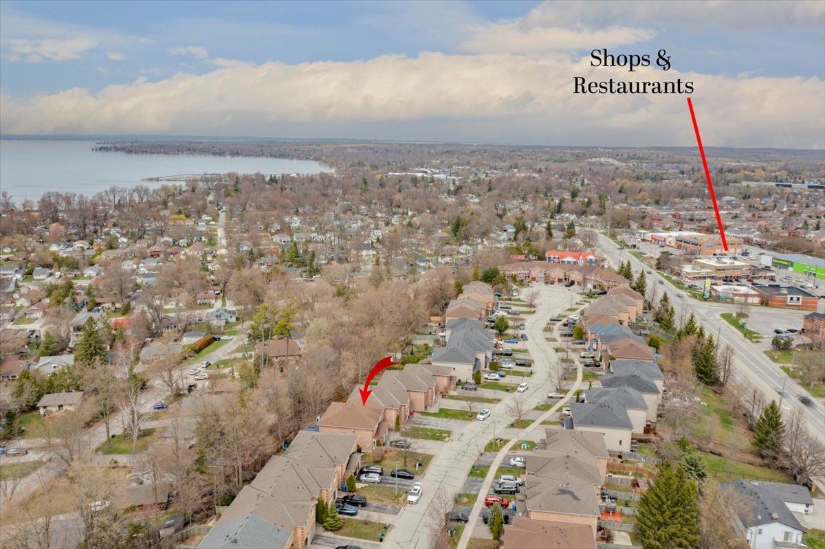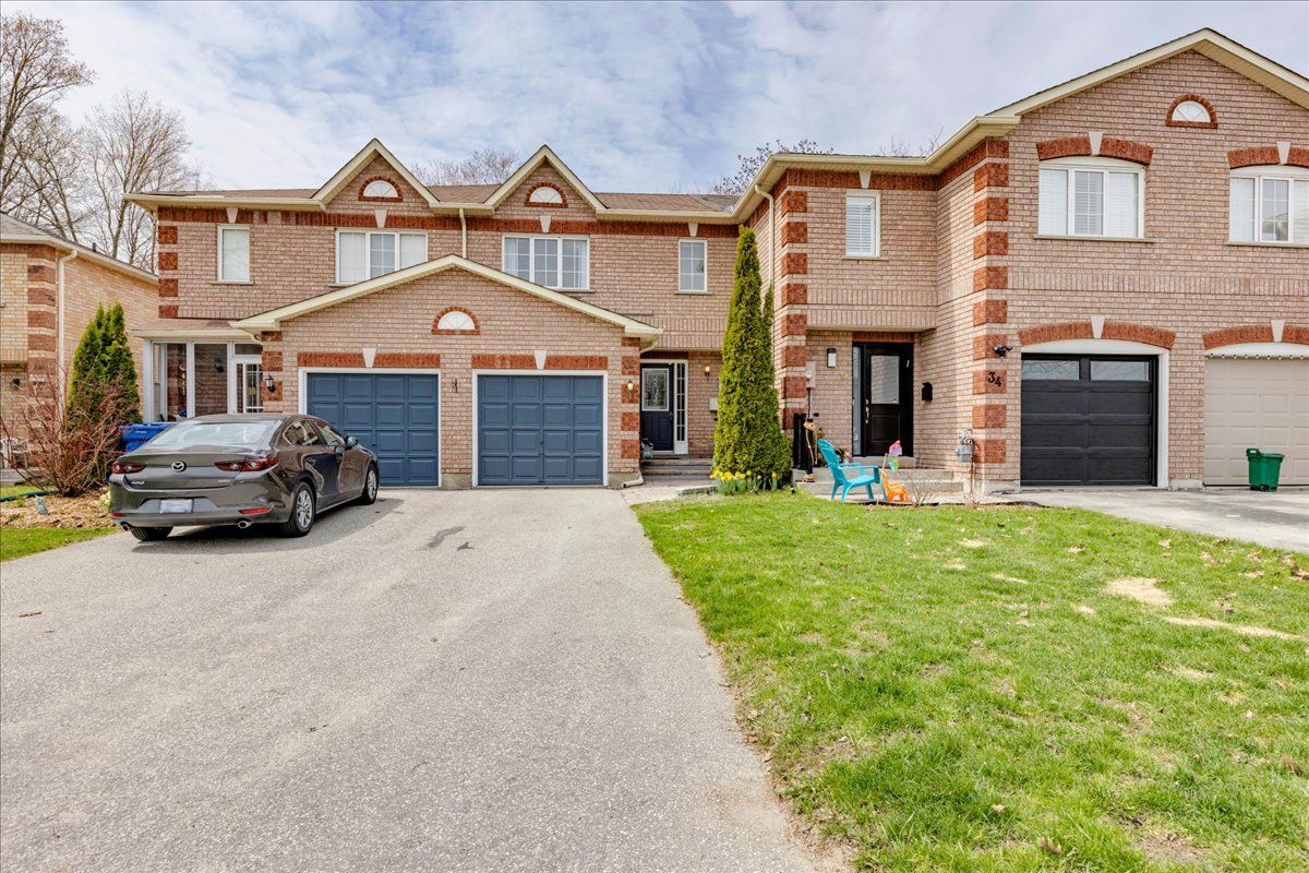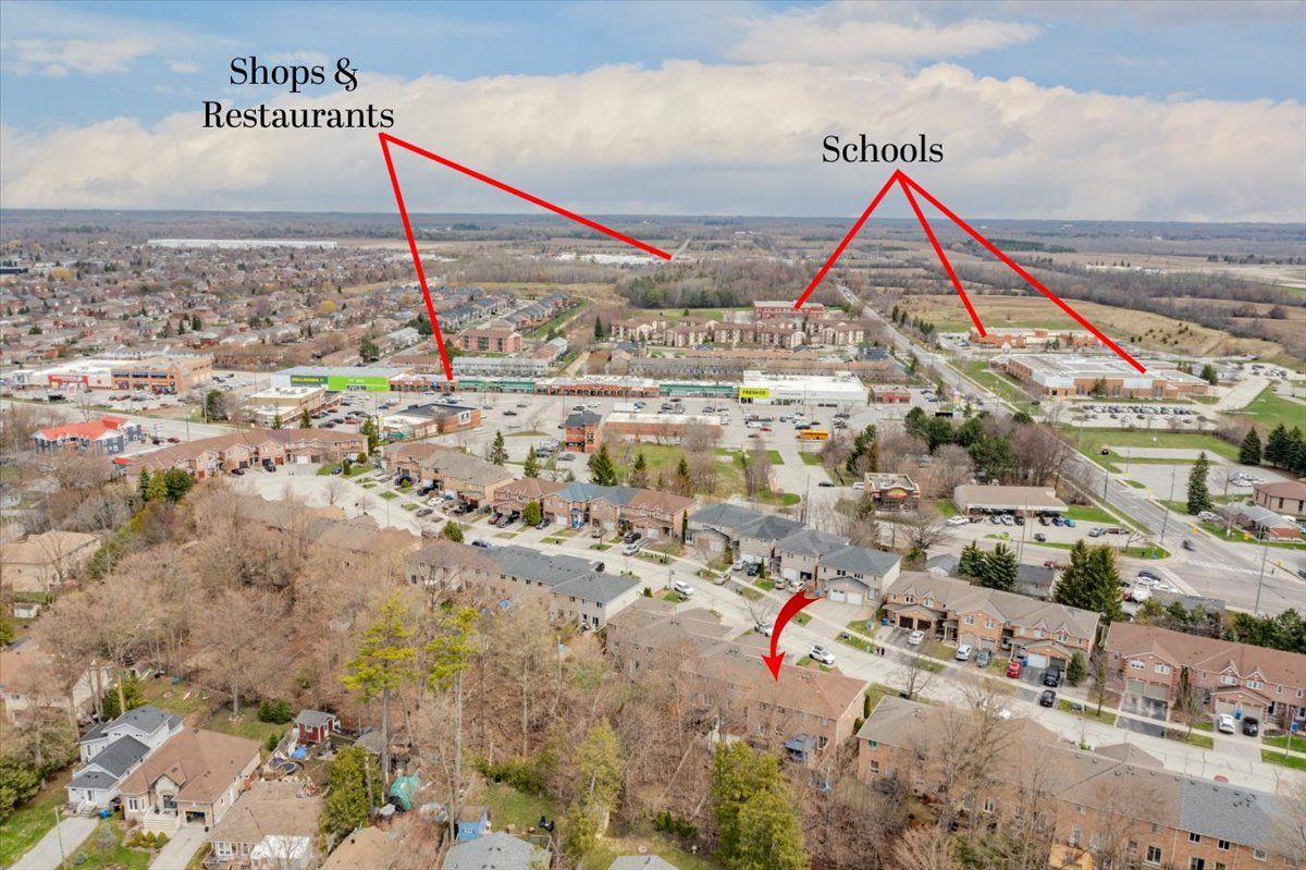Welcome to this well maintained freehold brick townhome, tucked away on a quiet, family friendly court just minutes from schools, shopping, and lake simcoe. Offering approximately 1,300 sq ft, this bright 2-storey home features 3 bedrooms and 2 bathrooms, perfect for low-maintenance living. The main floor welcomes you with a bright foyer with italian porcelain tiles and a convenient 2-piece bath, leading into an open concept living and dining area alongside a functional kitchen. Walk out to a private deck overlooking a fenced, tree-lined backyard, complete with a charming lilac tree and peony plant. Upstairs, you'll find three bedrooms, including a spacious primary bedroom with semi-ensuite access, a walk-in closet and a dedicated office nook, ideal for working from home. The unfinished basement offers excellent potential for additional living space or storage. Enjoy the convenience of an attached garage and a driveway with parking for two vehicles, with no sidewalk for added ease. Located close to parks, transit, and everyday amenities, this is a fantastic opportunity for first-time buyers or growing families.