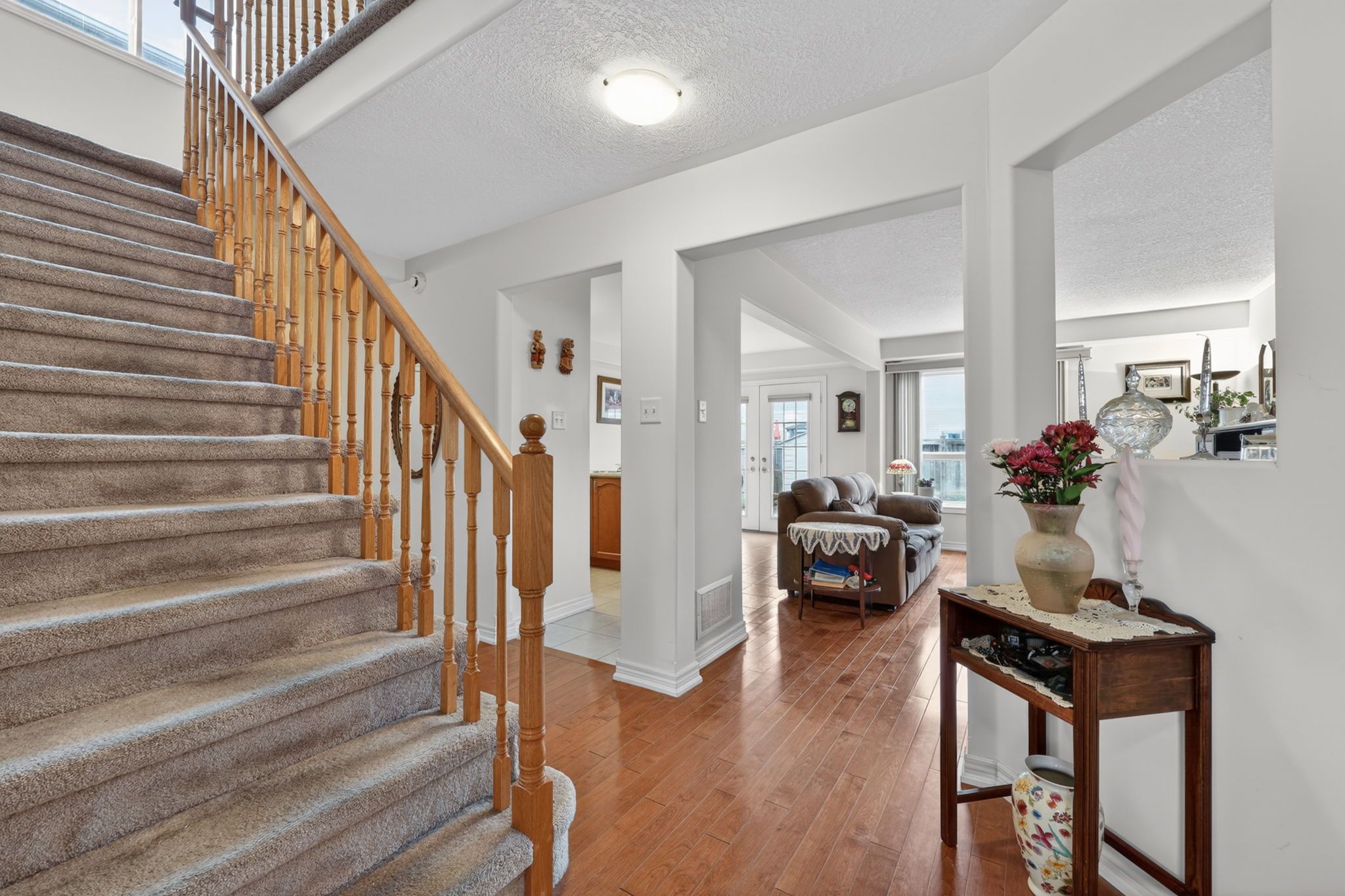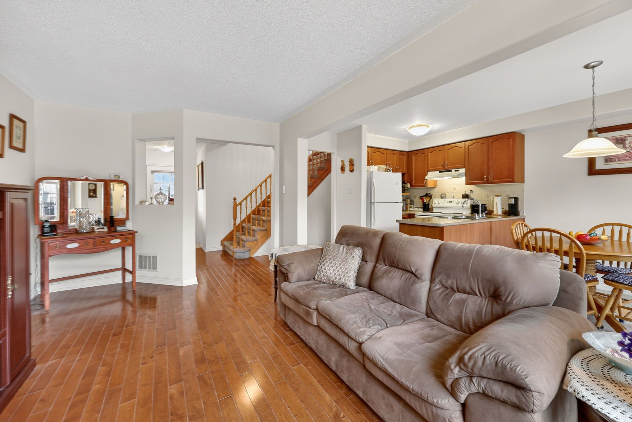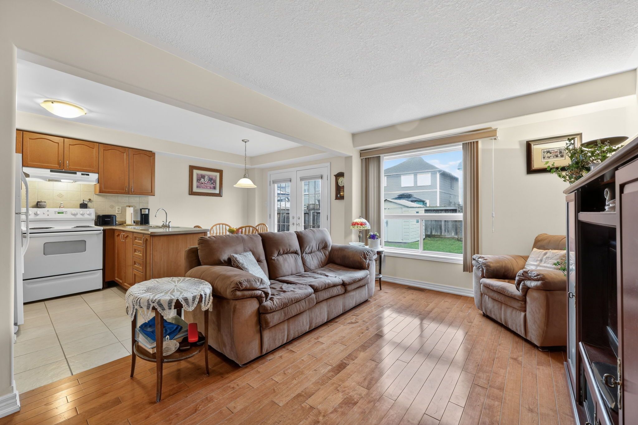 • Bright open-concept living area with hardwood flooring and large windows.