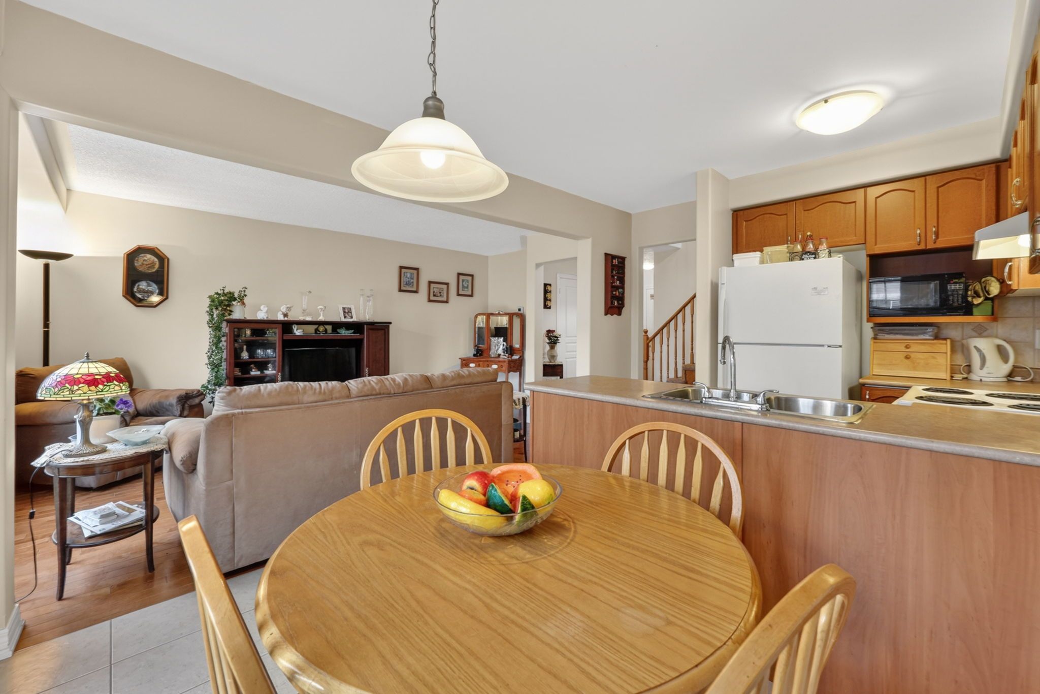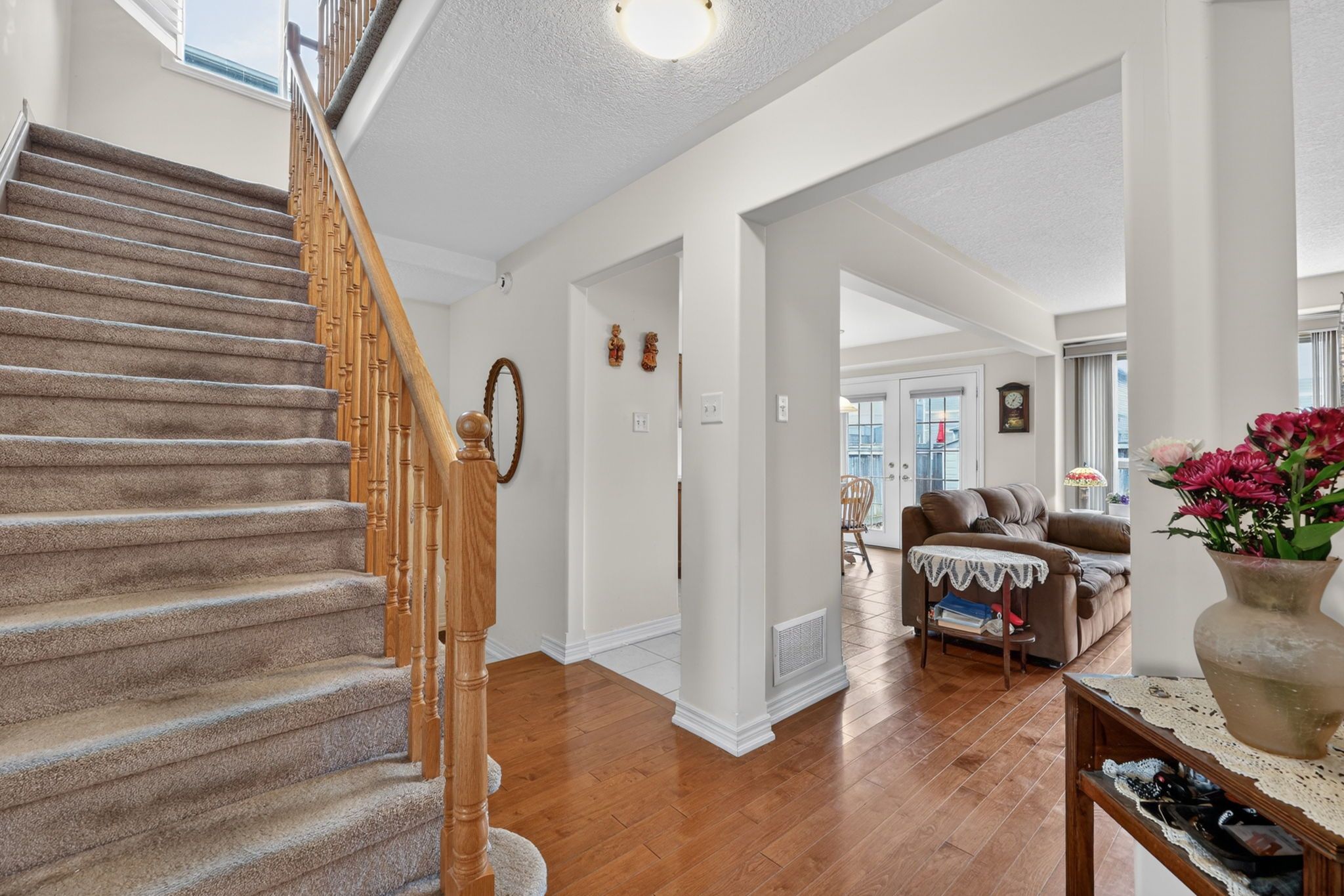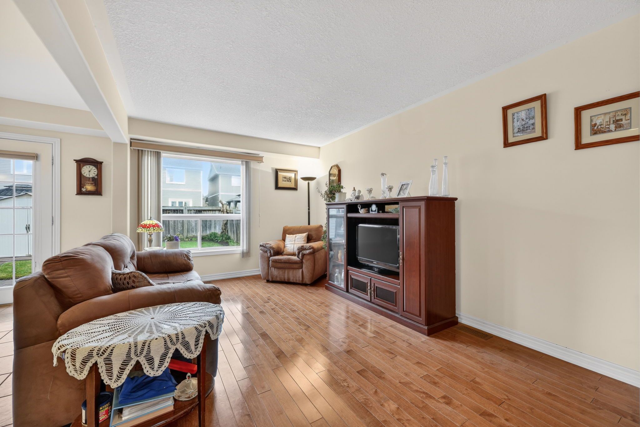 • Bright open-concept living area with hardwood flooring and large windows.