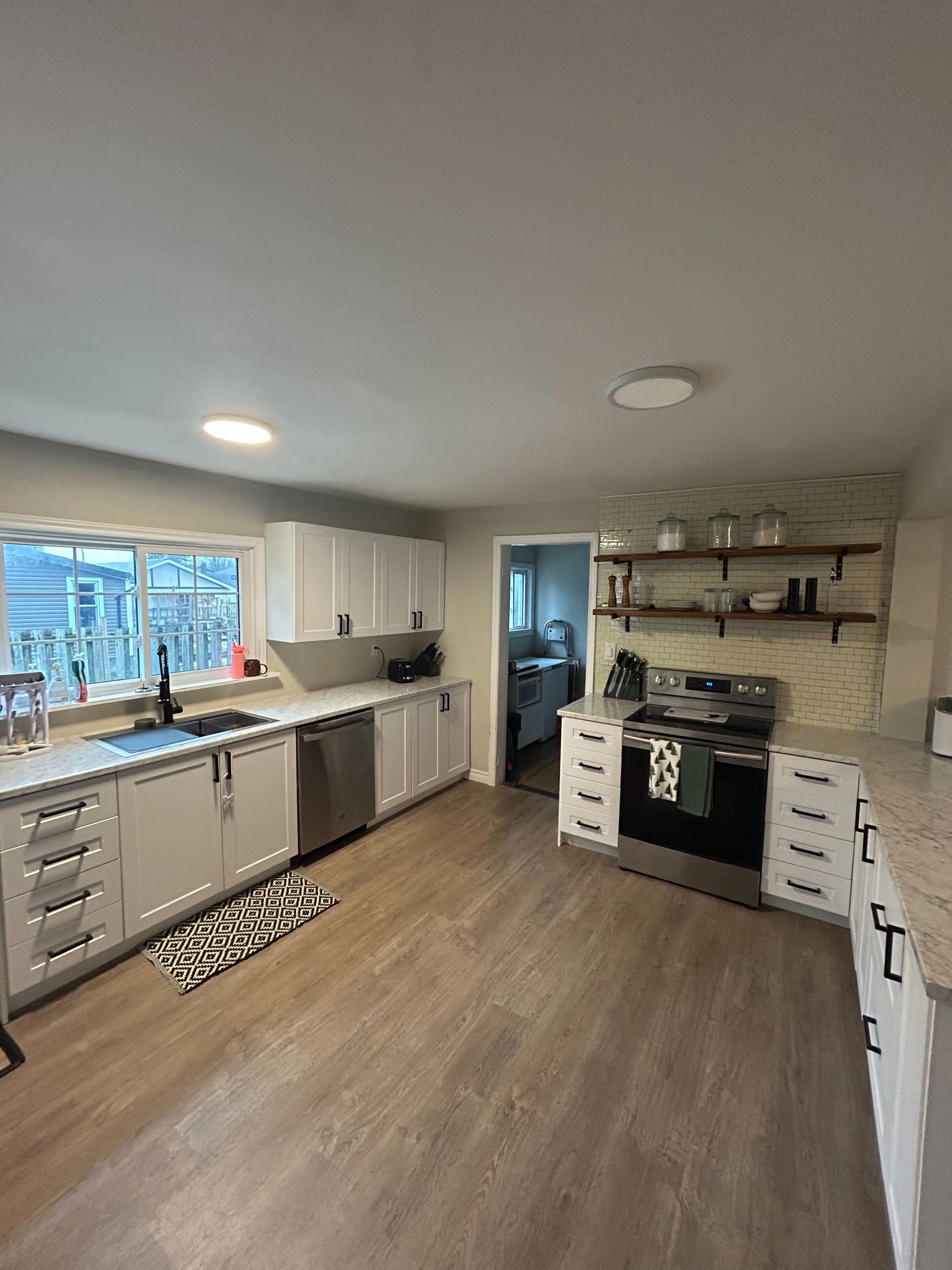 • New kitchen with ample cupboard space and large eat-in dining area.