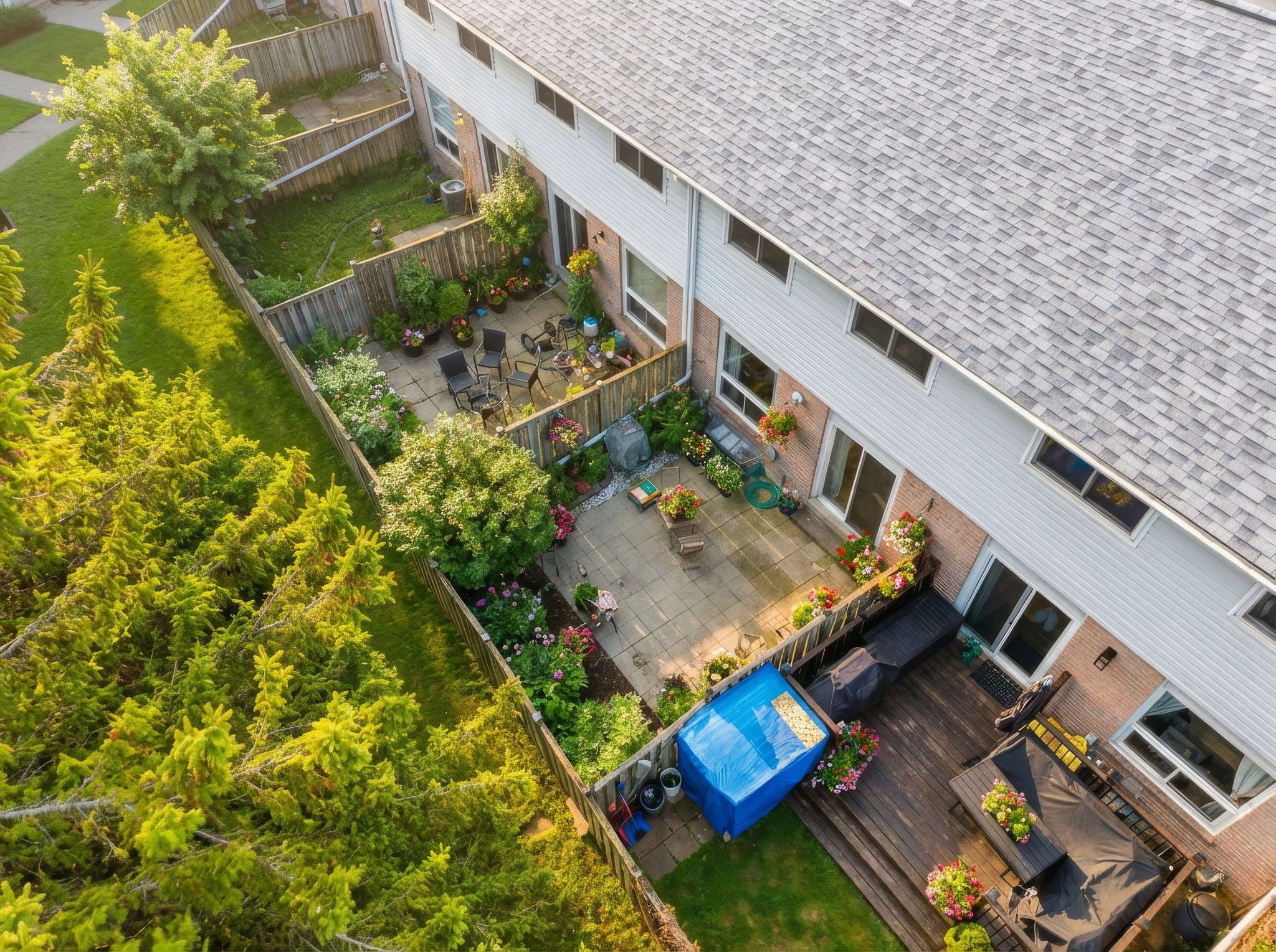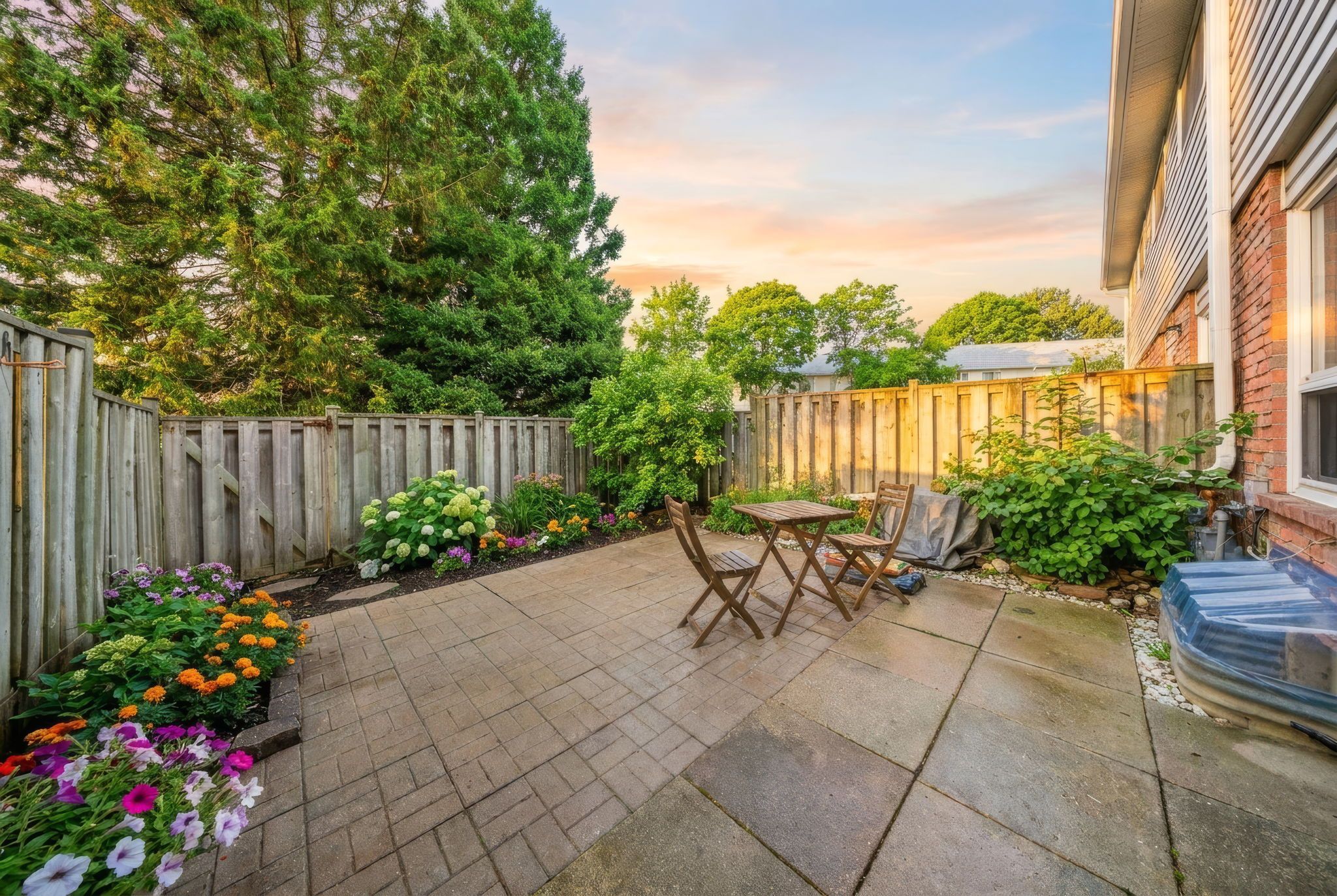 • Fully fenced yard backing onto a park, providing openness and greenery.