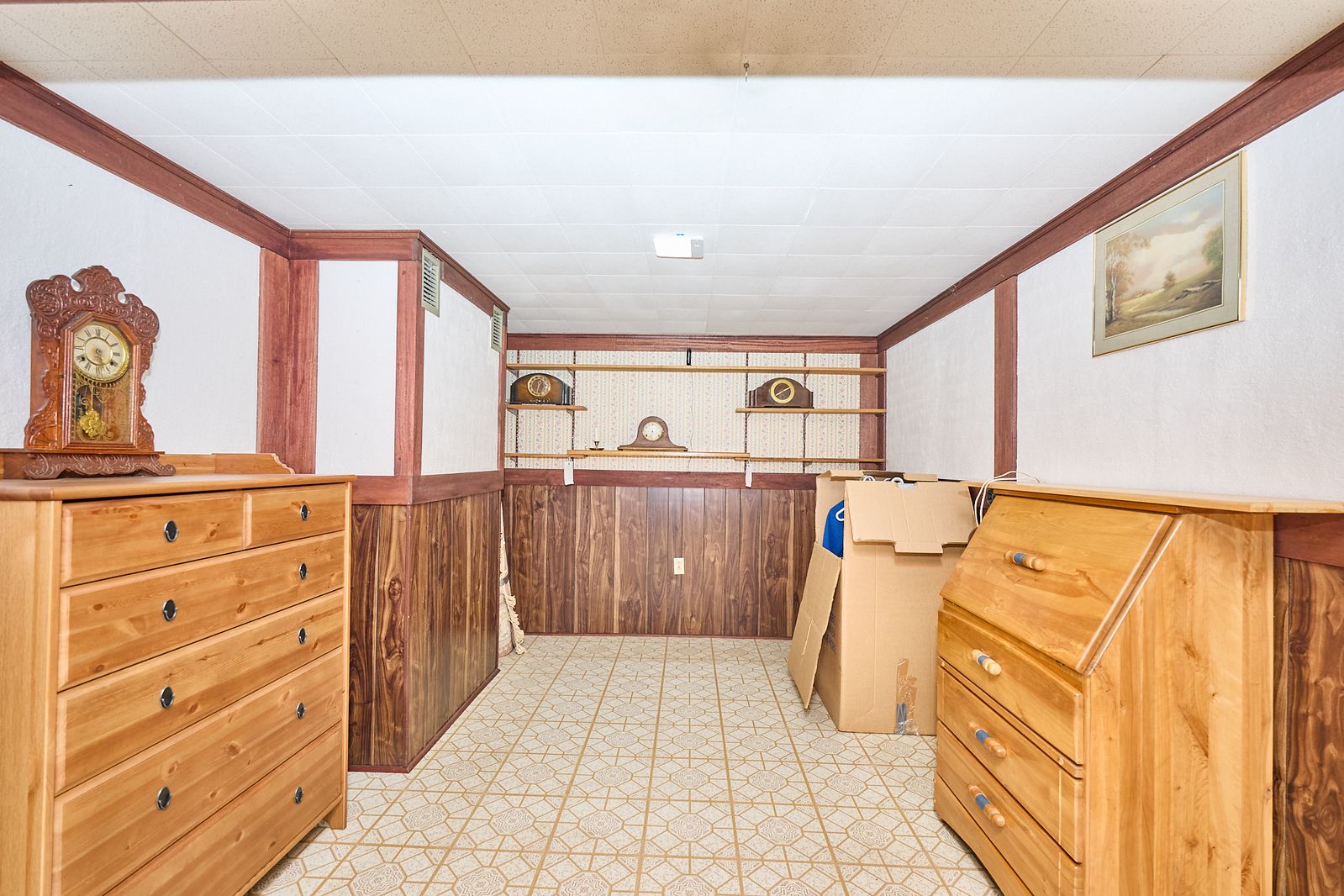 • Finished basement with a gas fireplace, workshop, and office space.