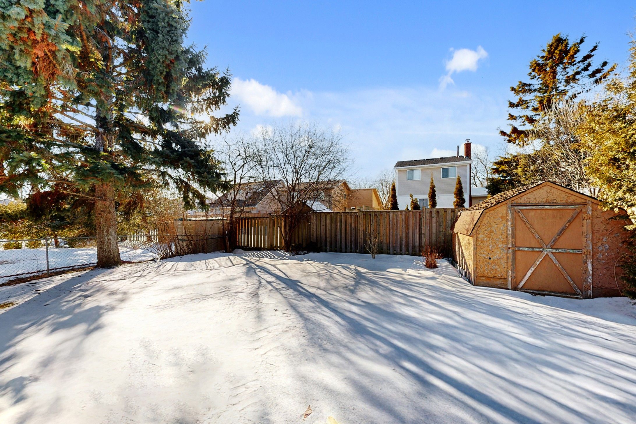 • Cozy backyard with mature trees, gardens, and patio for relaxation.