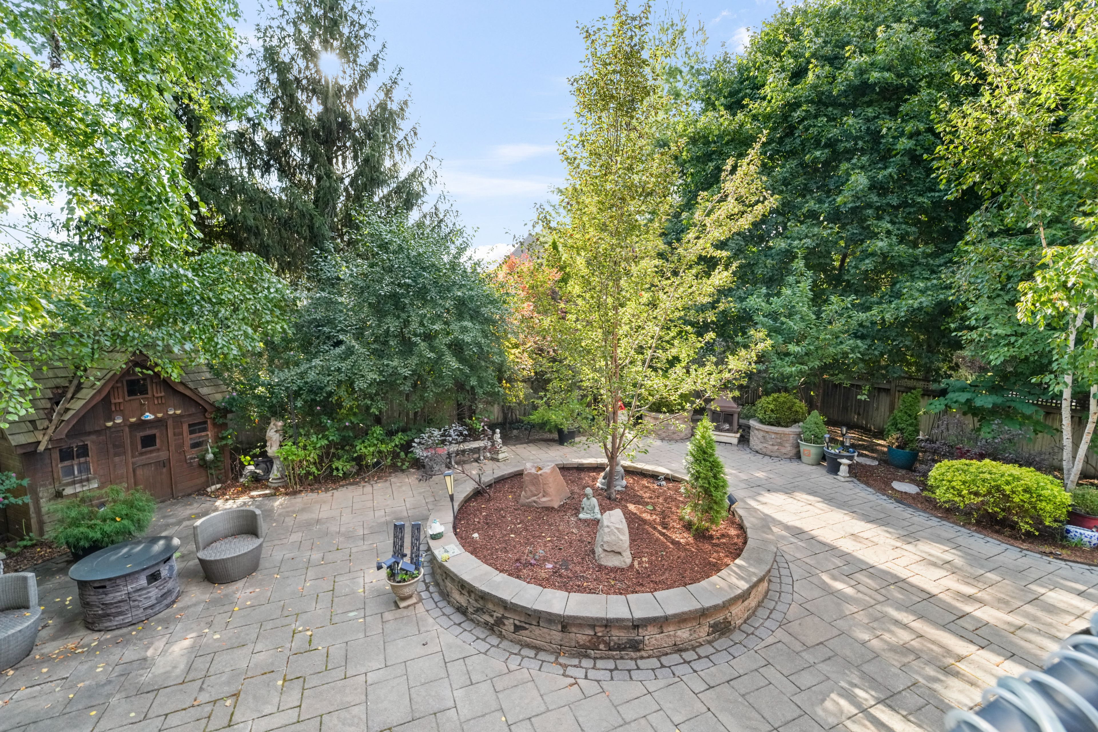 • Low-maintenance backyard with a brick patio and propane fire table.