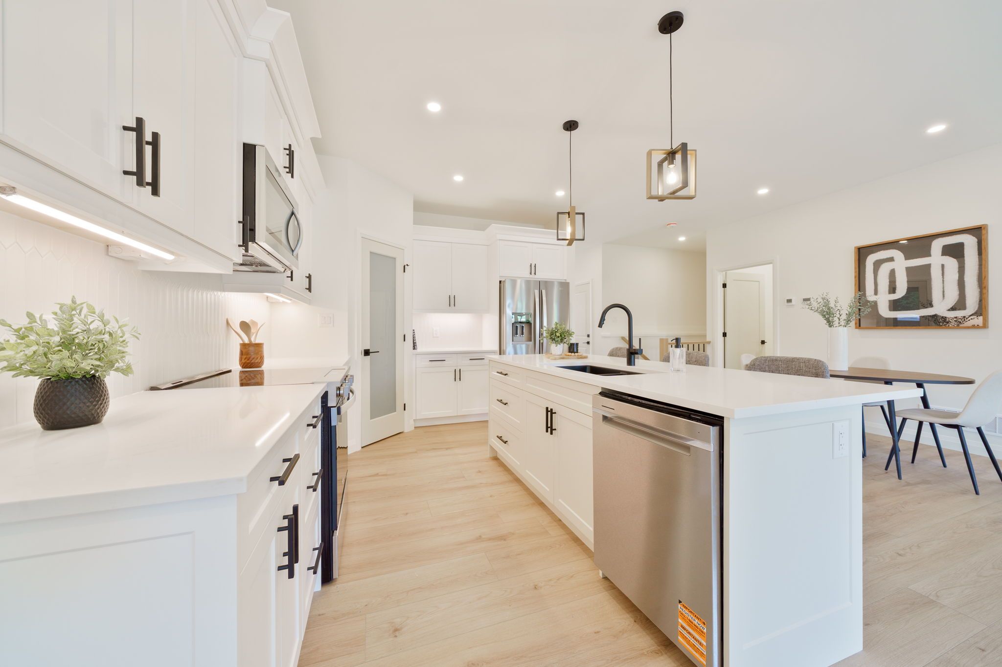 • Stylish kitchen boasts quartz countertops and durable wood cabinetry.