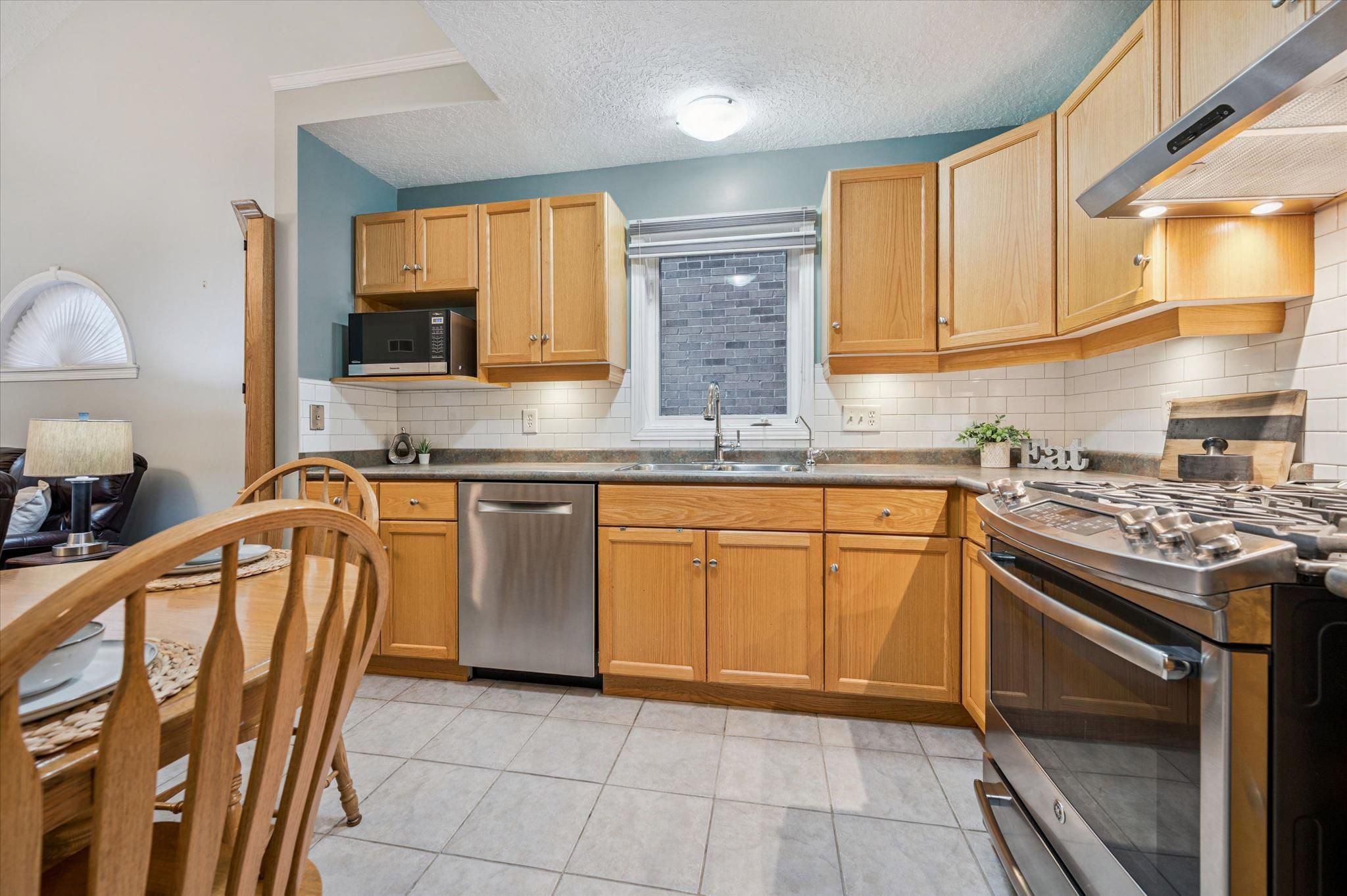 • Bright eat-in kitchen with high-end appliances and ample counter space.