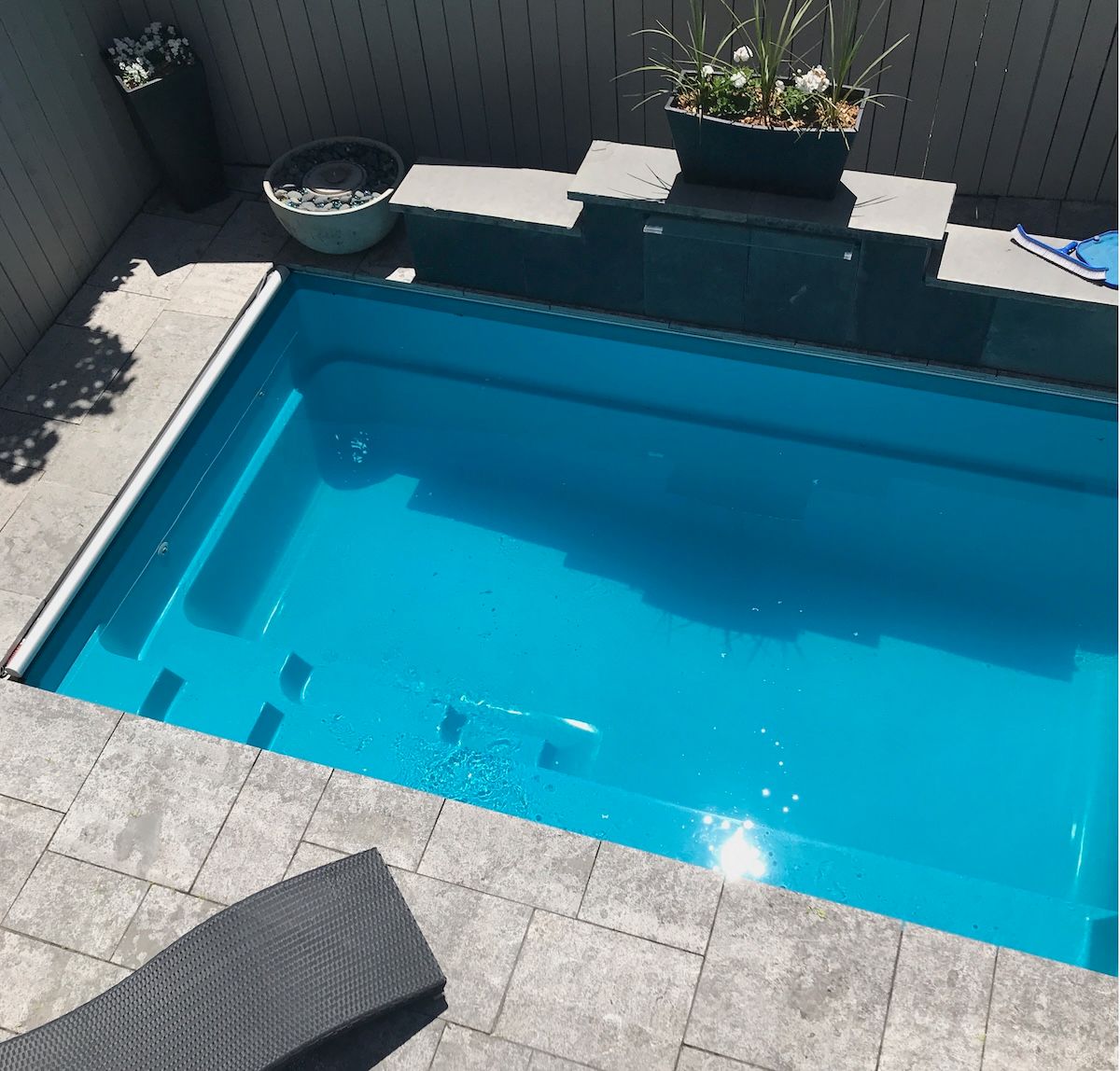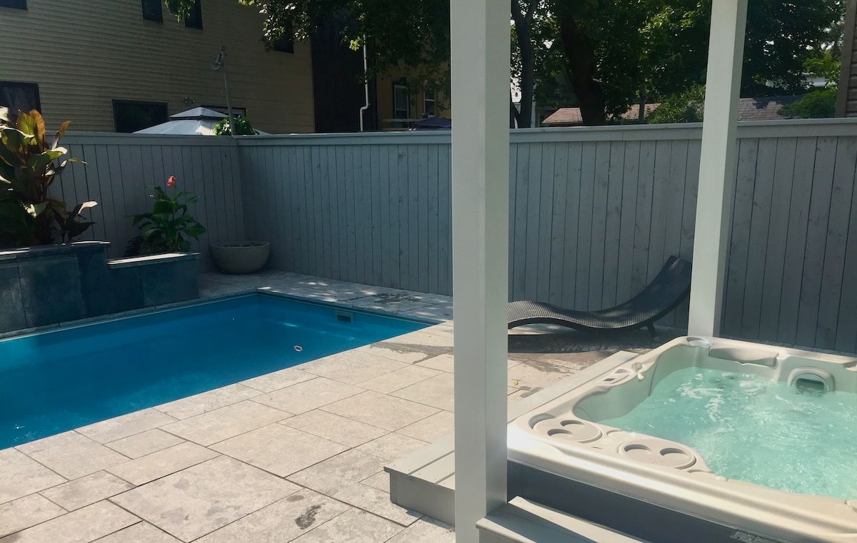 • Private backyard oasis with in-ground pool, hot tub, and interlocked patio.