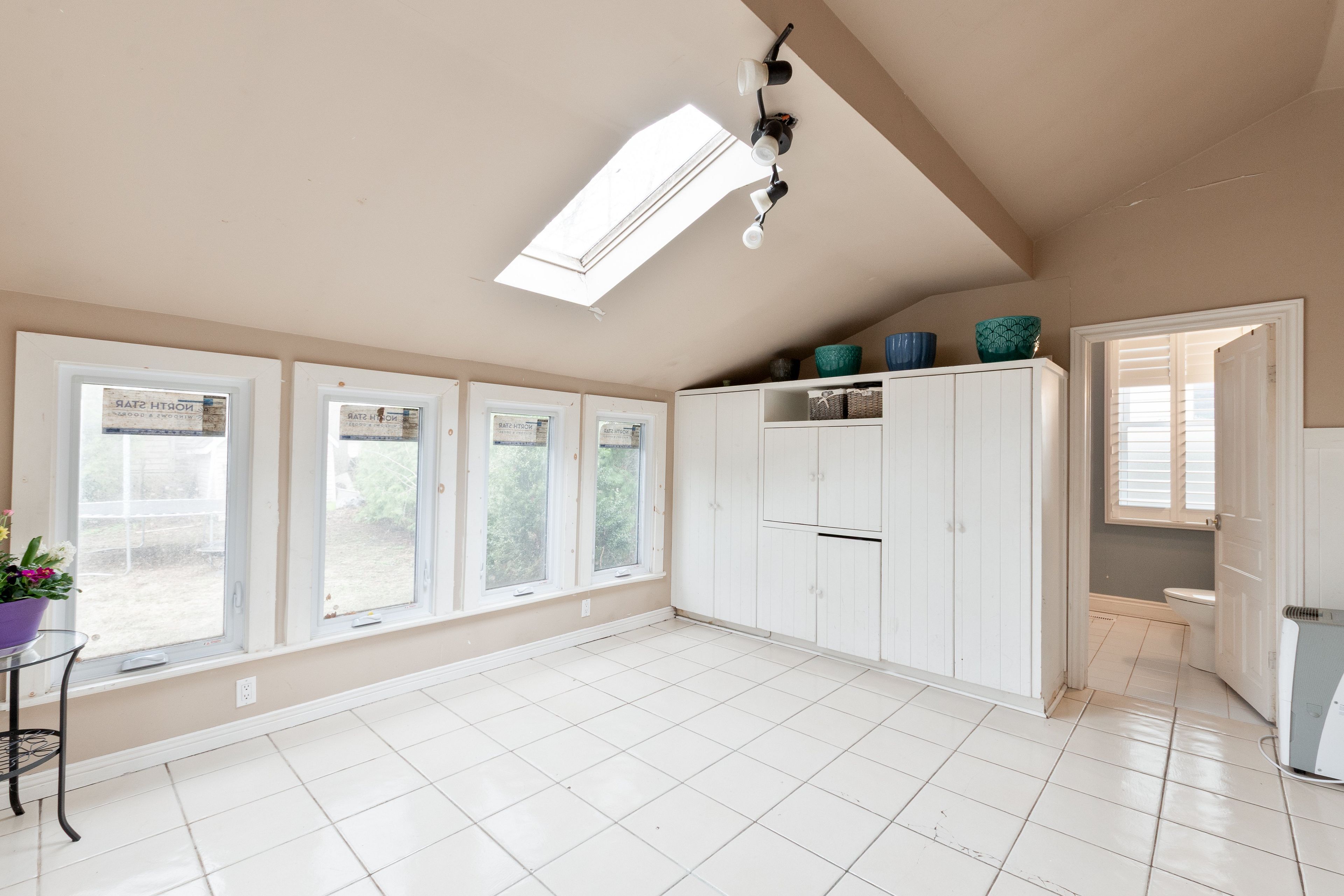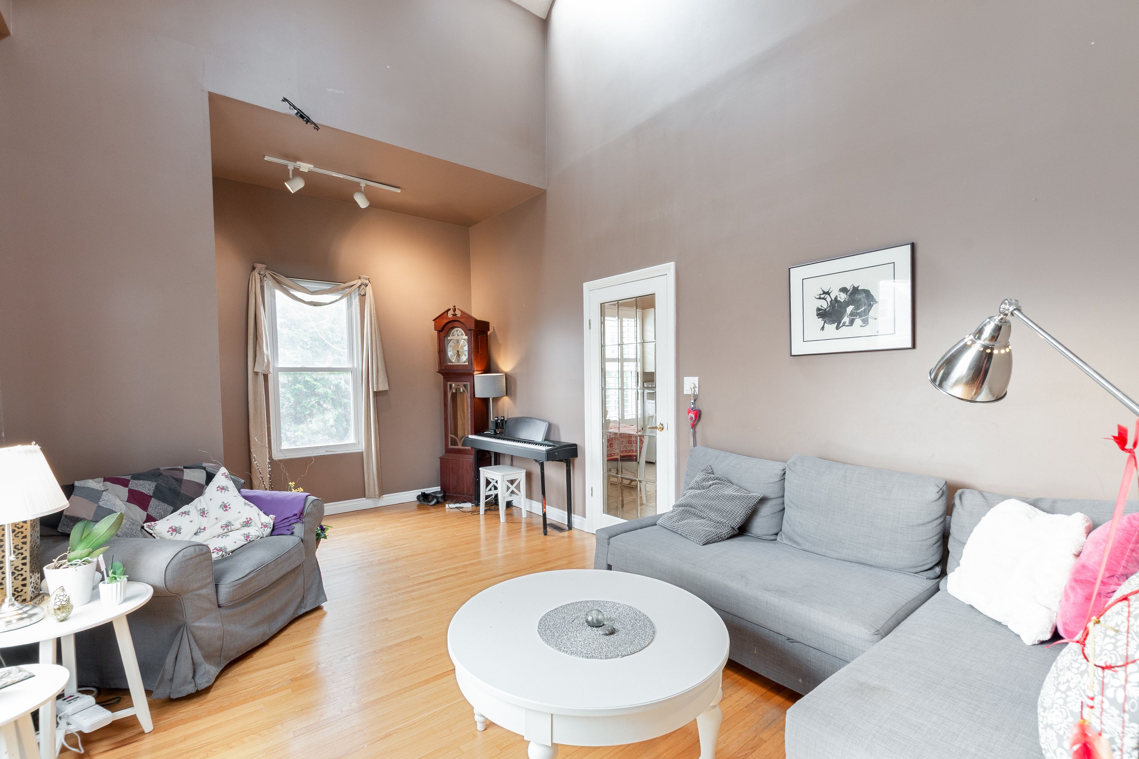 • Bright living room with cathedral ceilings and skylights for natural light.