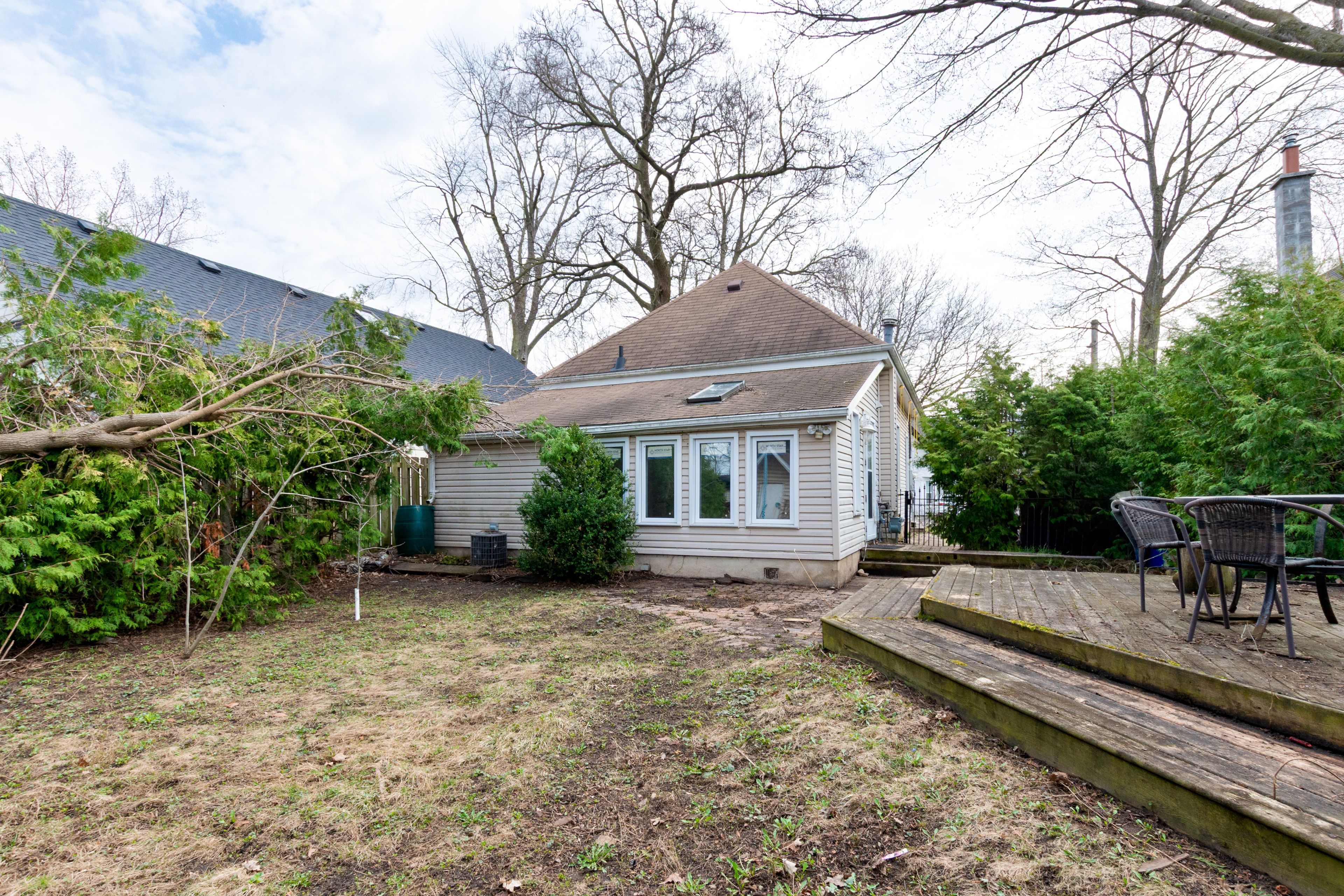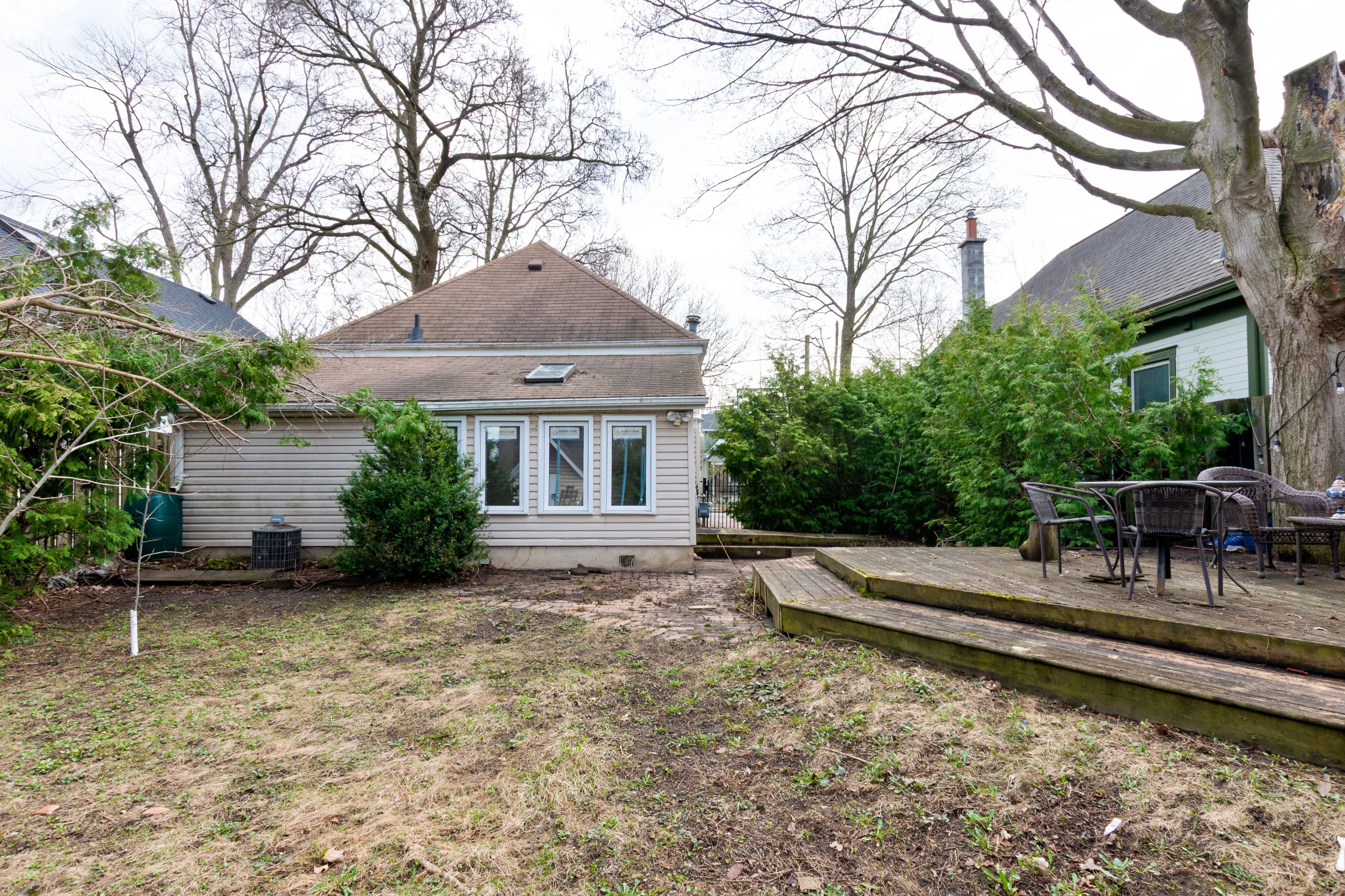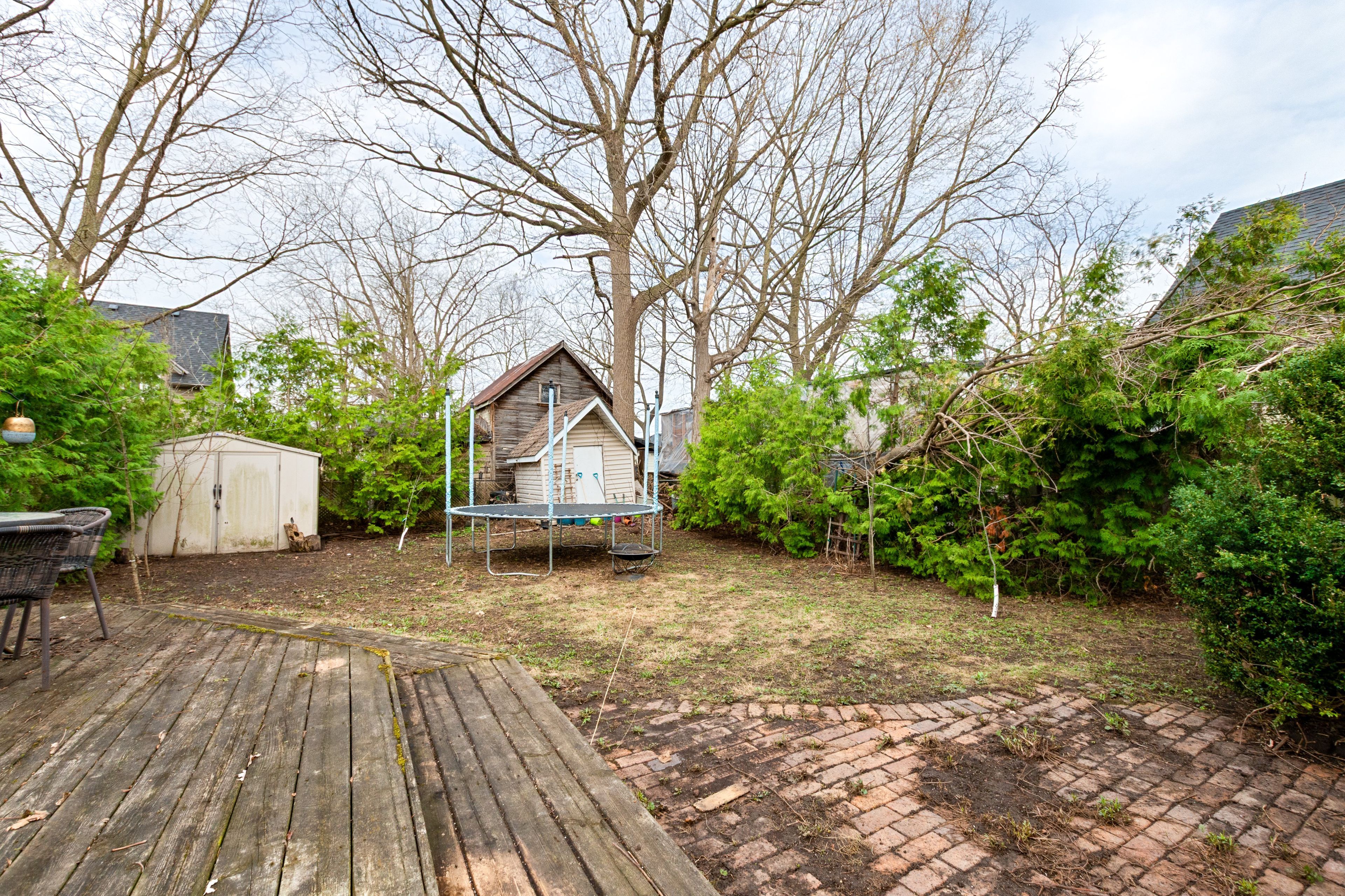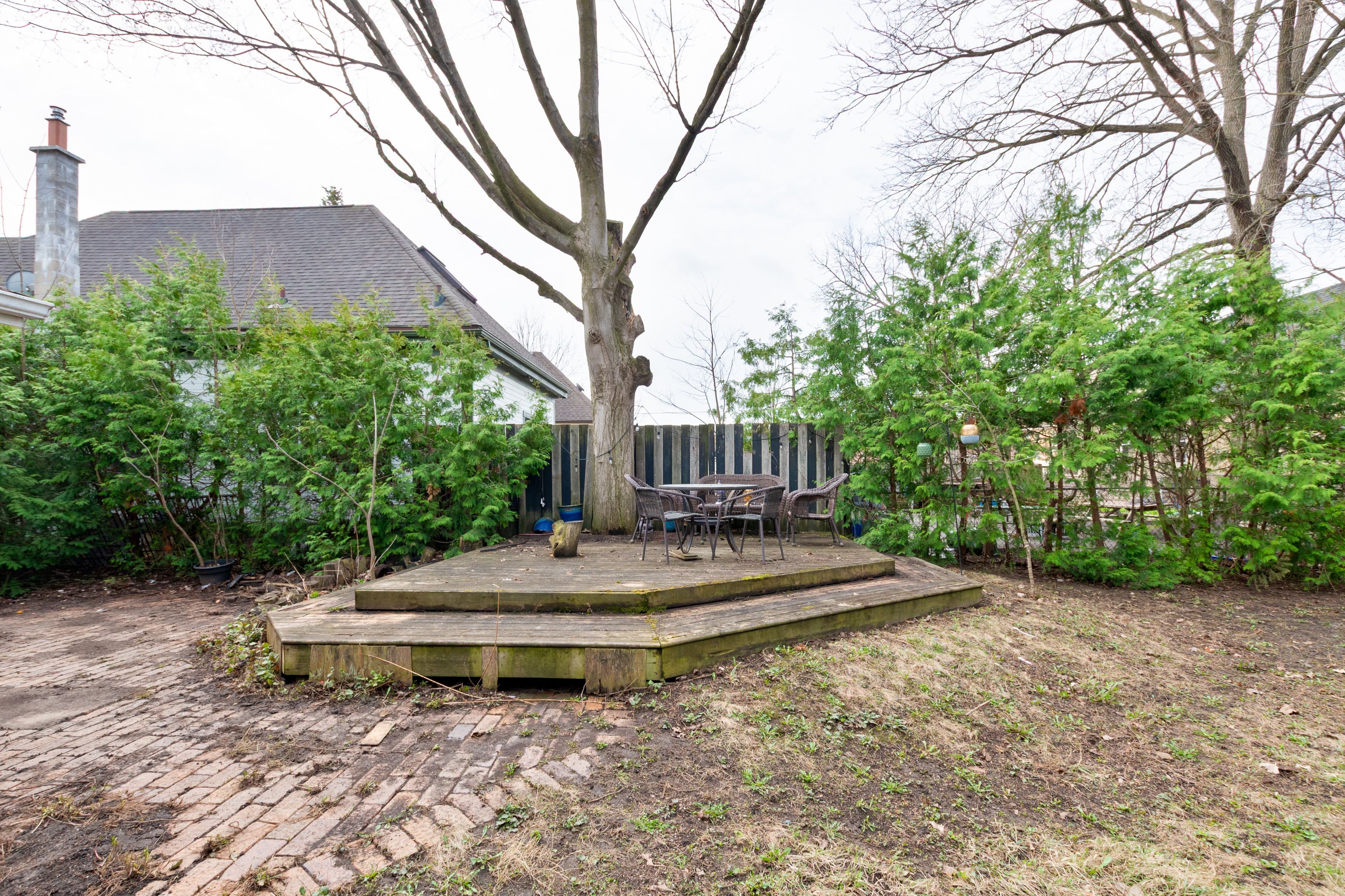 • Private backyard oasis with multi-level deck and mature trees.