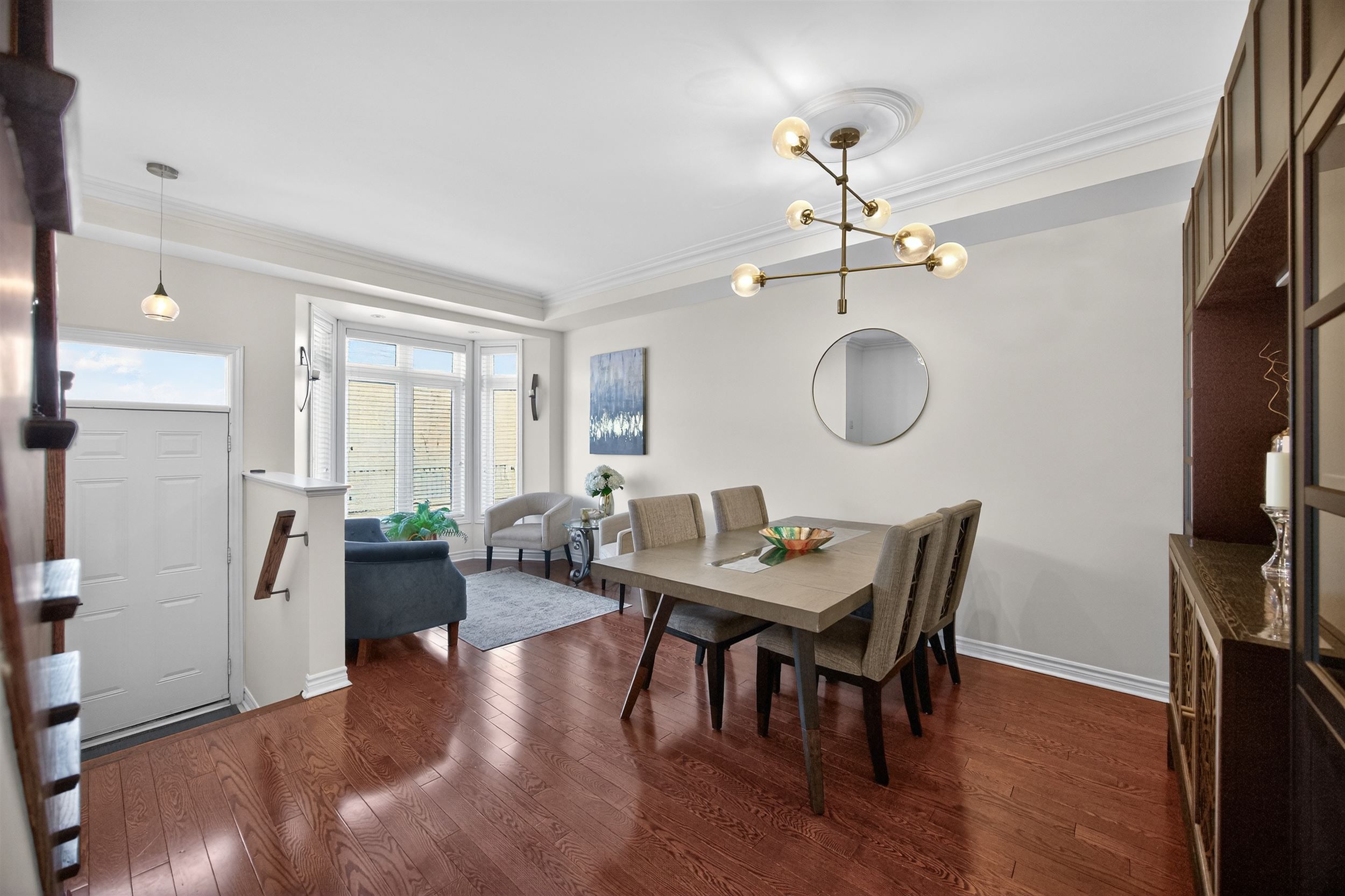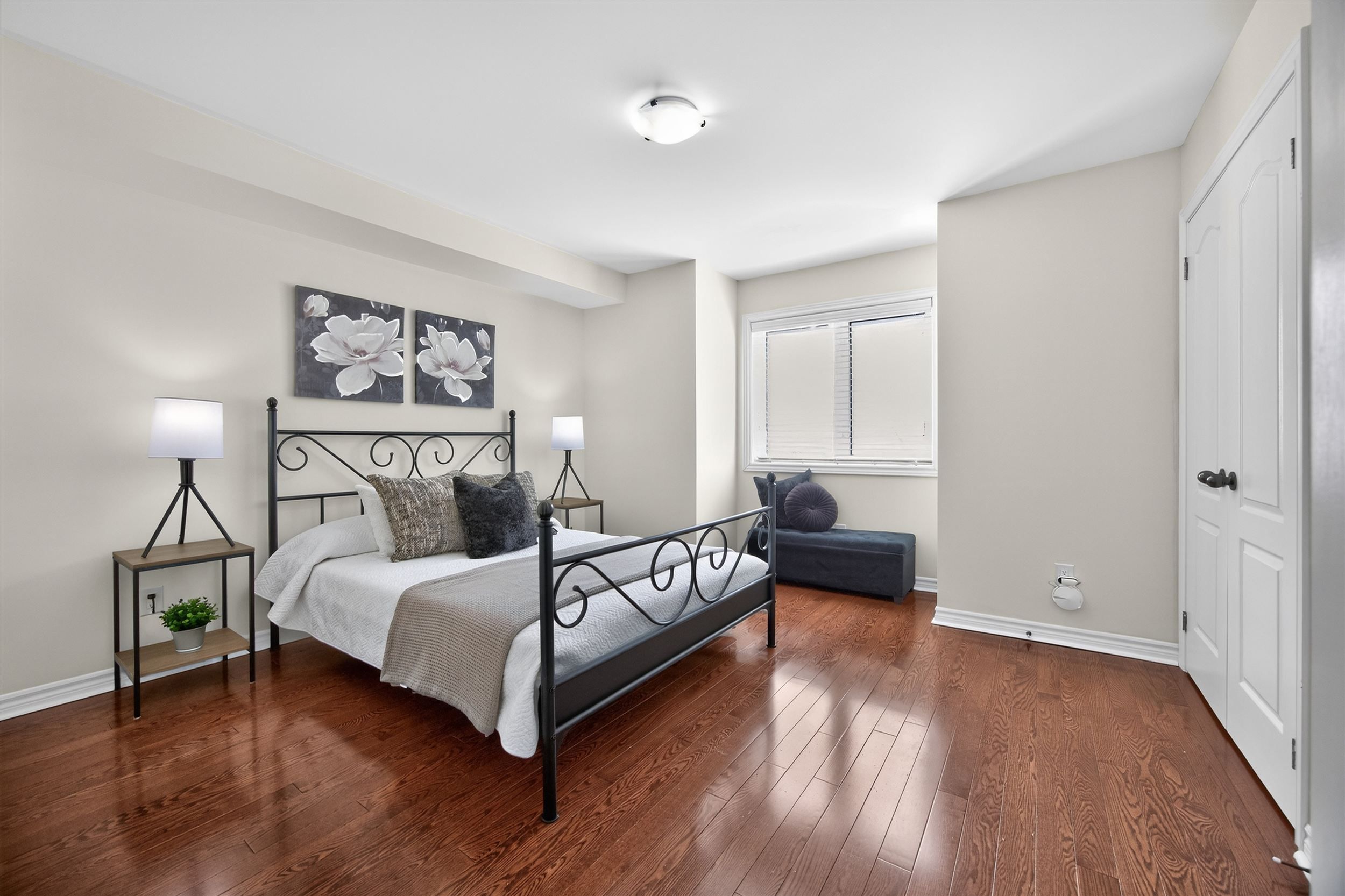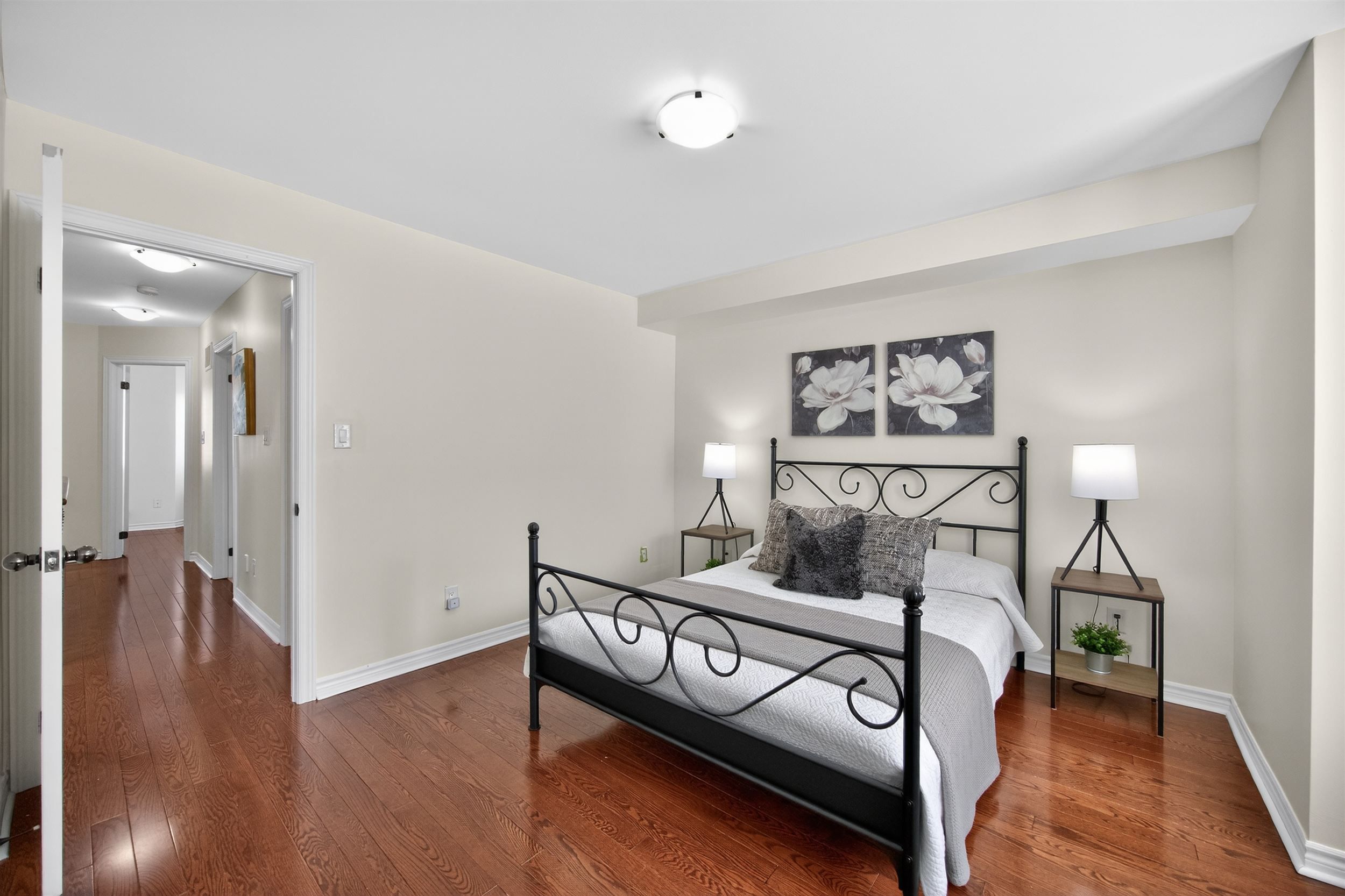 Rarely offered; a 4 bedroom, end unit in a well maintained freehold townhouse complex. Feels more like a semi. All 4 spacious bedrooms have double closets; lots of storage in this home. 3 bathrooms, and a laundry room conveniently located on the 2nd floor. The primary has a huge 5 piece ensuite and a juliette balcony. The classic kitchen has ample cabinetry, granite counters, pot lights, and a breakfast island. It also has french doors that open up to a private patio with gas hook up. Beautiful hardwood floors throughout, quality crown molding on the main floor, and staircases of hardwood with rod iron pickets. The lower level has a cozy family room with laminate floors, pot lights a direct access to the garage. The location is convenient to the 401 and walking distance to shopping that includes canadian tire, shoppers, dollarama and much more. Schools, a park with the community center is also walkable. If you are looking for more space in a location that can't be beat, check out this lovely home.