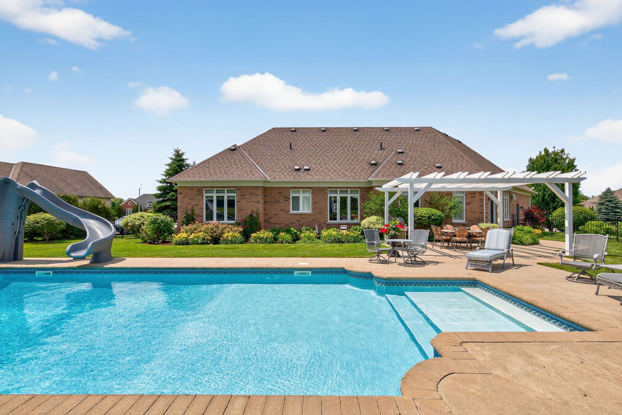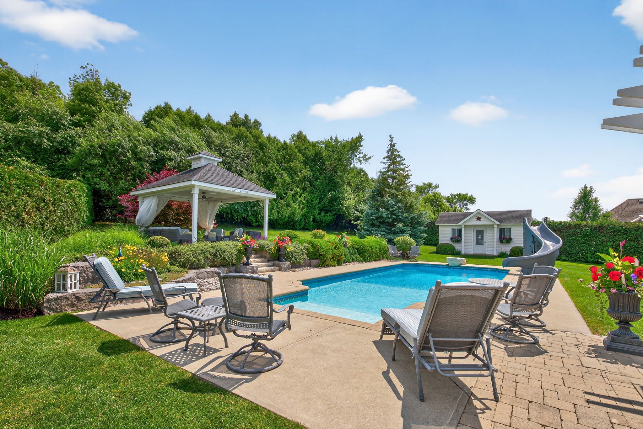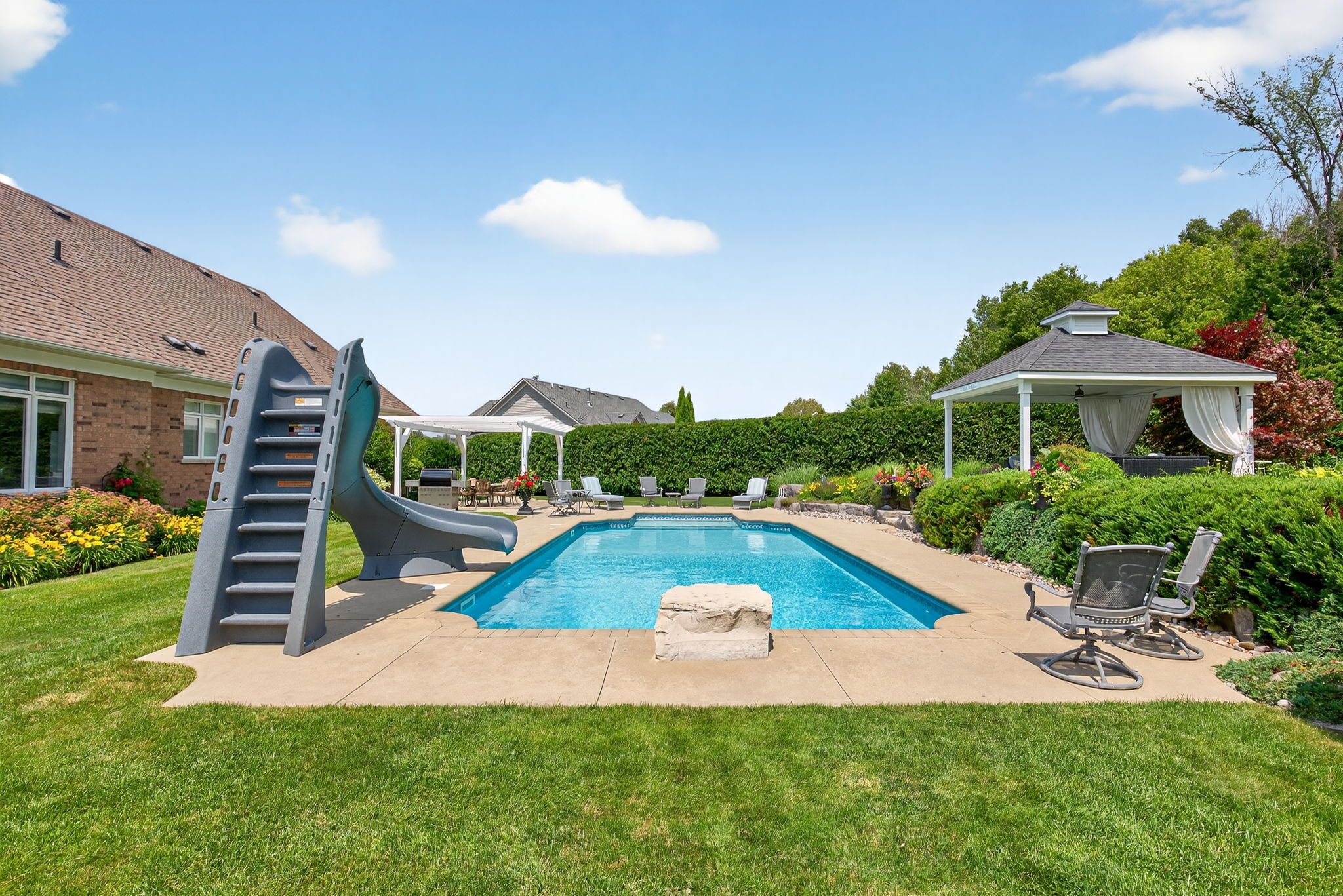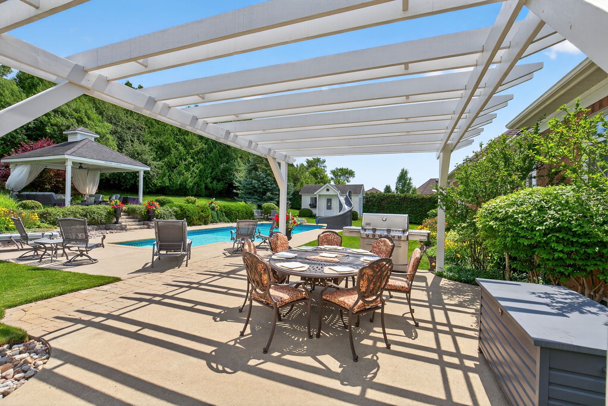 • Luxurious outdoor oasis with in-ground saltwater pool, gazebo, and dining pergola.