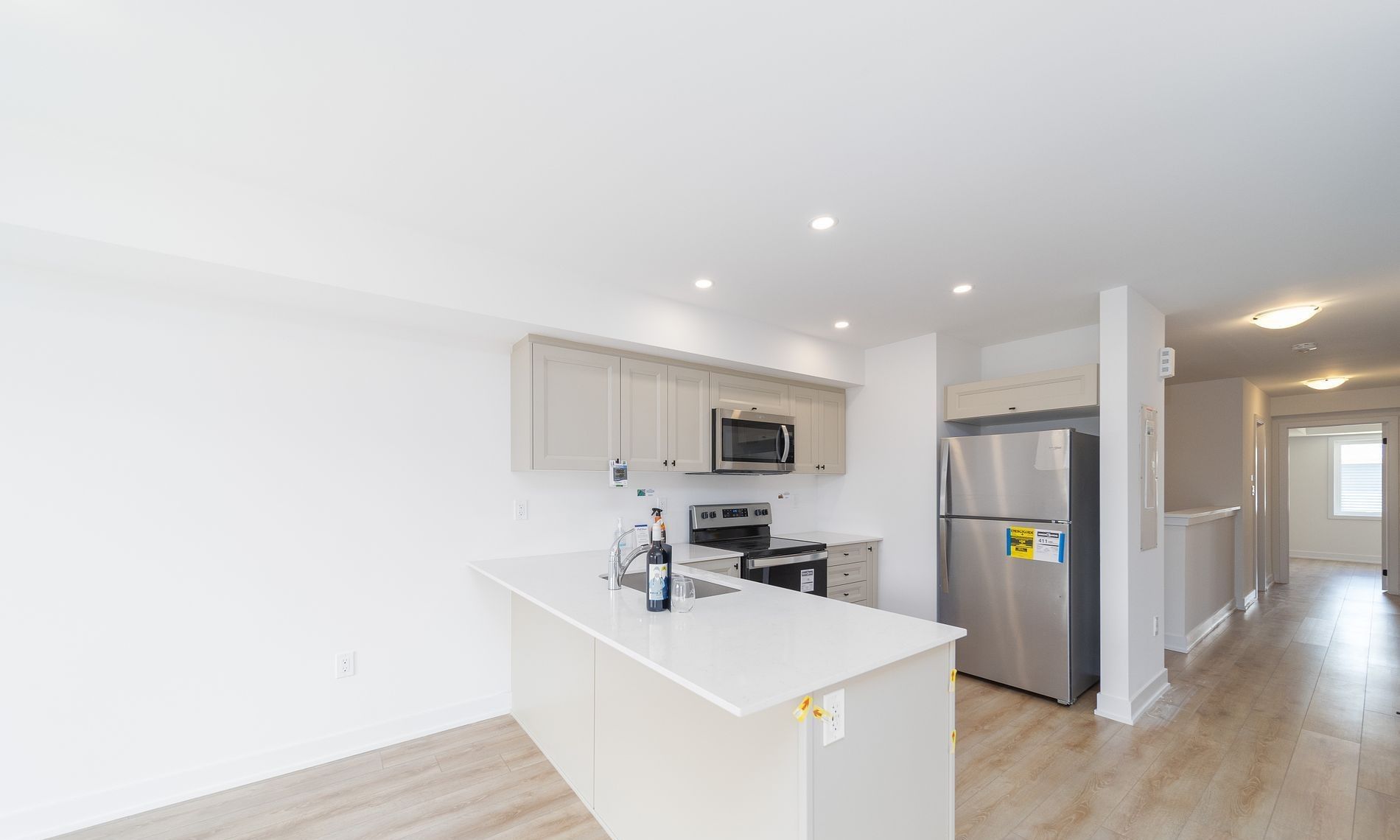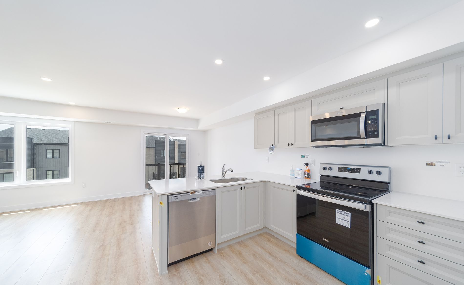 Wow- welcome to hewitt's gate. Conveniently located in south barrie and completed in 2024. This bradley development offers over 1200 sq ft of living space with a clean and bright look. This top floor end unit offers an open concept living space which is both comfortable and functional. Highlighted by the spacious kitchen that features stainless steel appliances and a breakfast bar, it overlooks the combined dining room and family room that includes a walkout to a covered balcony. Conveniently located on the same level are 3 wall appointed bedrooms and 2 bathrooms. The primary bedroom includes a walk-in closet en-suite with a glass-enclosed shower. It also includes a private garage and en-suite laundry.