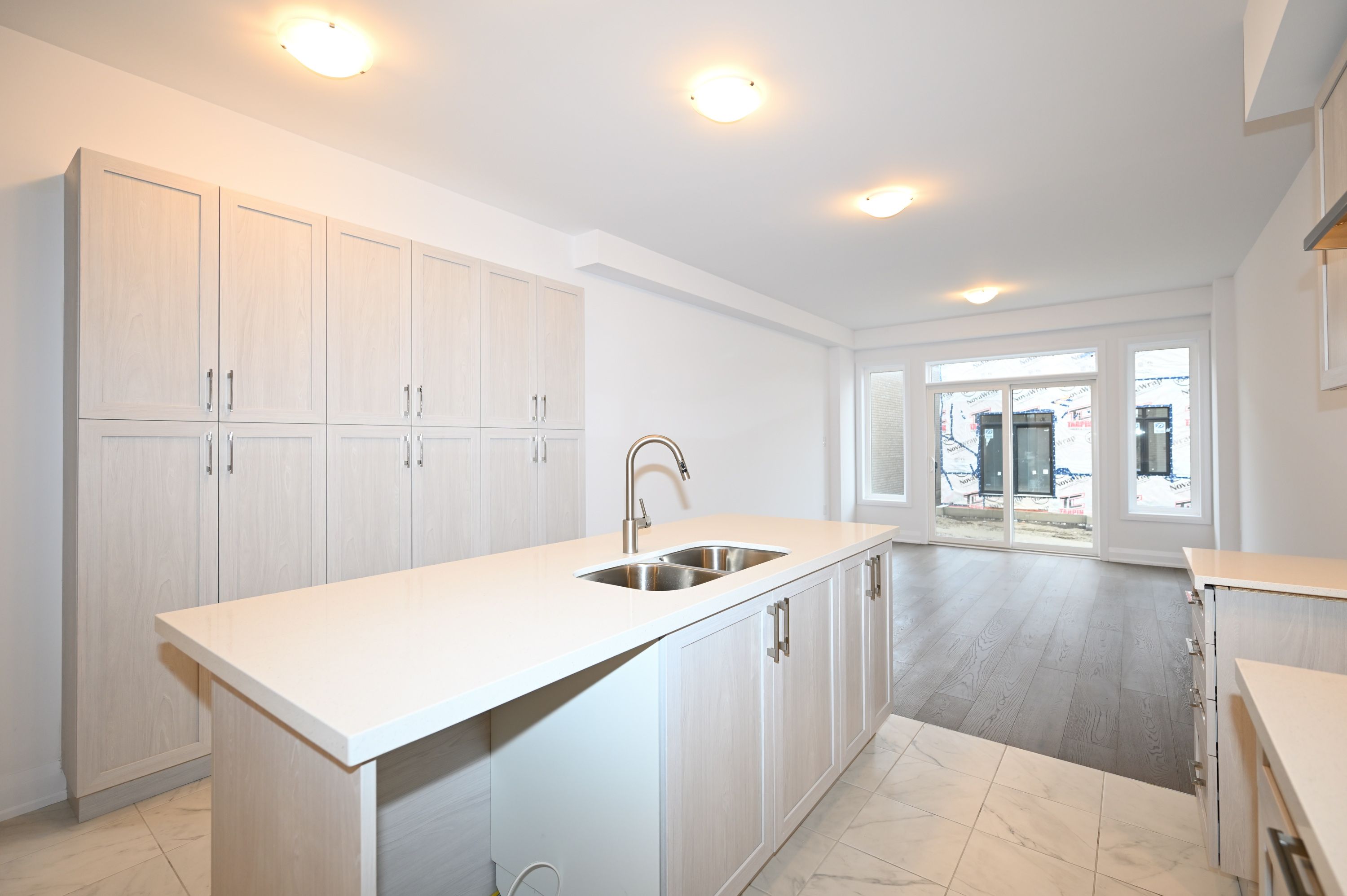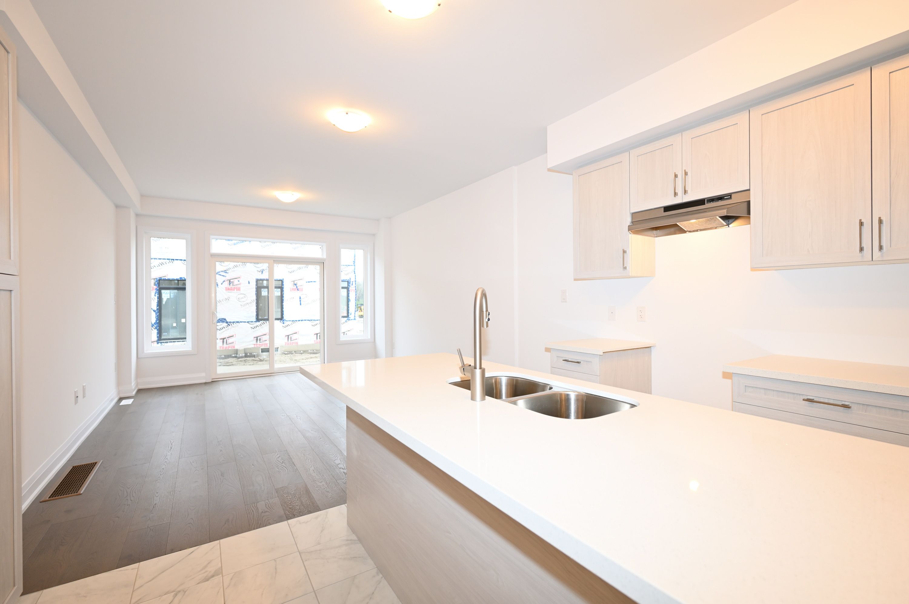 • Bright, open concept great room and contemporary kitchen with granite countertops.