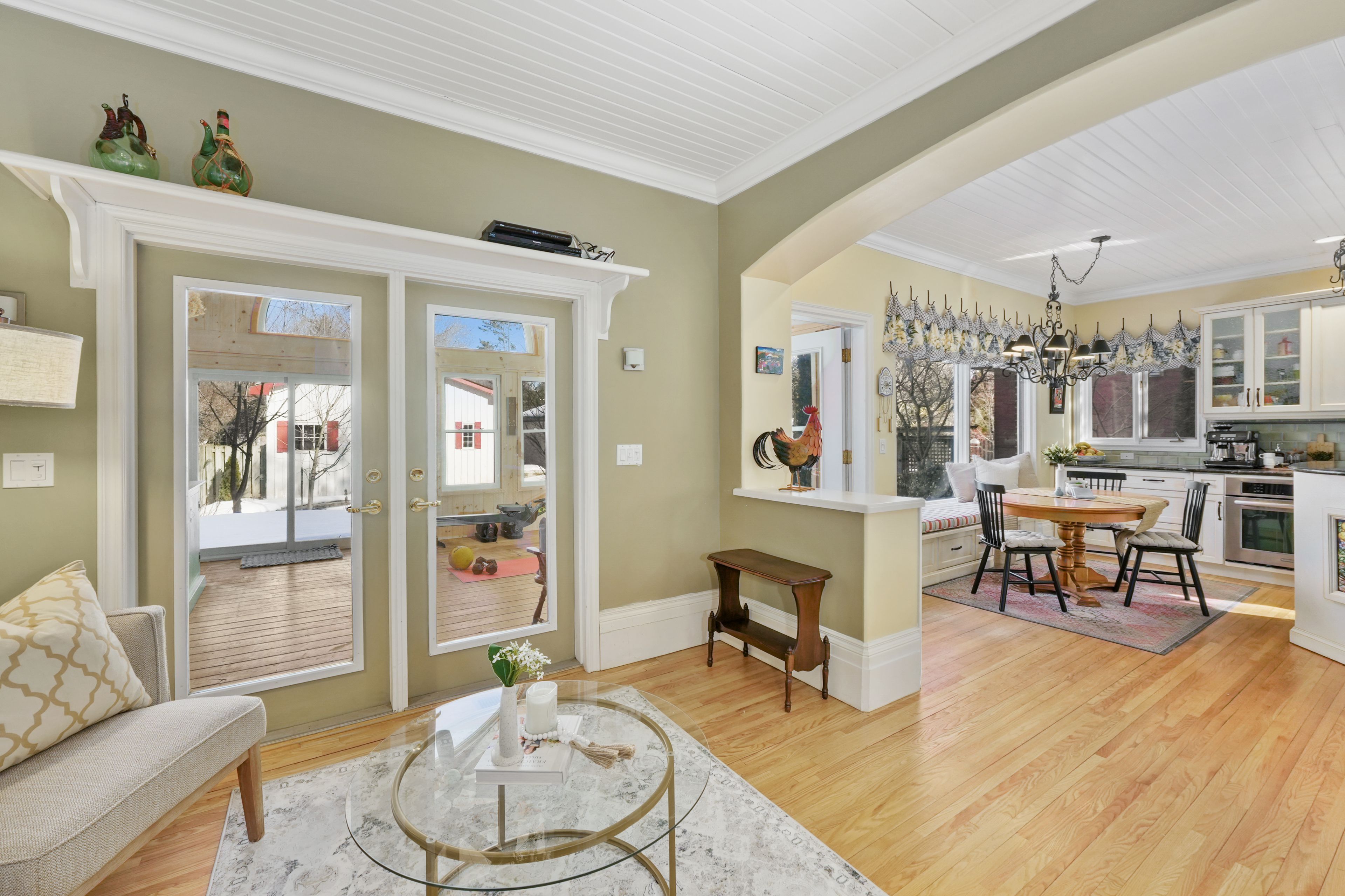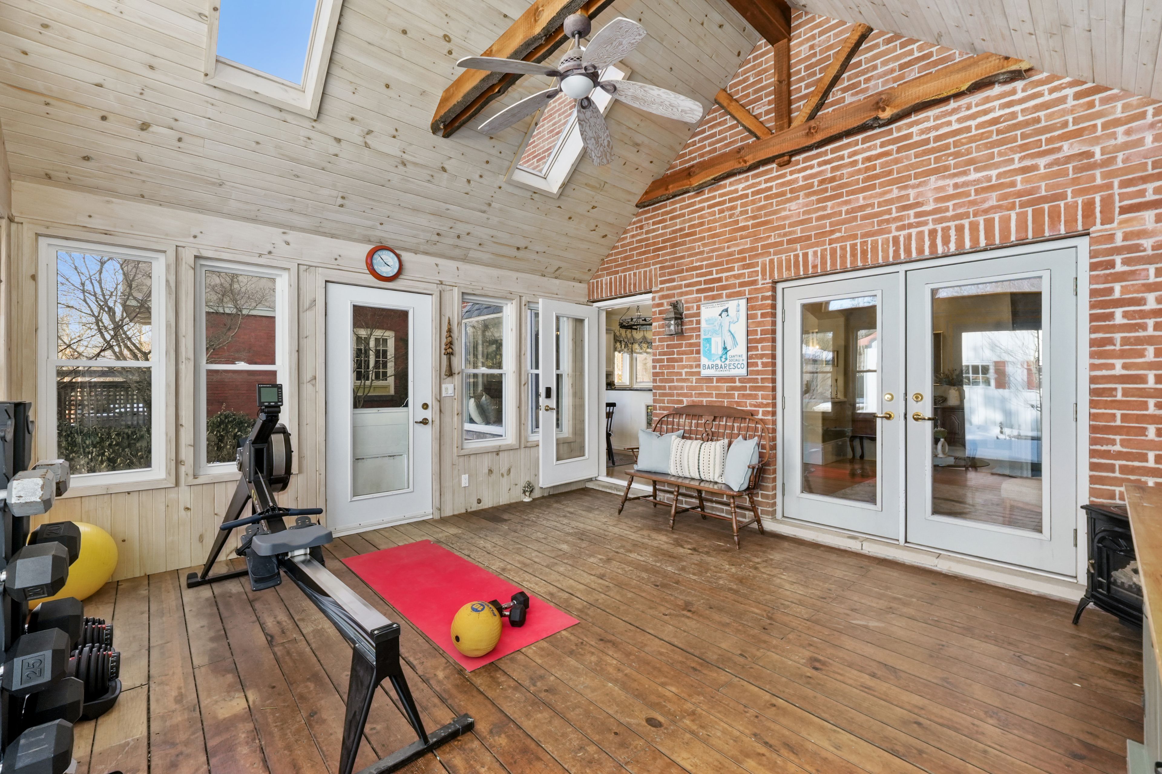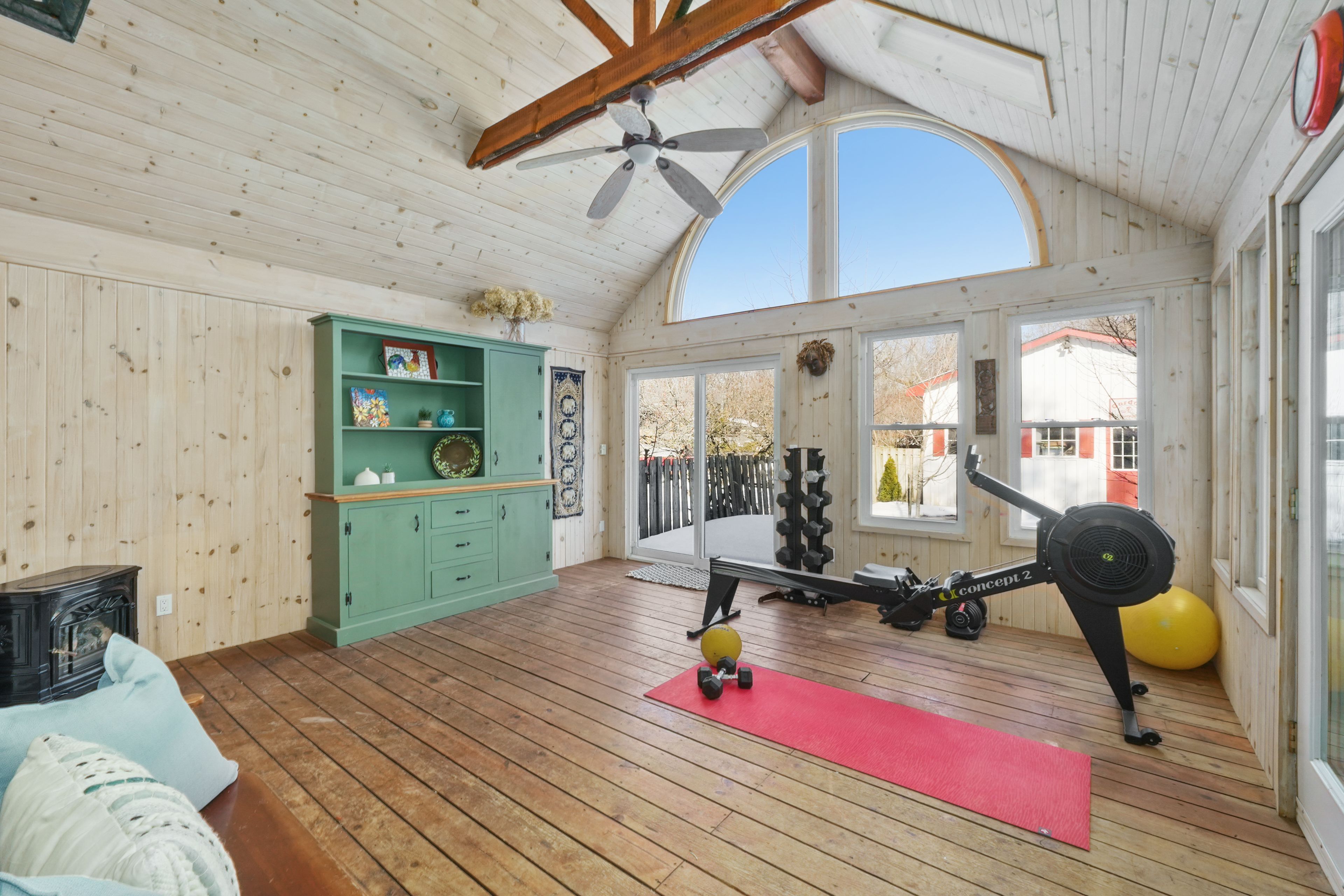 • Sunroom with a wood-clad ceiling and direct access to the back deck.