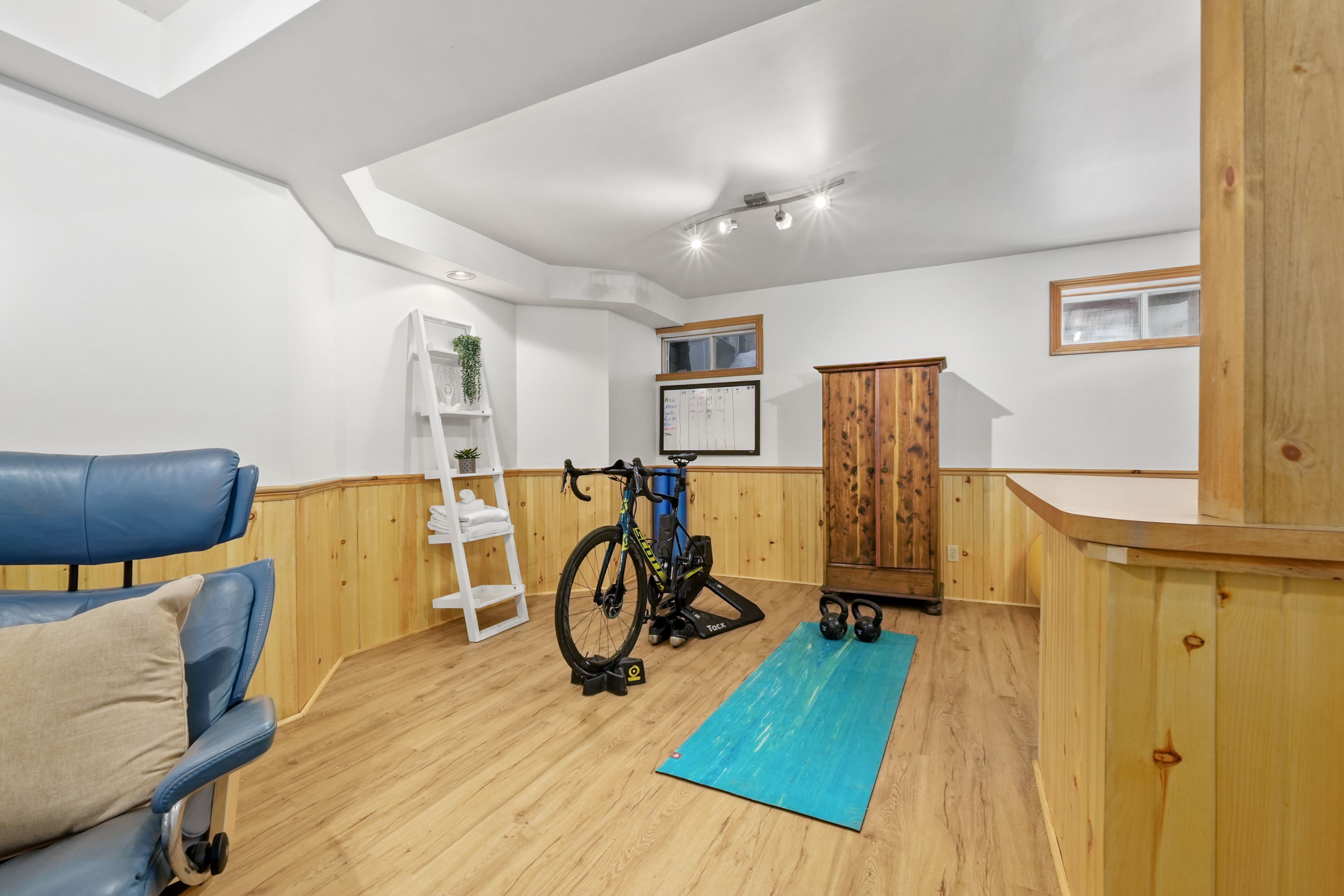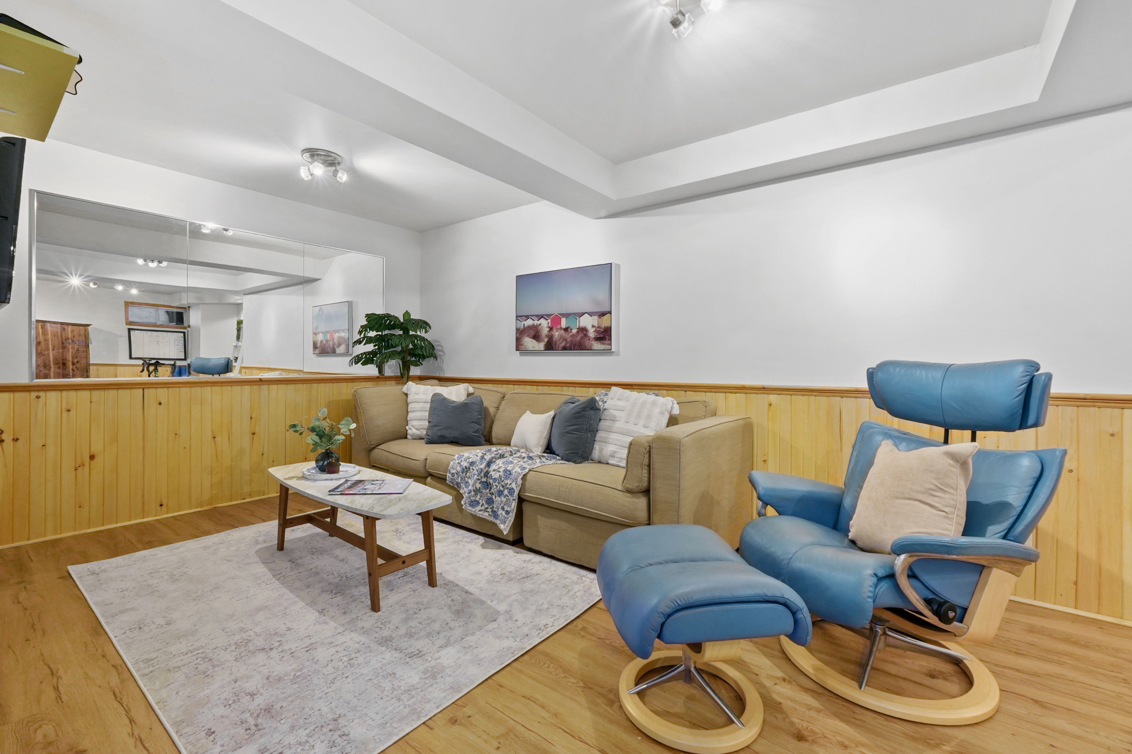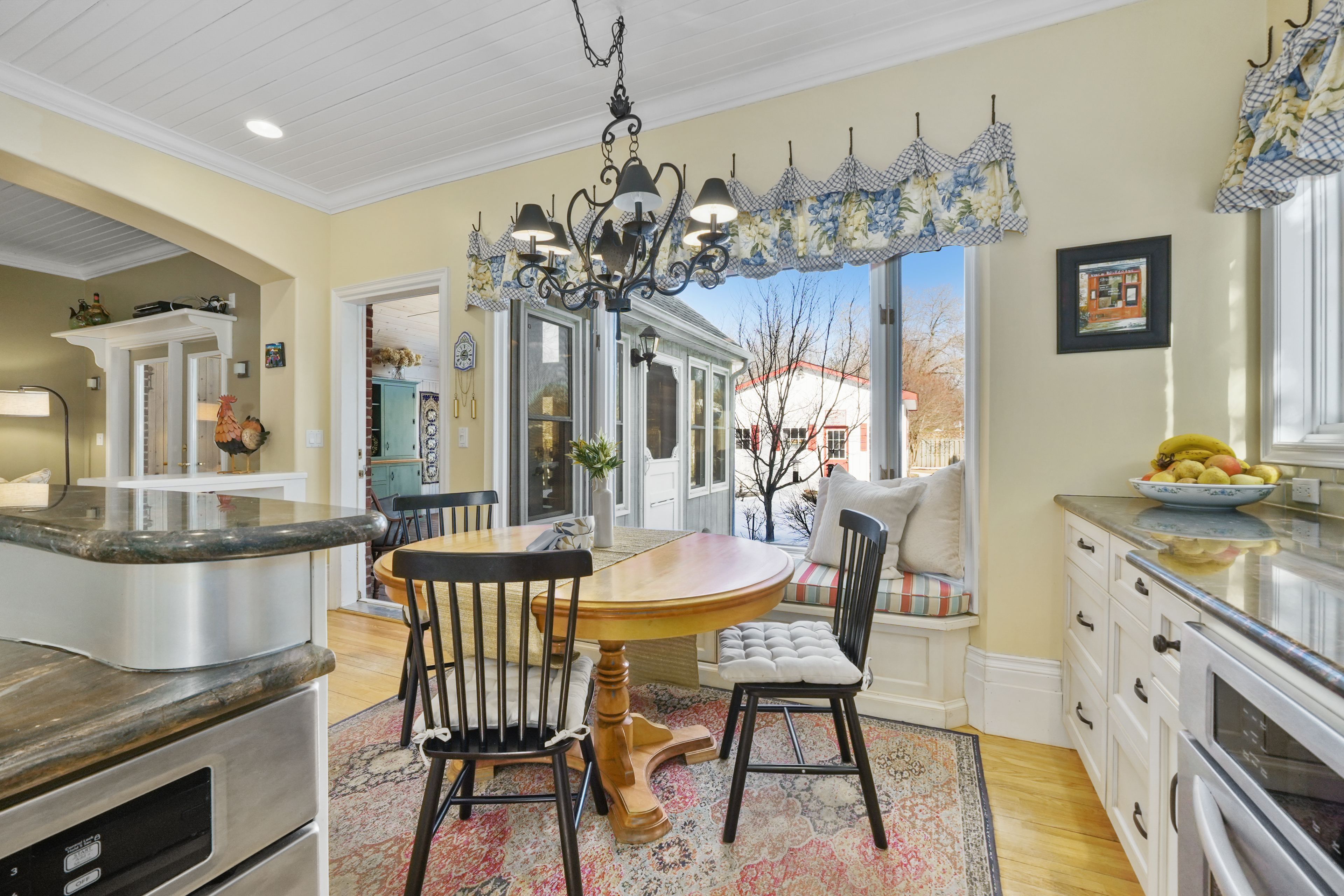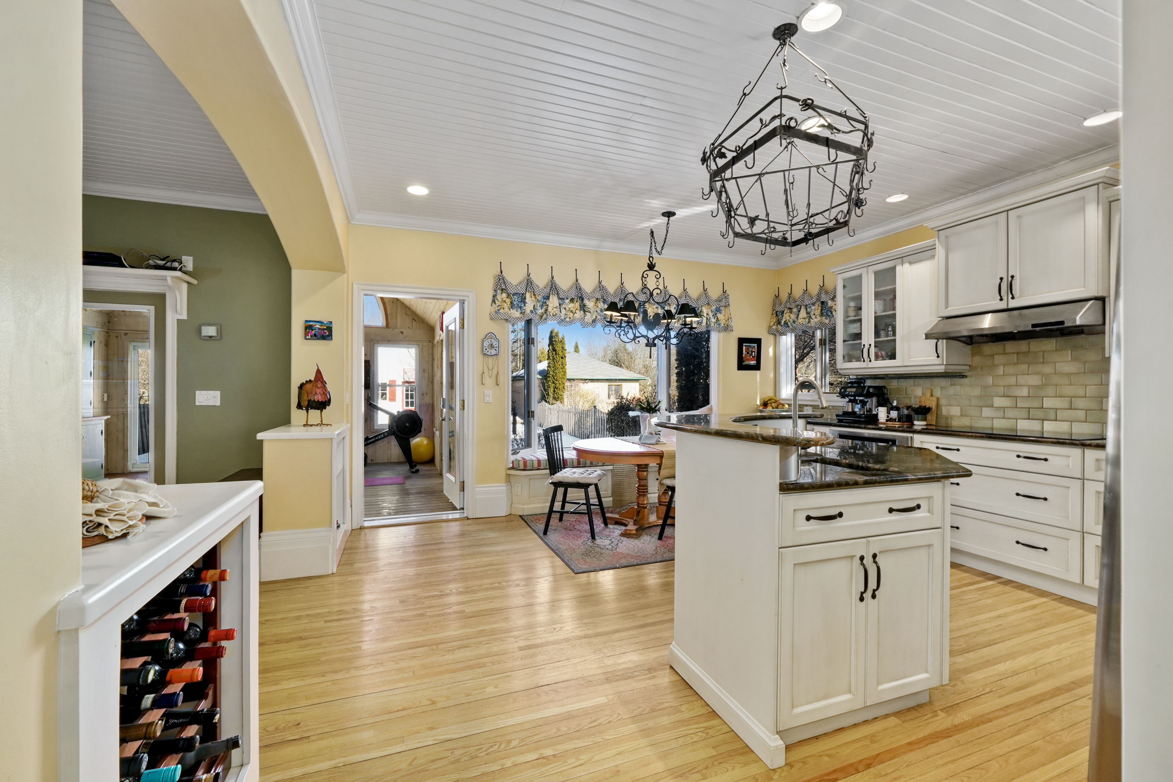 • Sunroom with a wood-clad ceiling and direct access to the back deck.