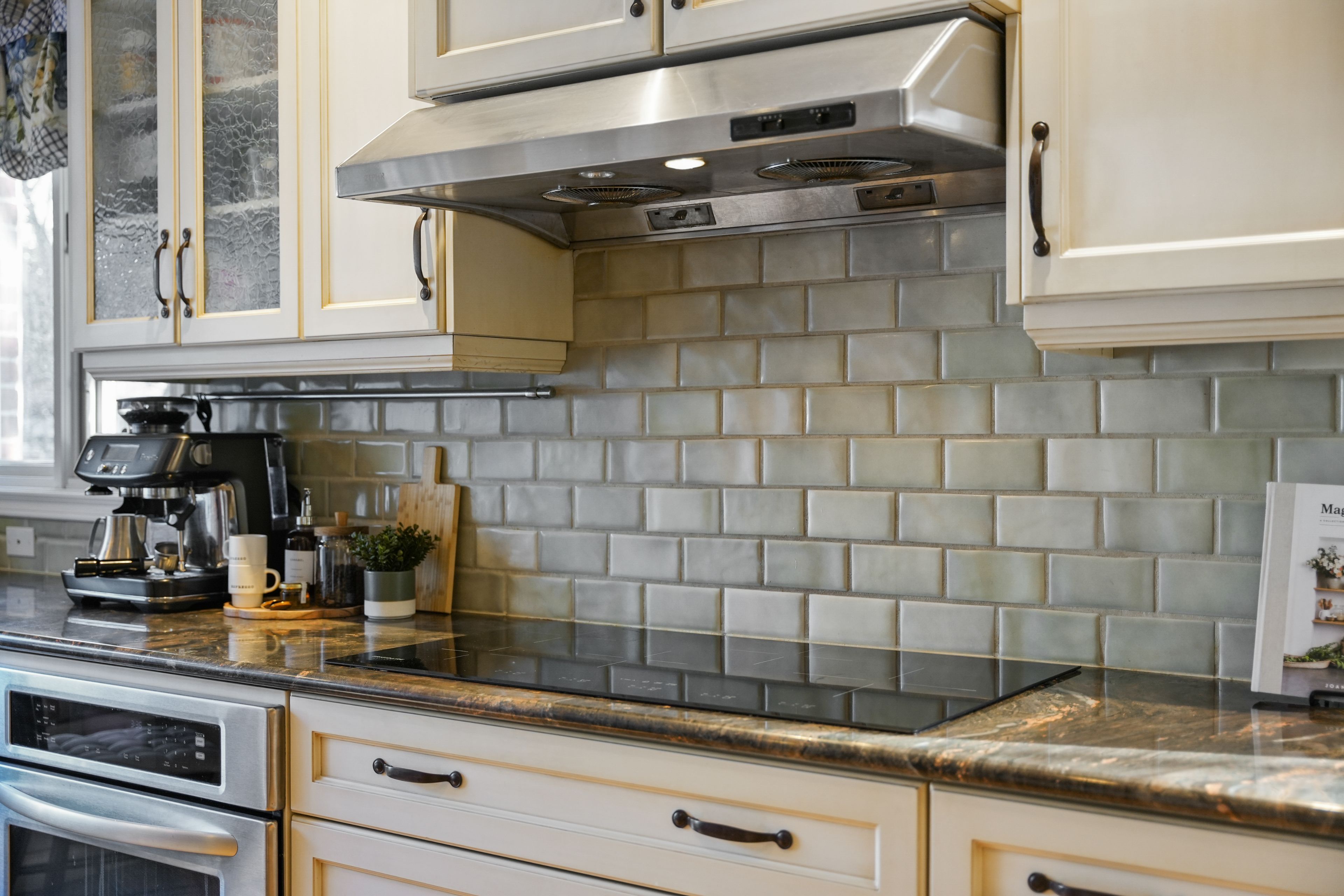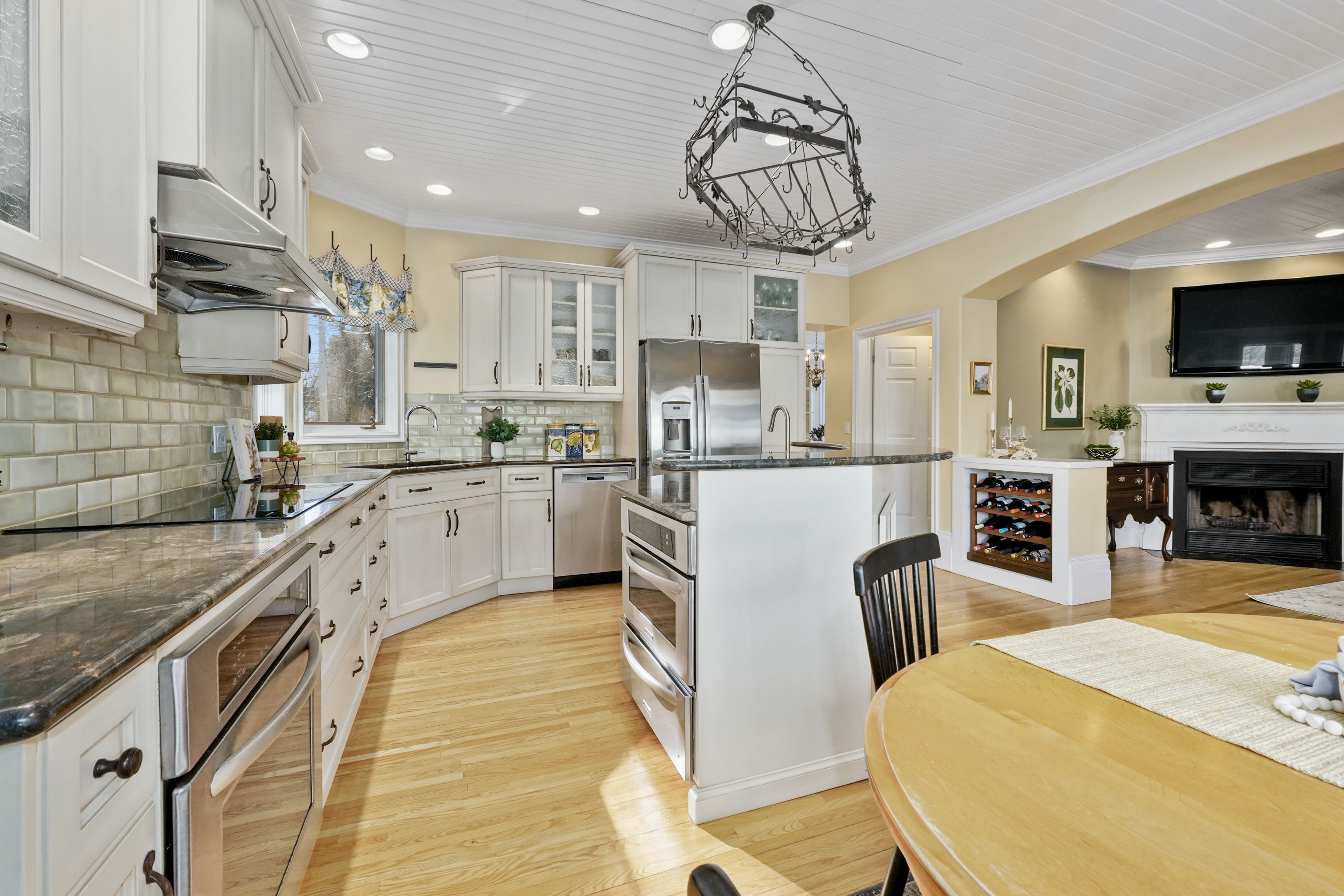 • Spacious kitchen with stainless steel appliances and a large island for cooking.
