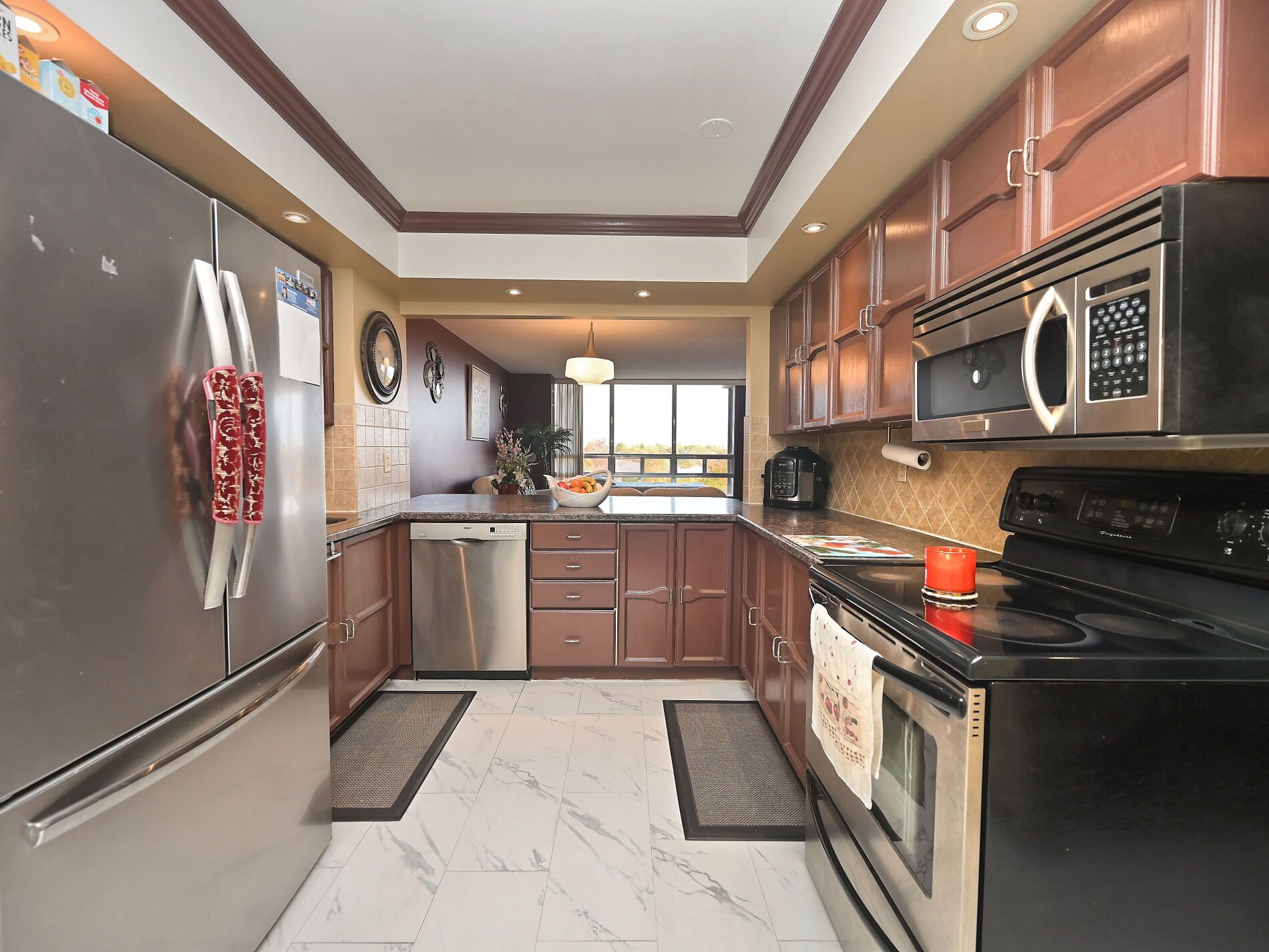 • Kitchen features stainless steel appliances, pot lights, and ceramic backsplash.