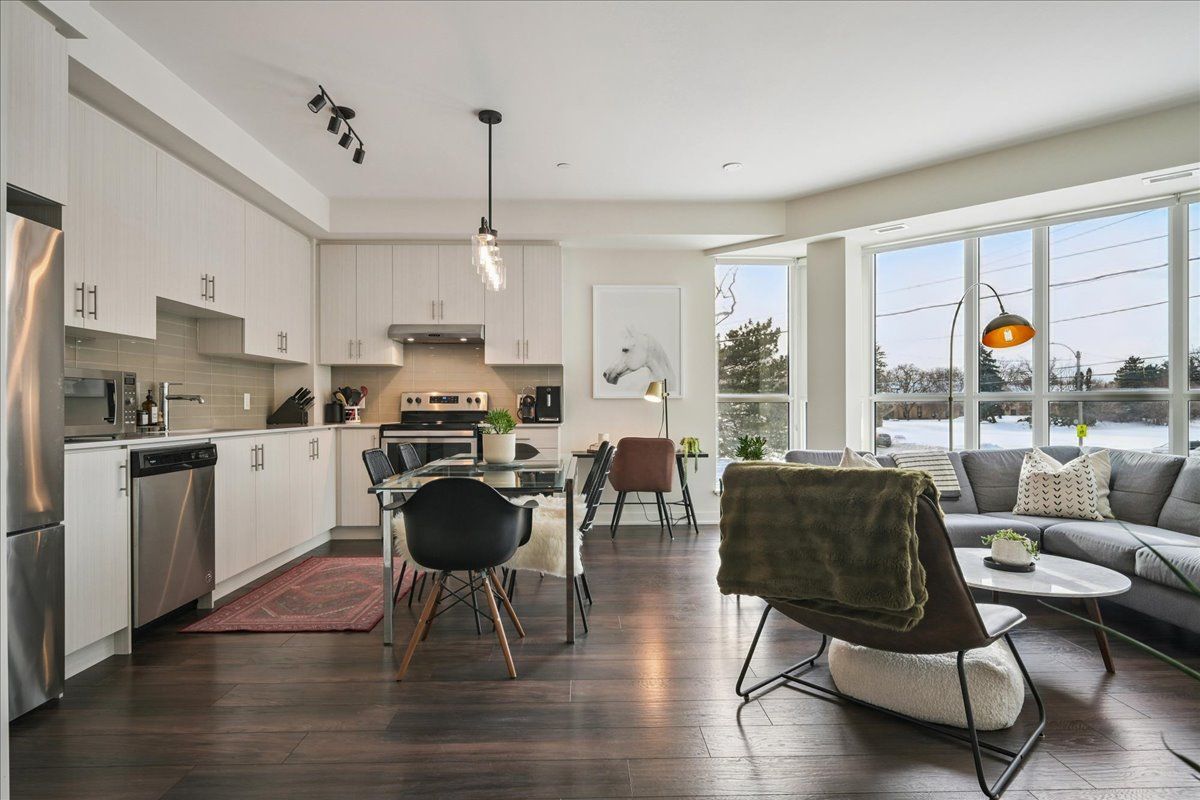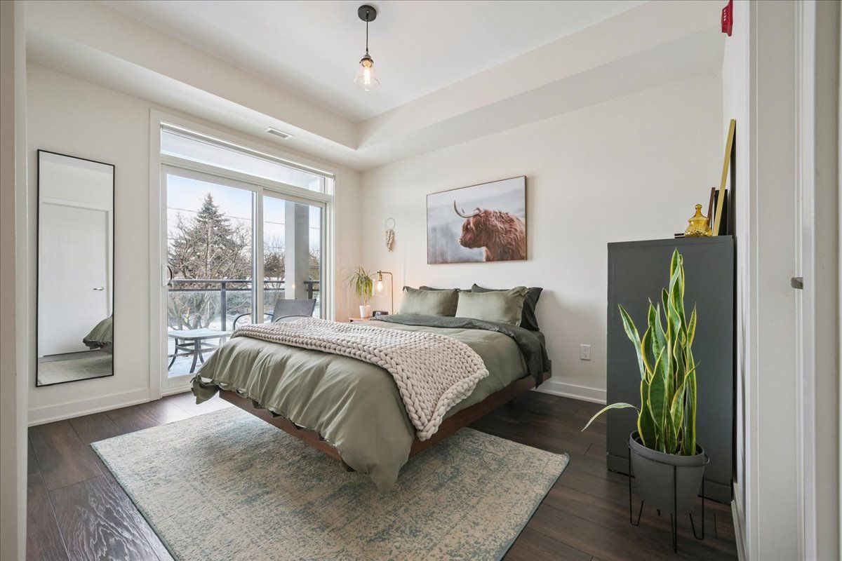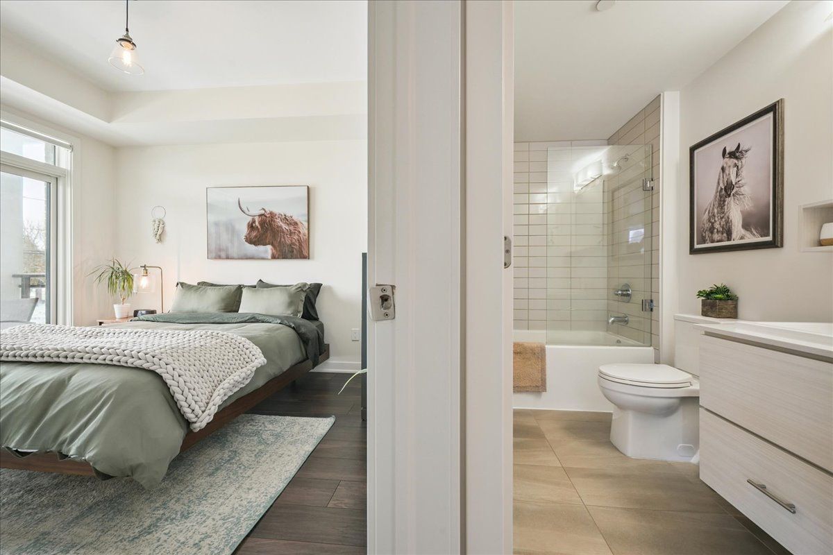 Floor-to-ceiling, wall-to-wall windows fill this stunning corner unit with natural light, creating a bright and airy space that truly sets it apart in this boutique low-rise building. The open layout is enhanced by 9-ft ceilings, wide plank hand-scraped flooring, and a welcoming foyer with plenty of storage. The sleek kitchen boasts quartz countertops, a glass backsplash, and modern appliances, while the spa-like bathroom features imported porcelain tile and ensuite privilege. Enjoy high-end roller blinds throughout, including blackout in the bedroom, plus walkouts to the spacious balcony from both the living room and bedroom. Built by rosehaven homes in 2020, this community offers exceptional amenities: a fitness and yoga studio, business centre, party room, rooftop terrace with bbqs, gardens, and fire pit, plus bike storage, visitor parking, and a dedicated dog area. The location is unbeatable just a short walk to aldershot go, shops, cafes, lasalle park, and the rbg, with quick highway access to the 403, qew, and 407.