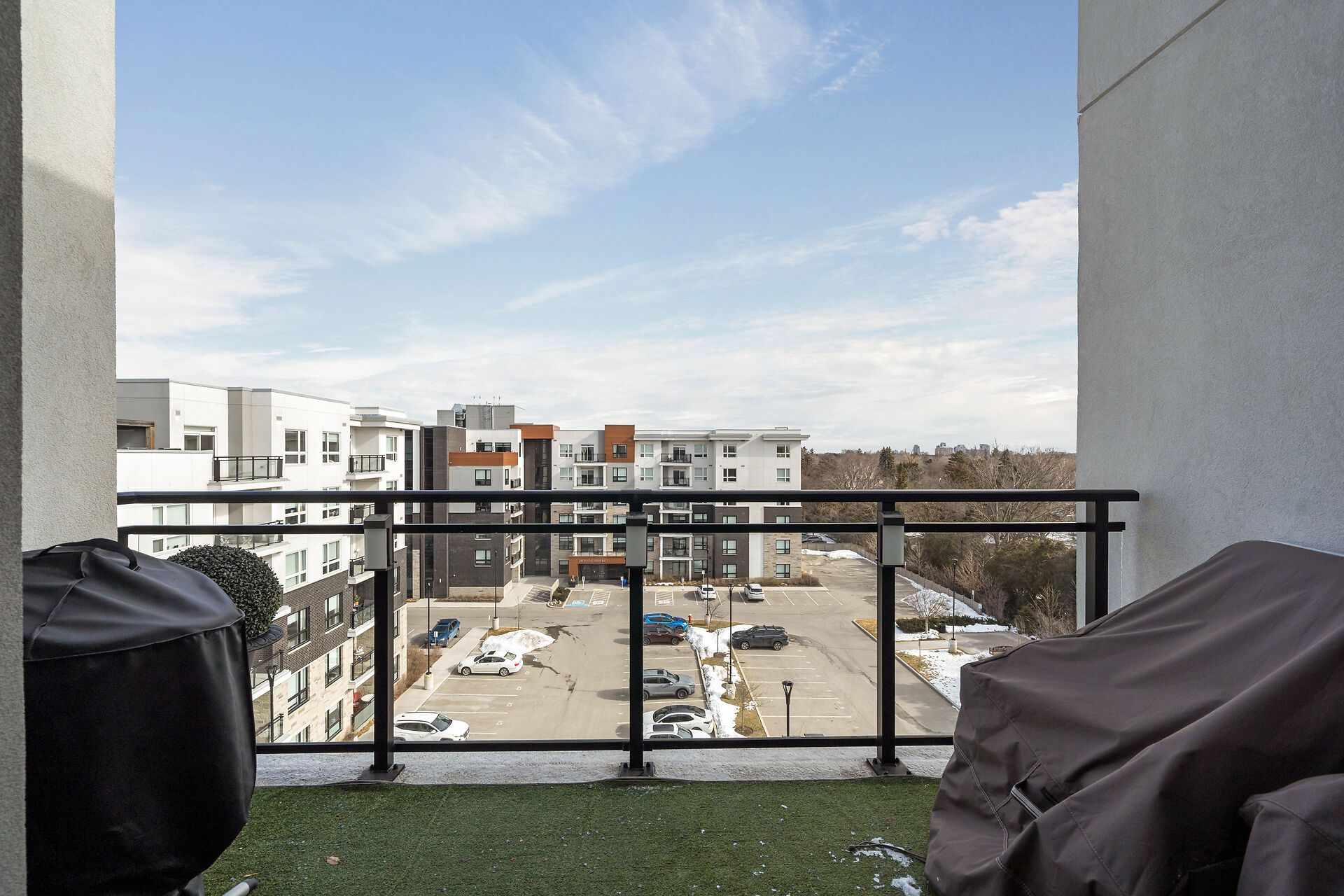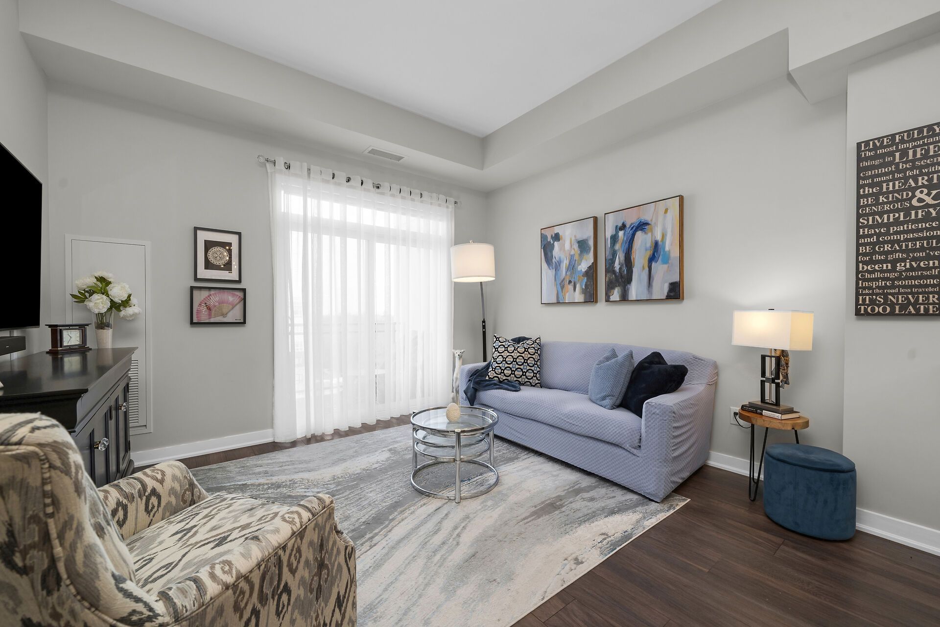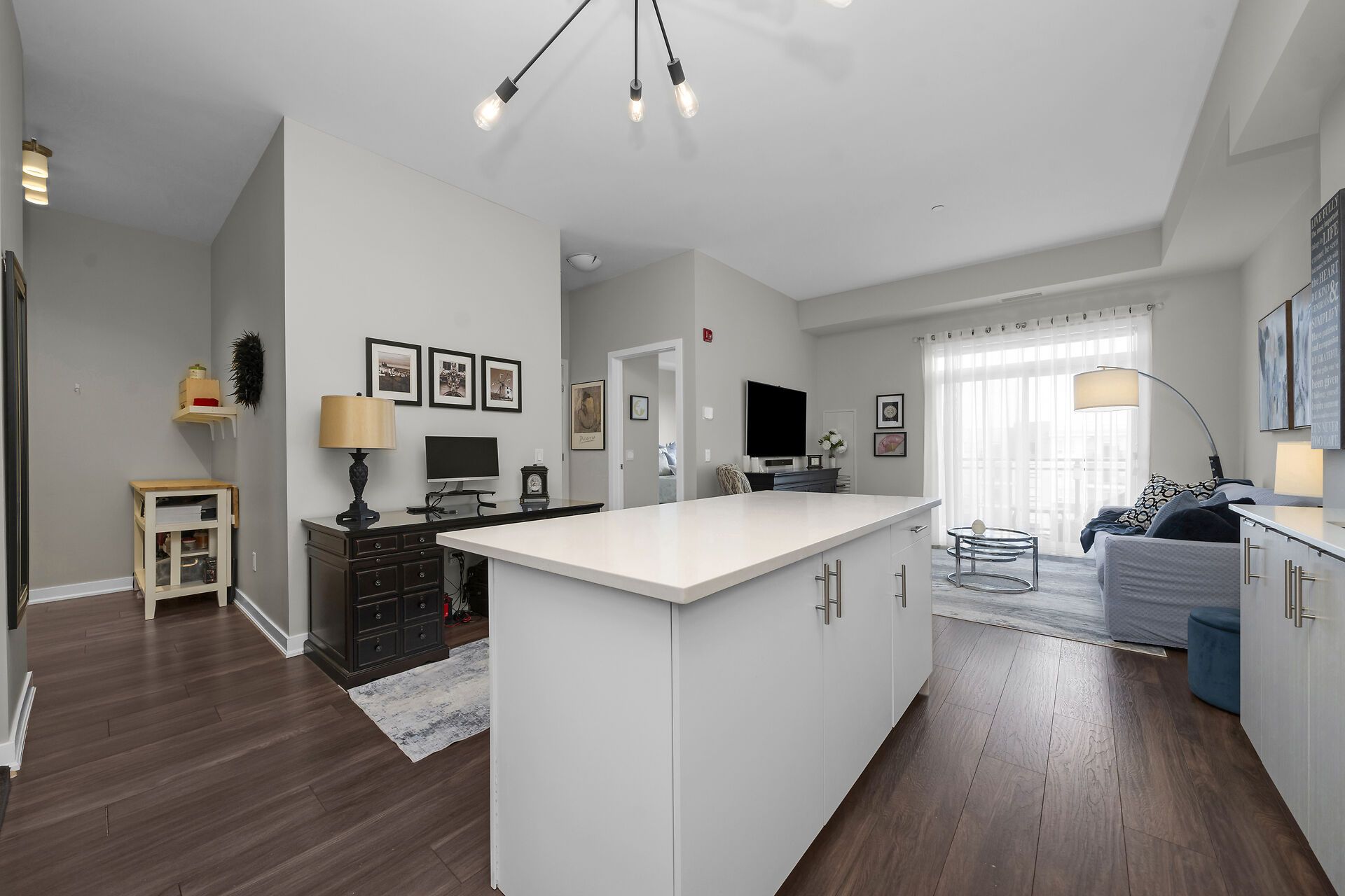 Penthouse living in south burlington - executive condo comfort experience refined, low-maintenance living in a prime south burlington location. This penthouse-level 1-bedroom + den suite offers a thoughtful blend of elegance, functionality, and lifestyle appeal-ideal for the discerning buyer. Soaring 10-foot ceilings and an open-concept layout create a bright, airy feel throughout this beautifully maintained residence. The expansive kitchen features a large island with seating for three or more, seamlessly opening to the spacious great room-well-suited for entertaining or everyday living. Step out to the private balcony and enjoy east and south views overlooking a landscaped parkette. The versatile den includes removable wall-to-wall cabinetry, offering flexible use as a home office, guest space, or additional storage. Meticulously cared for by the original owner and never rented, this unit reflects pride of ownership. Residents enjoy full-service amenities including a party room, billiards lounge, exercise and yoga rooms, bicycle storage, and ev charging station. Developed by rosehaven homes, the sought-after "affinity" community is well connected to nature, transit, shopping, and cafés. Relax on the rooftop terrace with outdoor fireplace and bbqs while enjoying breezes from lake ontario. Commuters will appreciate convenient access to major highways and aldershot go, while lifestyle amenities are just minutes from mapleview mall, burlington golf and country club, and a short walk to burlington beach. Enjoy convenient weekend escapes only 40 minutes from the renowned niagara wine region. An exceptional opportunity to own a penthouse suite offering executive comfort, everyday convenience, and effortless condo living in the heart of burlington.