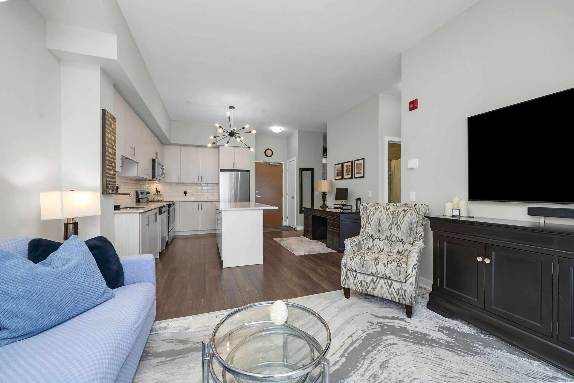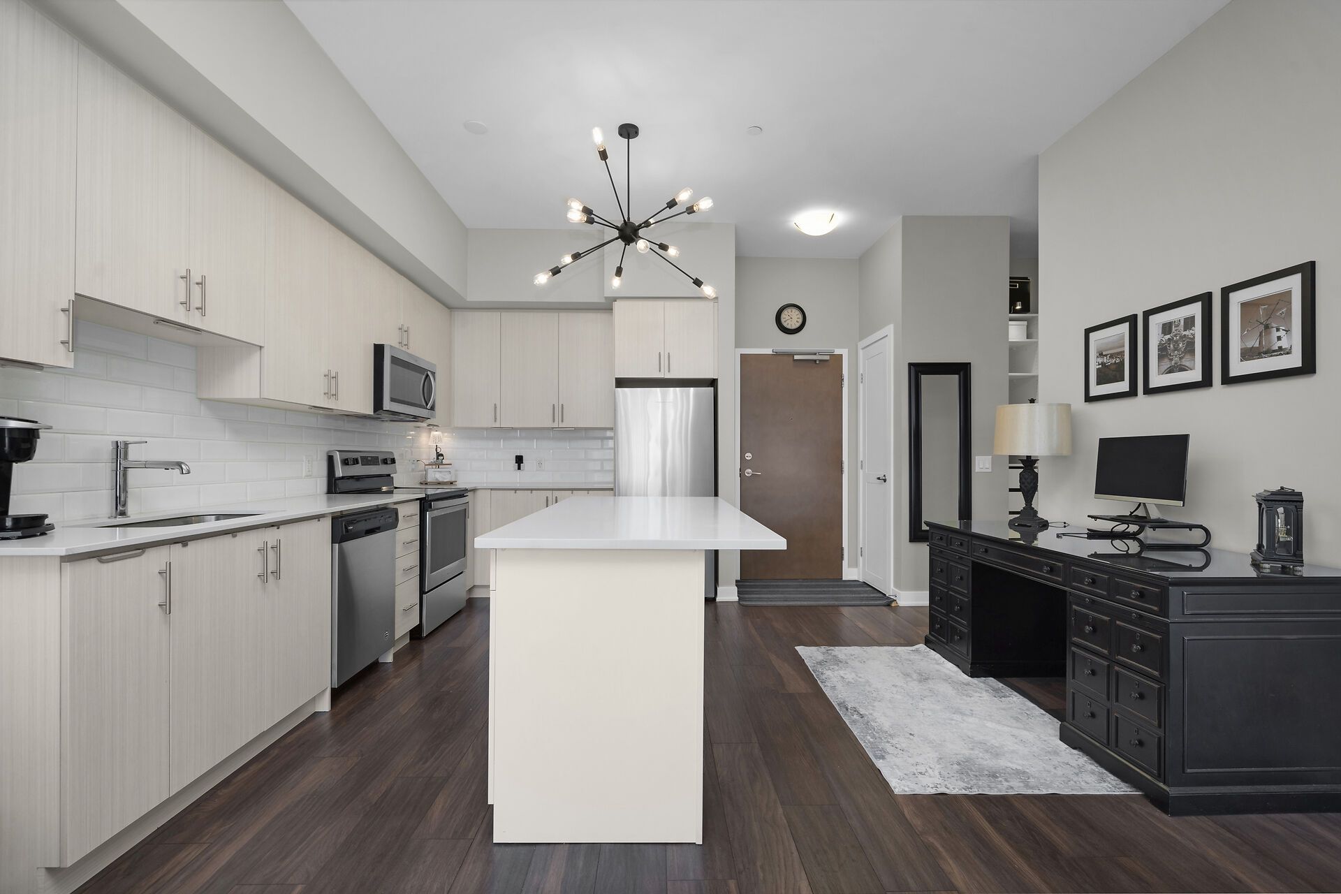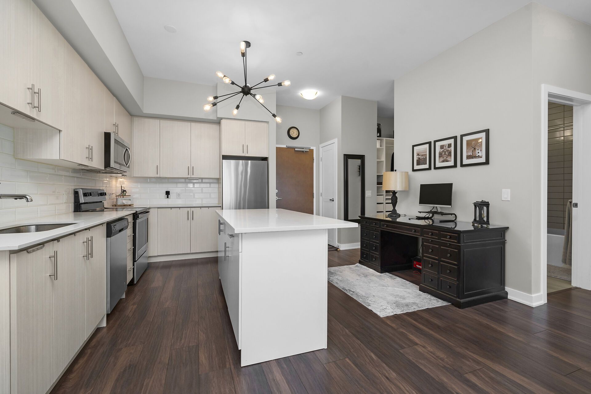 Penthouse living in south burlington - executive condo comfort experience refined, low-maintenance living in a prime south burlington location. This penthouse-level 1-bedroom + den suite offers a thoughtful blend of elegance, functionality, and lifestyle appeal-ideal for the discerning buyer. Soaring 10-foot ceilings and an open-concept layout create a bright, airy feel throughout this beautifully maintained residence. The expansive kitchen features a large island with seating for three or more, seamlessly opening to the spacious great room-well-suited for entertaining or everyday living. Step out to the private balcony and enjoy east and south views overlooking a landscaped parkette. The versatile den includes removable wall-to-wall cabinetry, offering flexible use as a home office, guest space, or additional storage. Meticulously cared for by the original owner and never rented, this unit reflects pride of ownership. Residents enjoy full-service amenities including a party room, billiards lounge, exercise and yoga rooms, bicycle storage, and ev charging station. Developed by rosehaven homes, the sought-after "affinity" community is well connected to nature, transit, shopping, and cafés. Relax on the rooftop terrace with outdoor fireplace and bbqs while enjoying breezes from lake ontario. Commuters will appreciate convenient access to major highways and aldershot go, while lifestyle amenities are just minutes from mapleview mall, burlington golf and country club, and a short walk to burlington beach. Enjoy convenient weekend escapes only 40 minutes from the renowned niagara wine region. An exceptional opportunity to own a penthouse suite offering executive comfort, everyday convenience, and effortless condo living in the heart of burlington.