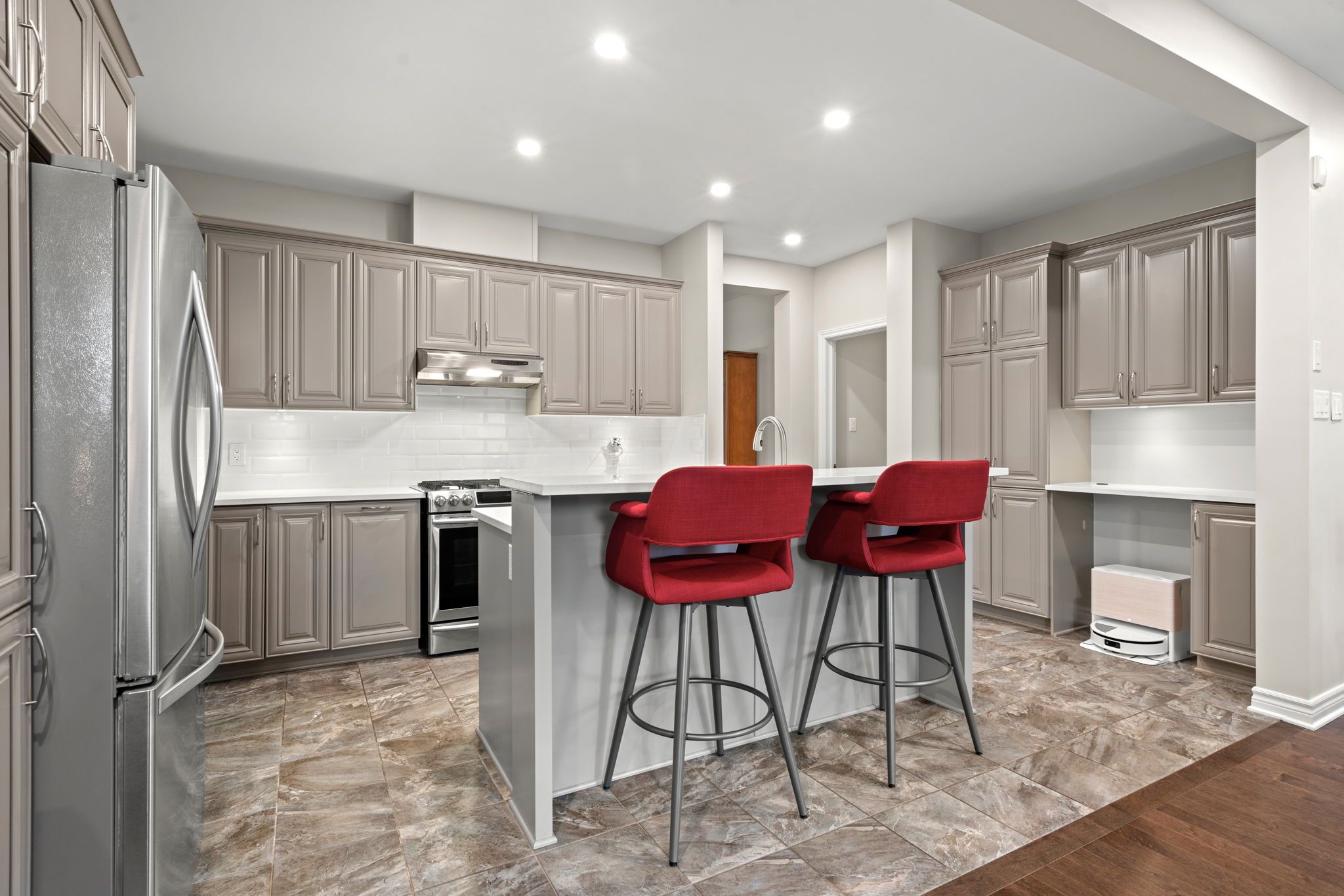 • Chic kitchen with upgraded cabinets, island, and stainless steel appliances.