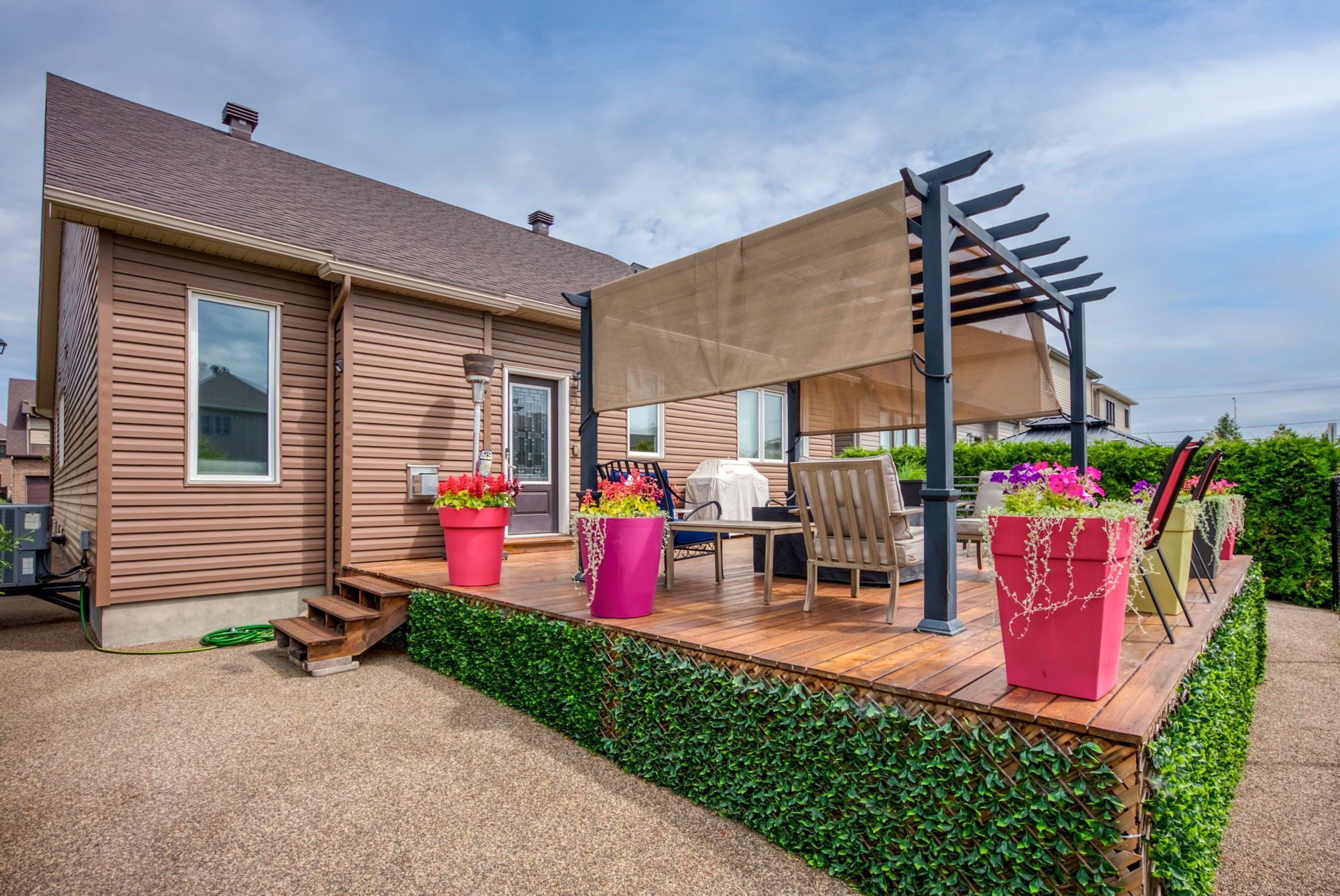 • Transformed backyard with a spacious deck, pergola, and low maintenance design.