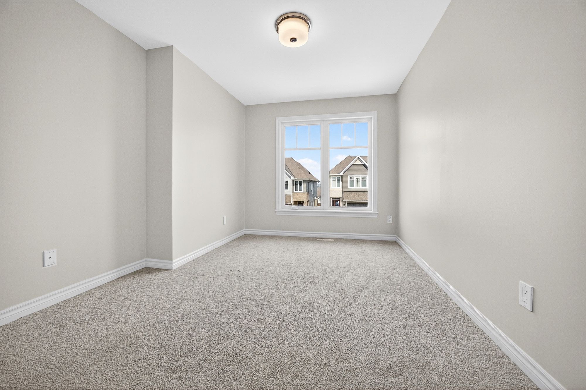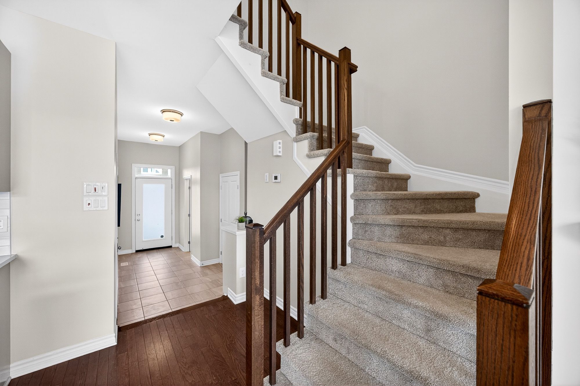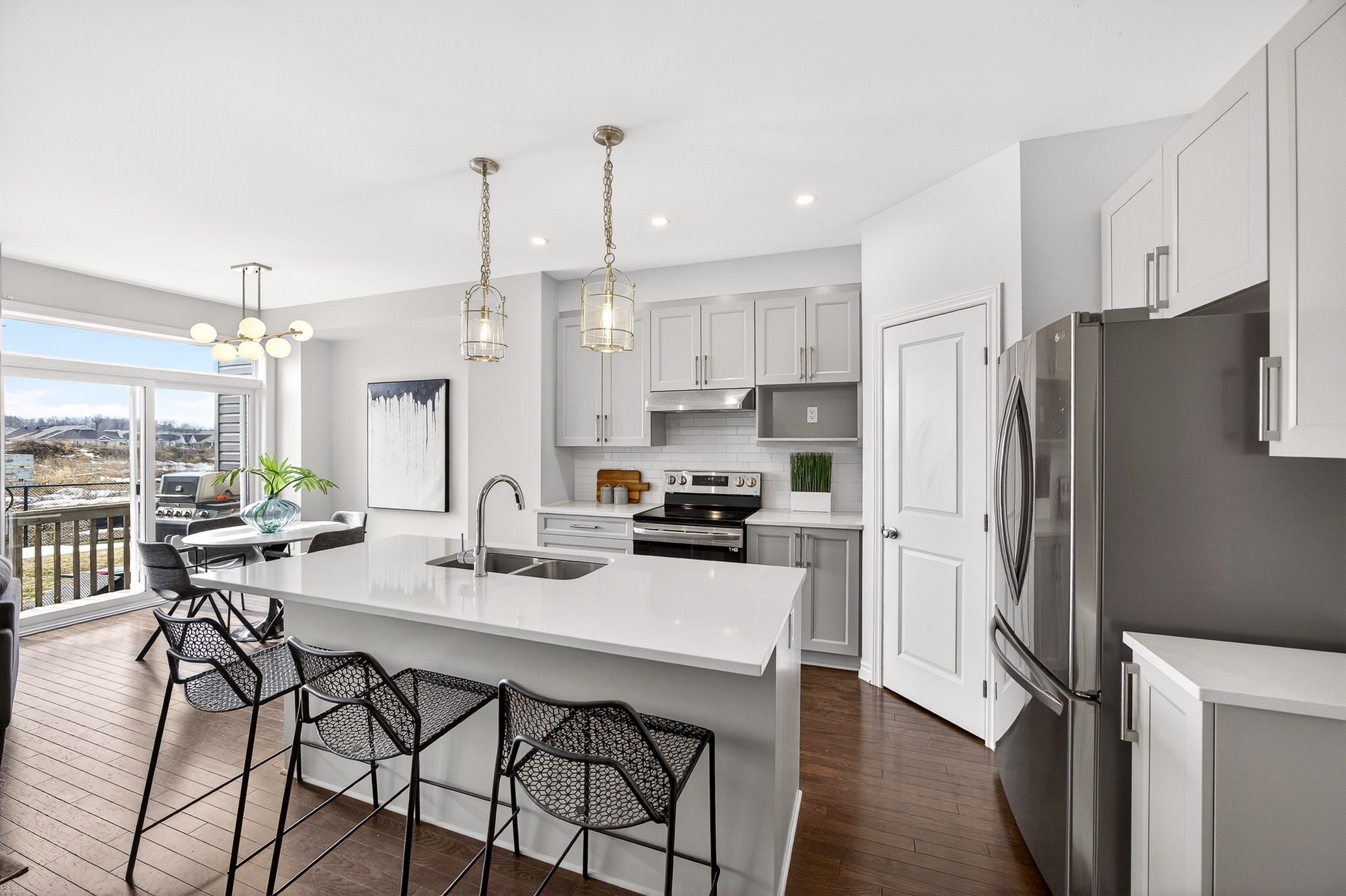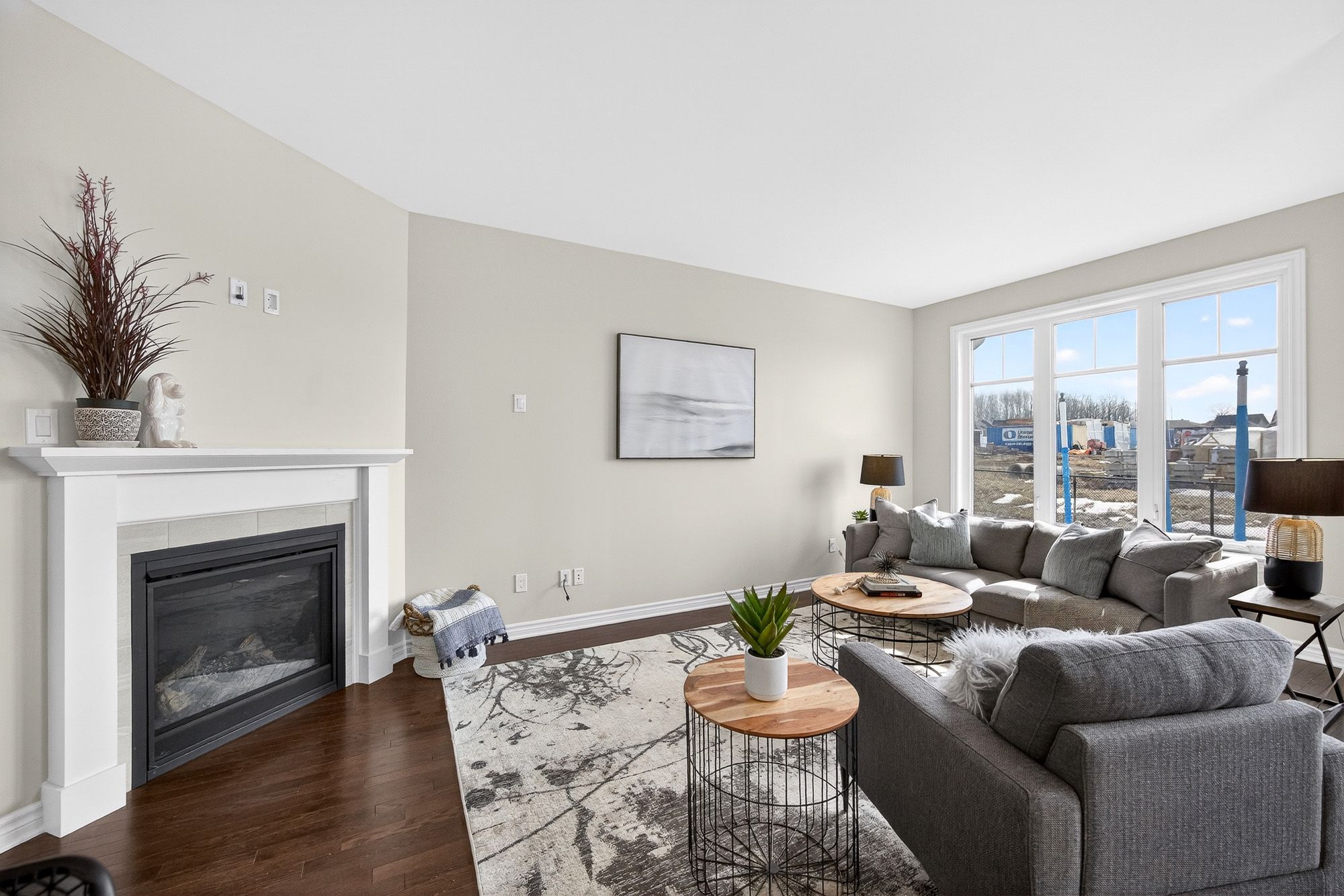 Welcome to 321 kanashtage terrace, a tastefully upgraded tamarack home with no rear neighbours, offering over 1400 sq. Ft. Of above-grade finished living area plus a finished basement in the desirable community of cardinal creek in orléans-cumberland. This spacious 3-bedroom, 2. 5-bath townhome features an open-concept main level, enhanced by sprawling 9-foot ceilings, rich hardwood flooring, upgraded lighting and large south-facing windows that allow natural light to permeate the level. The inviting living and dining areas are anchored by a cozy gas fireplace with a tv-ready wall, perfect for both everyday living and entertaining. The modern kitchen is both stylish and functional, featuring bright quartz countertops, pot & pendant lighting, stainless appliances, a large island with a breakfast bar, and a walk-in pantry, offering exceptional prep and storage space. Upstairs you'll find a well-appointed layout, including convenient second-level laundry with upper cabinets. The primary suite is a true retreat, featuring a spacious walk-in closet, and a luxurious ensuite with a large soaker tub and a walk-in shower. Two additional bedrooms, a 4-piece bathroom with quartz counters and laundry complete the level, providing excellent space and convenience for guests or growing families. The finished basement adds extra living space with a large recreation room - ideal for a home theatre, gym, or play area. Additional highlights include ample storage space and a single-car garage with entry to mudroom, adding both convenience and functionality. This home backs onto a future school and is just minutes from parks, trails, shopping and everyday amenities. It's also just a short commute to the future lrt, offering excellent long-term value and connectivity. Offering an ideal blend of space, function, and privacy, this home presents an exceptional opportunity in one of orléans-cumberland's fastest-growing neighbourhoods.