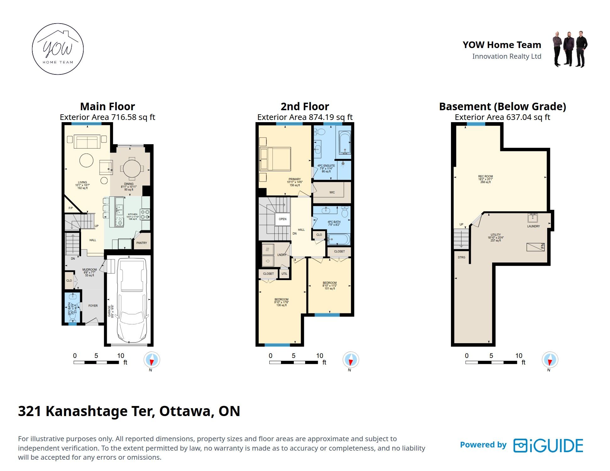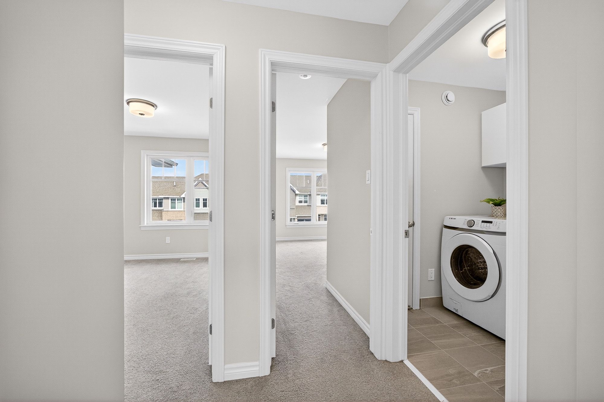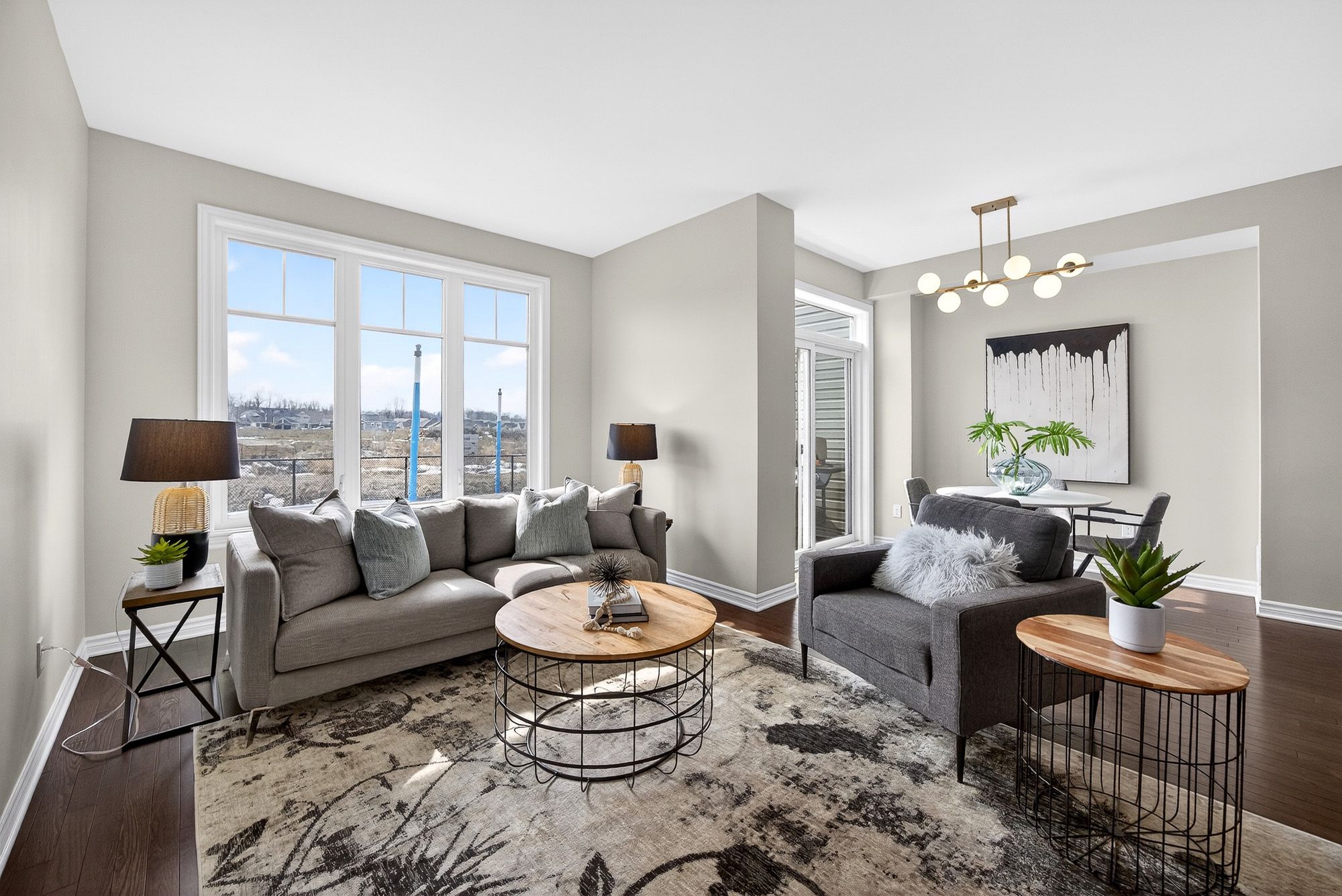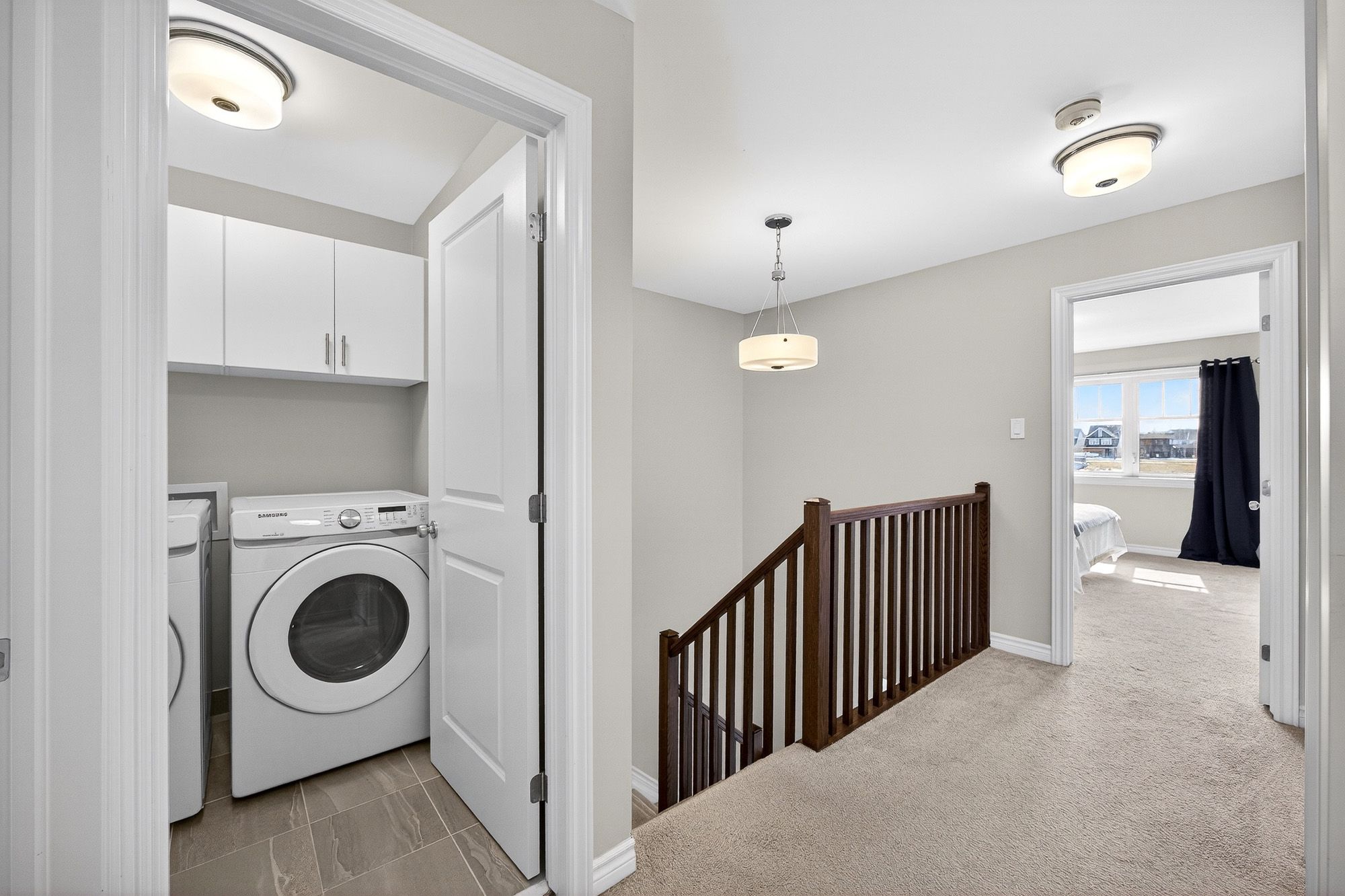 Welcome to 321 kanashtage terrace, a tastefully upgraded tamarack home with no rear neighbours, offering over 1400 sq. Ft. Of above-grade finished living area plus a finished basement in the desirable community of cardinal creek in orléans-cumberland. This spacious 3-bedroom, 2. 5-bath townhome features an open-concept main level, enhanced by sprawling 9-foot ceilings, rich hardwood flooring, upgraded lighting and large south-facing windows that allow natural light to permeate the level. The inviting living and dining areas are anchored by a cozy gas fireplace with a tv-ready wall, perfect for both everyday living and entertaining. The modern kitchen is both stylish and functional, featuring bright quartz countertops, pot & pendant lighting, stainless appliances, a large island with a breakfast bar, and a walk-in pantry, offering exceptional prep and storage space. Upstairs you'll find a well-appointed layout, including convenient second-level laundry with upper cabinets. The primary suite is a true retreat, featuring a spacious walk-in closet, and a luxurious ensuite with a large soaker tub and a walk-in shower. Two additional bedrooms, a 4-piece bathroom with quartz counters and laundry complete the level, providing excellent space and convenience for guests or growing families. The finished basement adds extra living space with a large recreation room - ideal for a home theatre, gym, or play area. Additional highlights include ample storage space and a single-car garage with entry to mudroom, adding both convenience and functionality. This home backs onto a future school and is just minutes from parks, trails, shopping and everyday amenities. It's also just a short commute to the future lrt, offering excellent long-term value and connectivity. Offering an ideal blend of space, function, and privacy, this home presents an exceptional opportunity in one of orléans-cumberland's fastest-growing neighbourhoods.