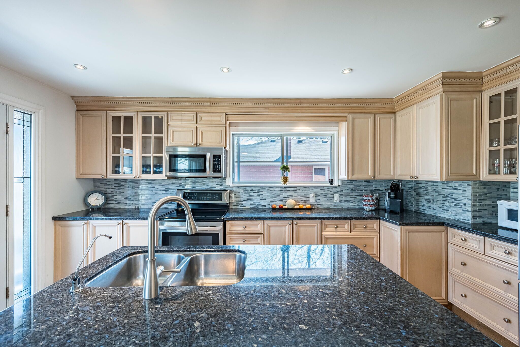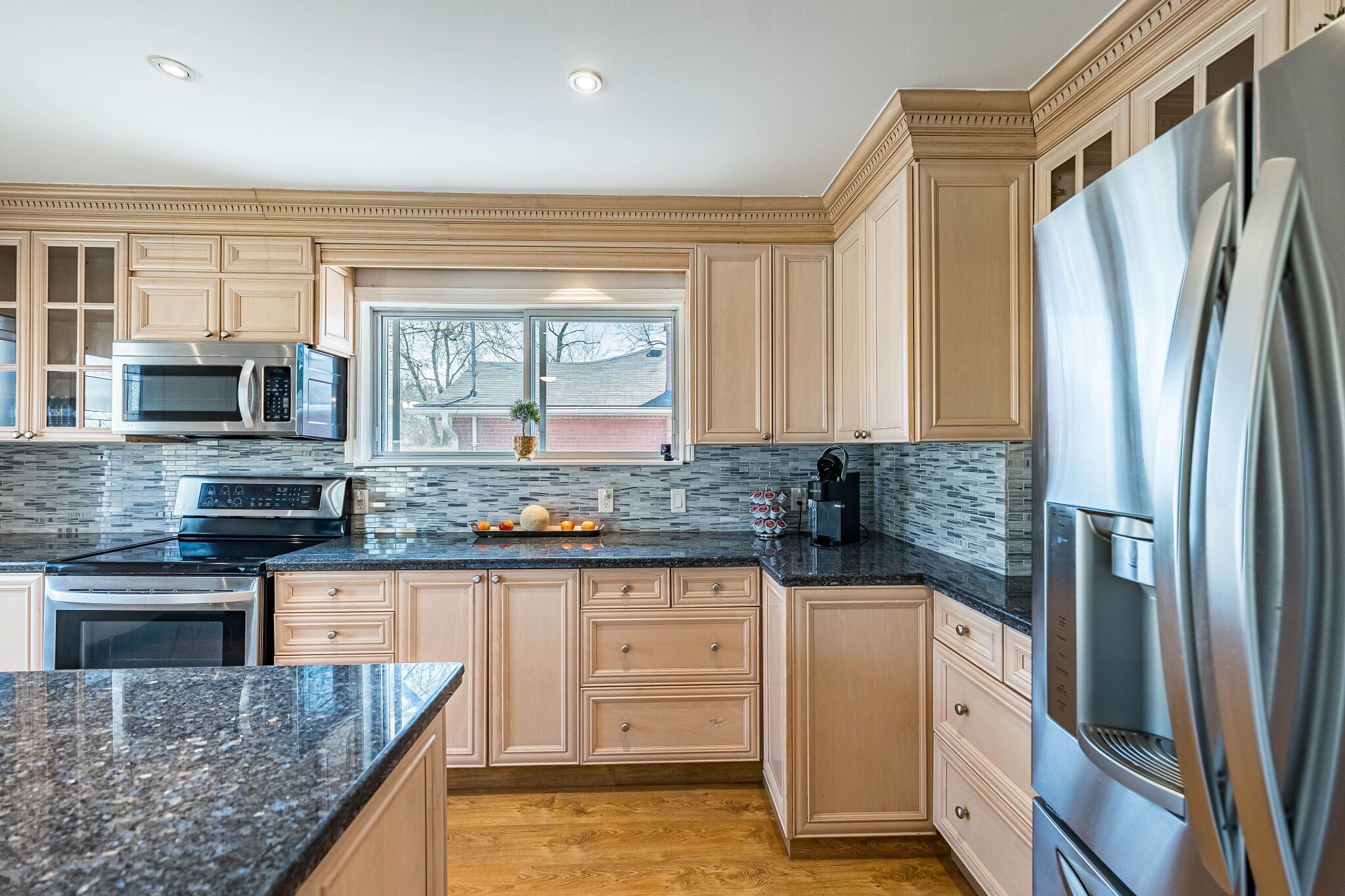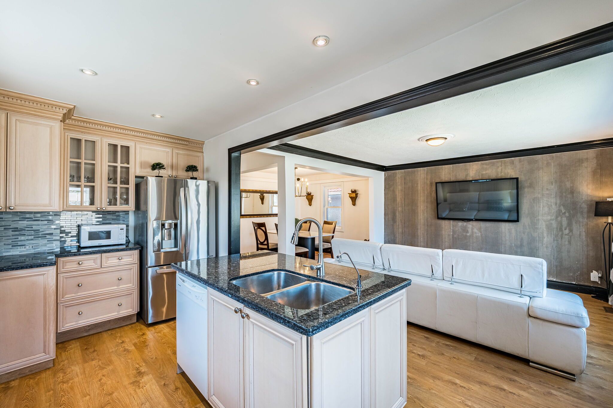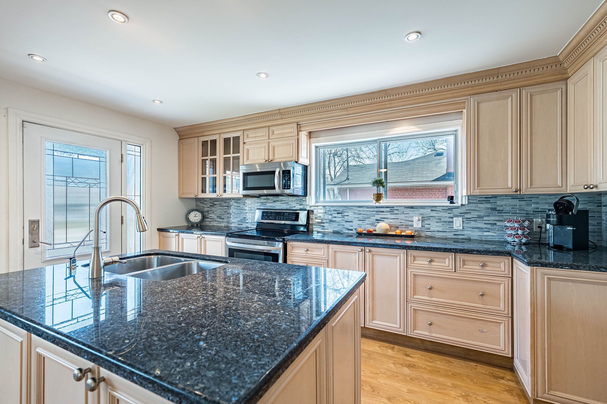 • Custom kitchen with quartz countertops and spacious center island for gatherings.