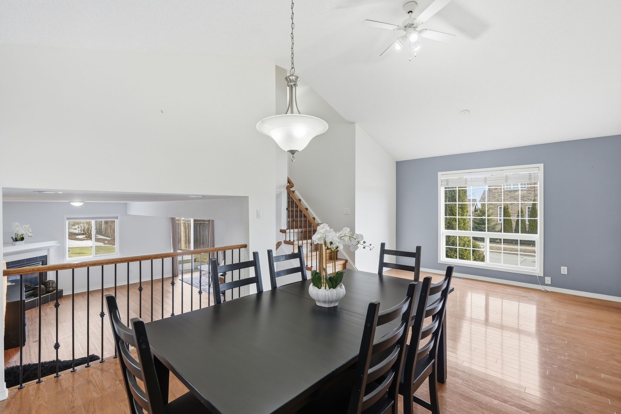 • Practical layout with hardwood floors and cathedral ceiling in the dining room.